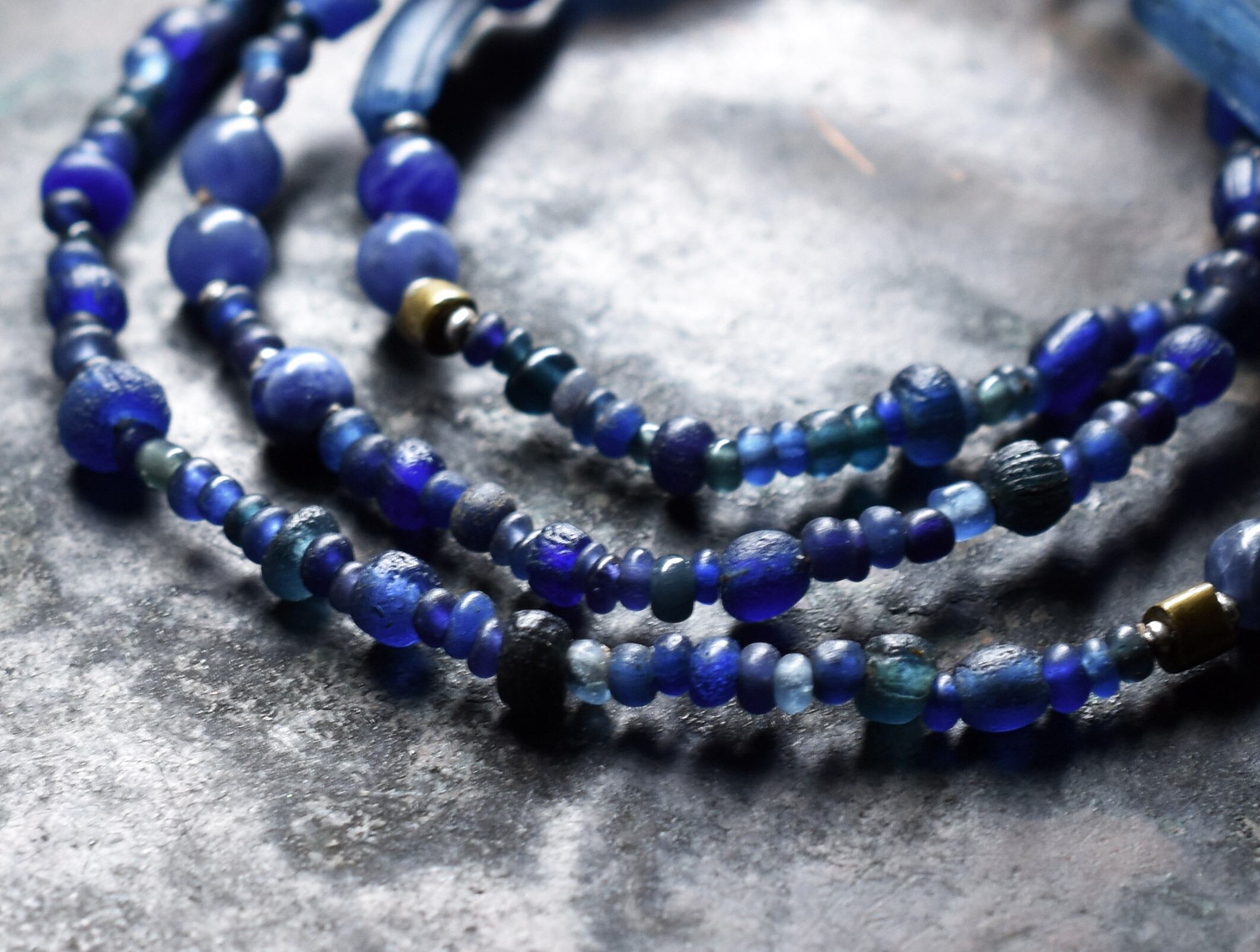 ローマングラスと発掘ビーズ、ソーダライトのオールブルーネックレス