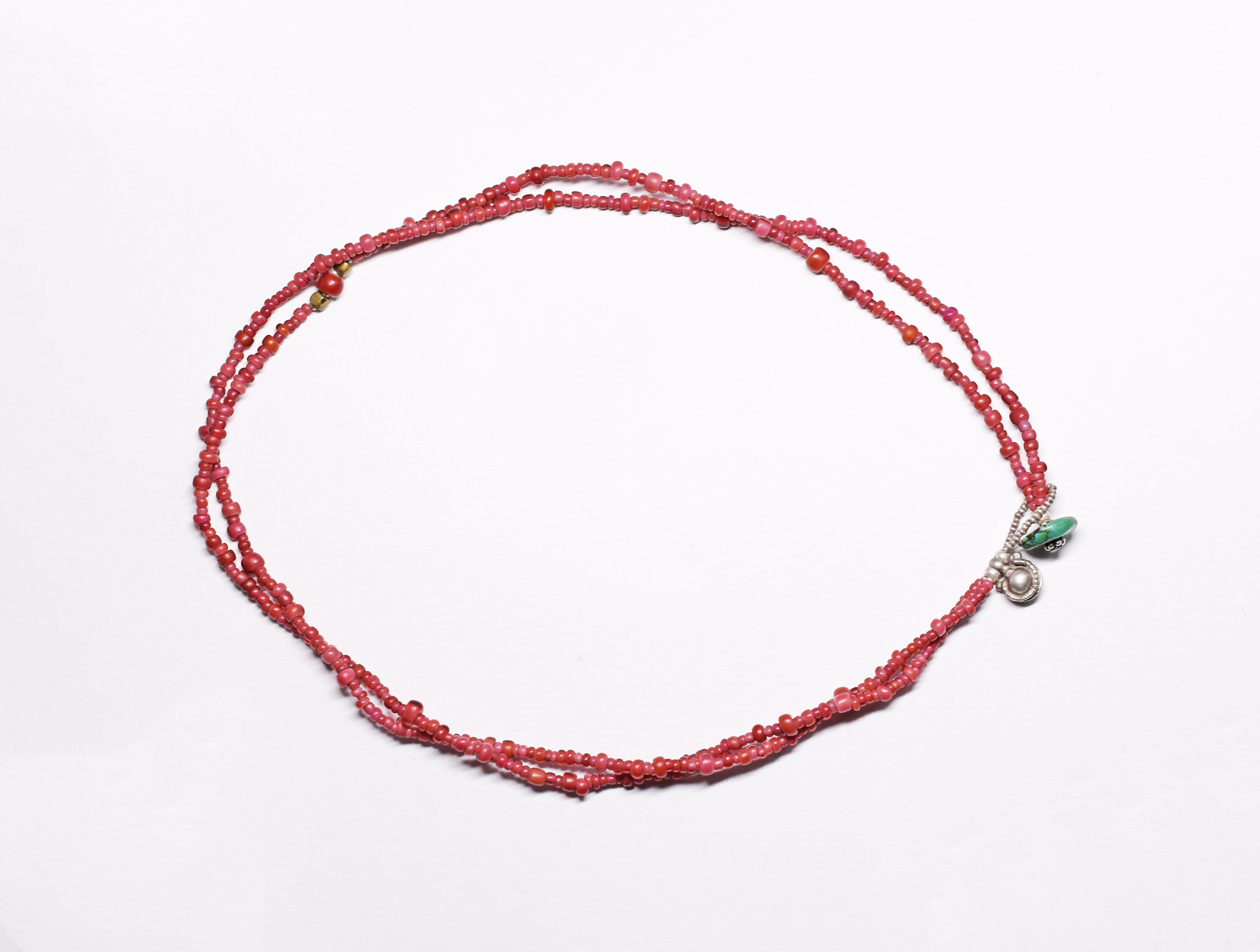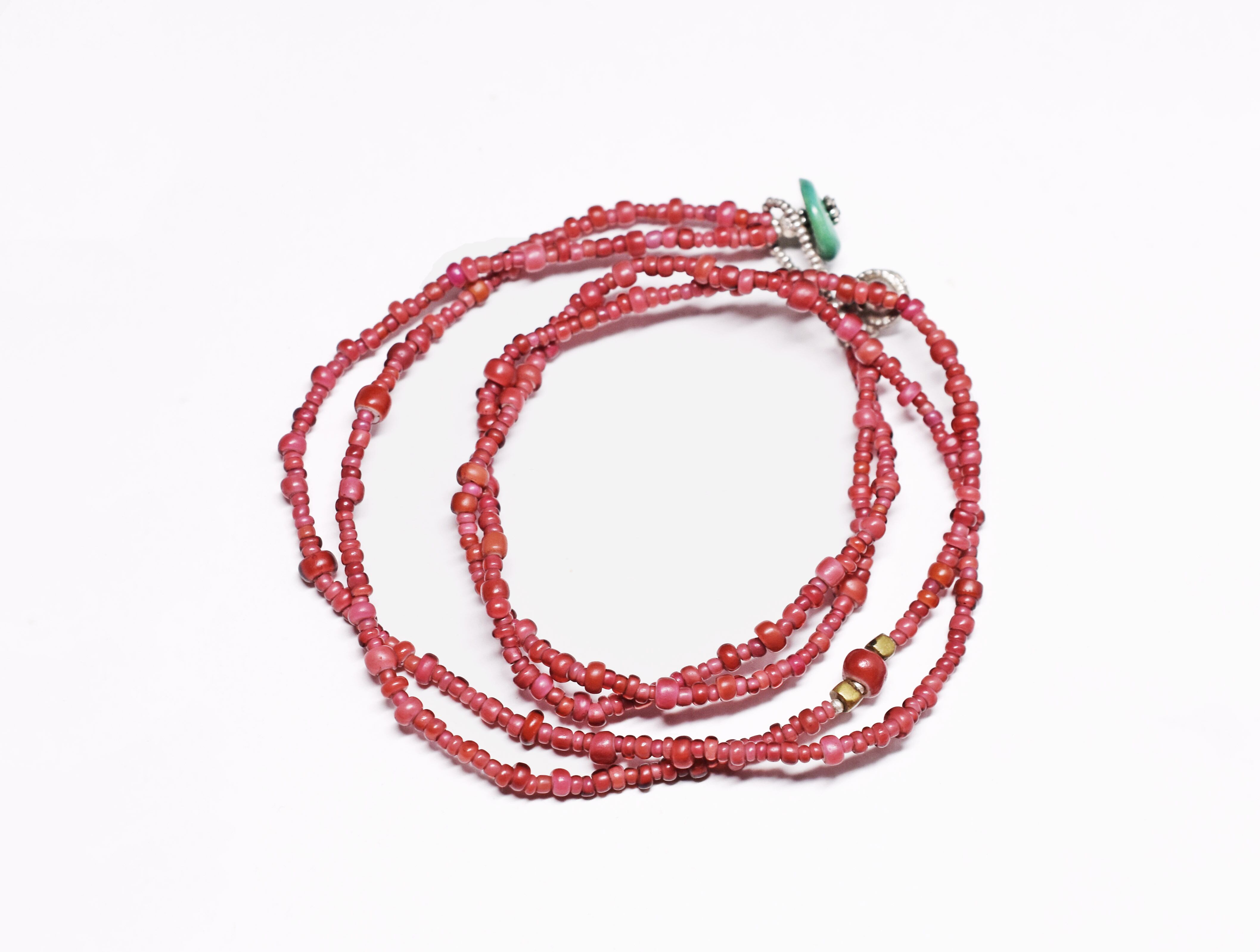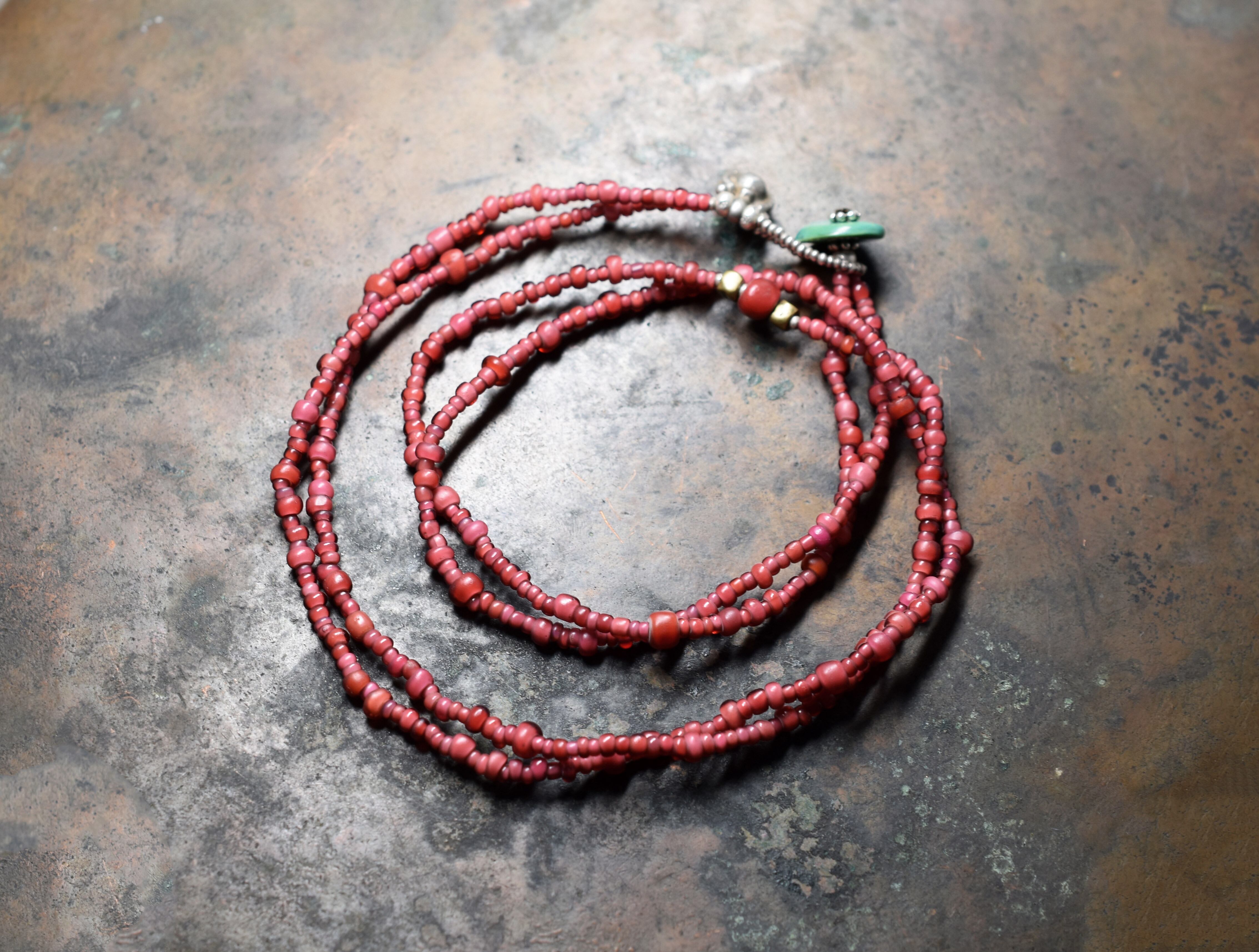 渋いピンク色のビーズはホワイトハーツと呼ばれるアンティークビーズです。芯(ハート)部分が白いことからこう呼ばれています。こちらは19~20世紀頃のベネチア産のビーズです。特にこちらは金で赤色を発色させているため、金赤ホワイトハーツと呼ばれる希少なビーズです。
