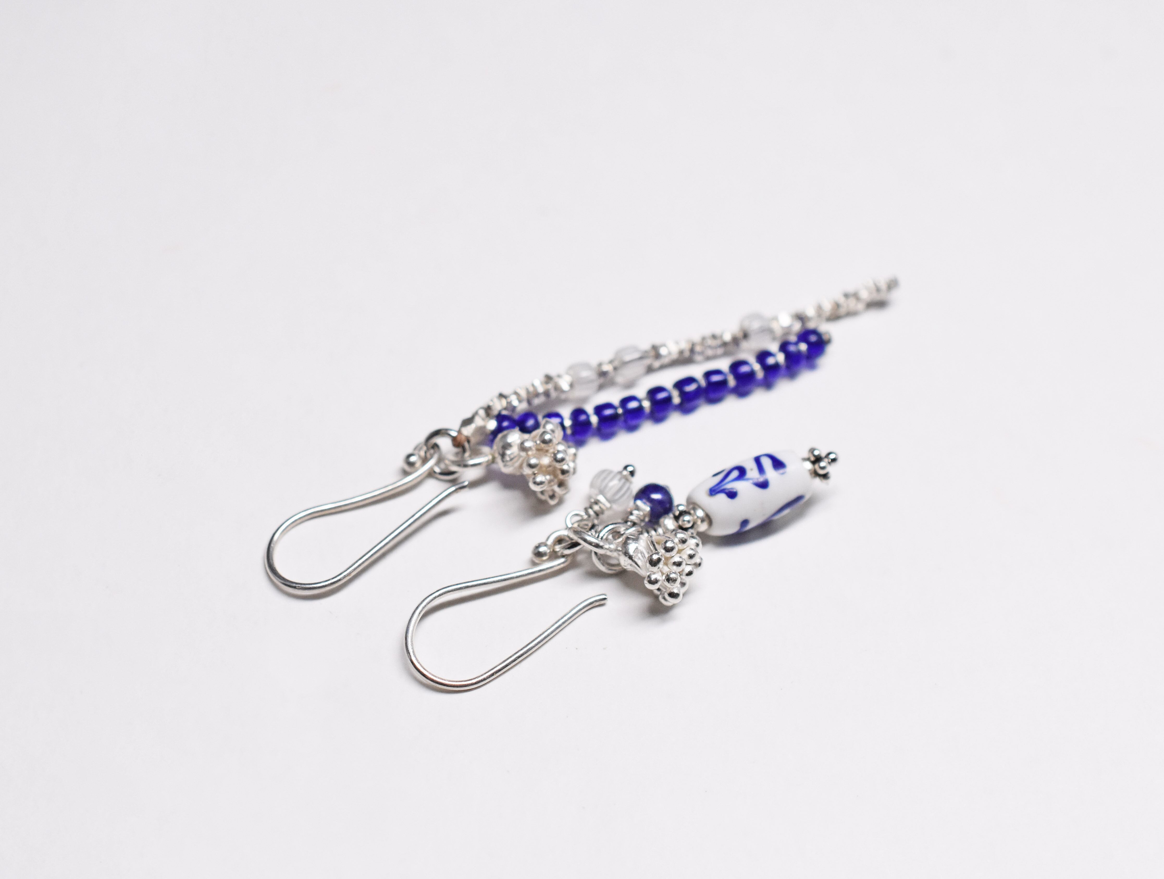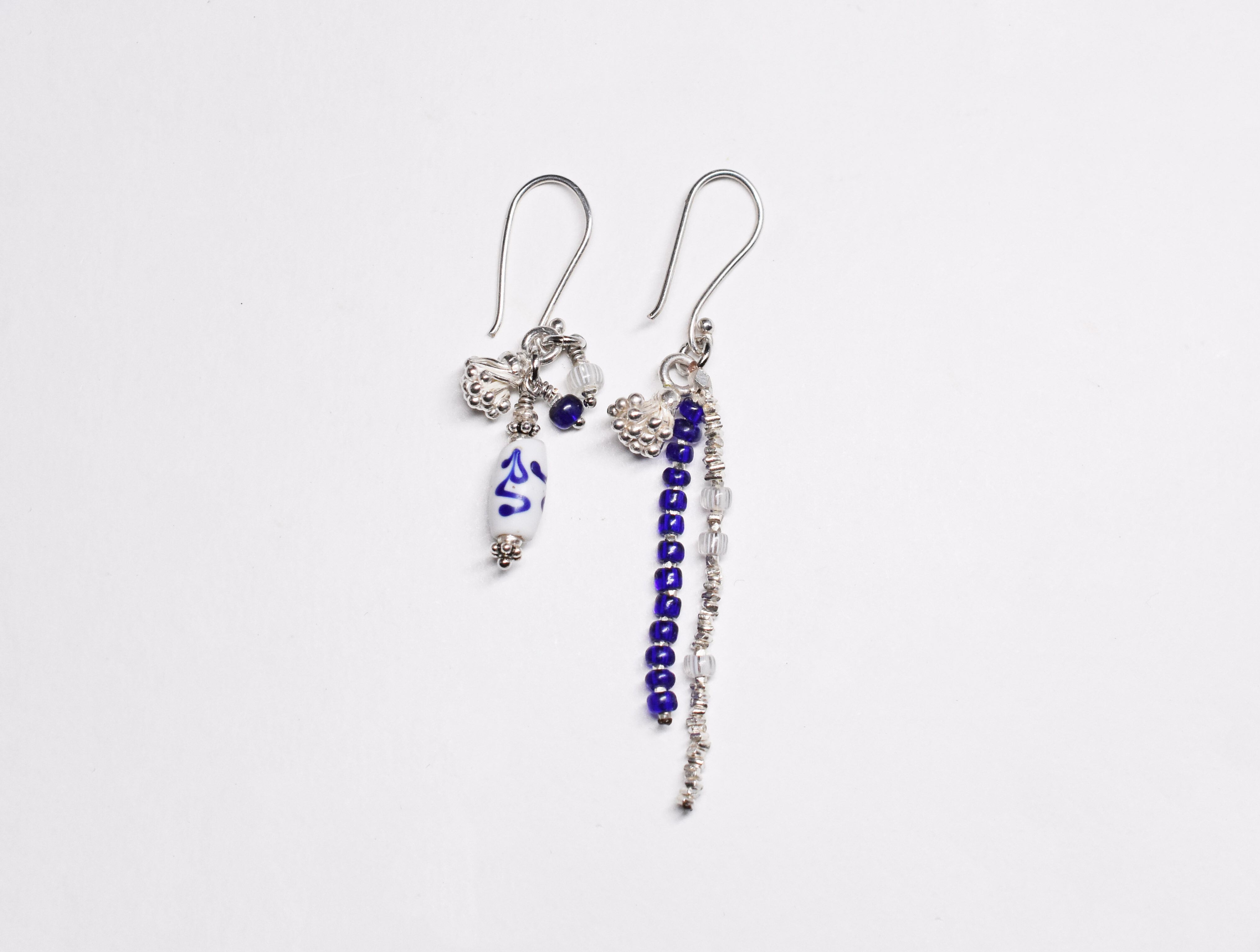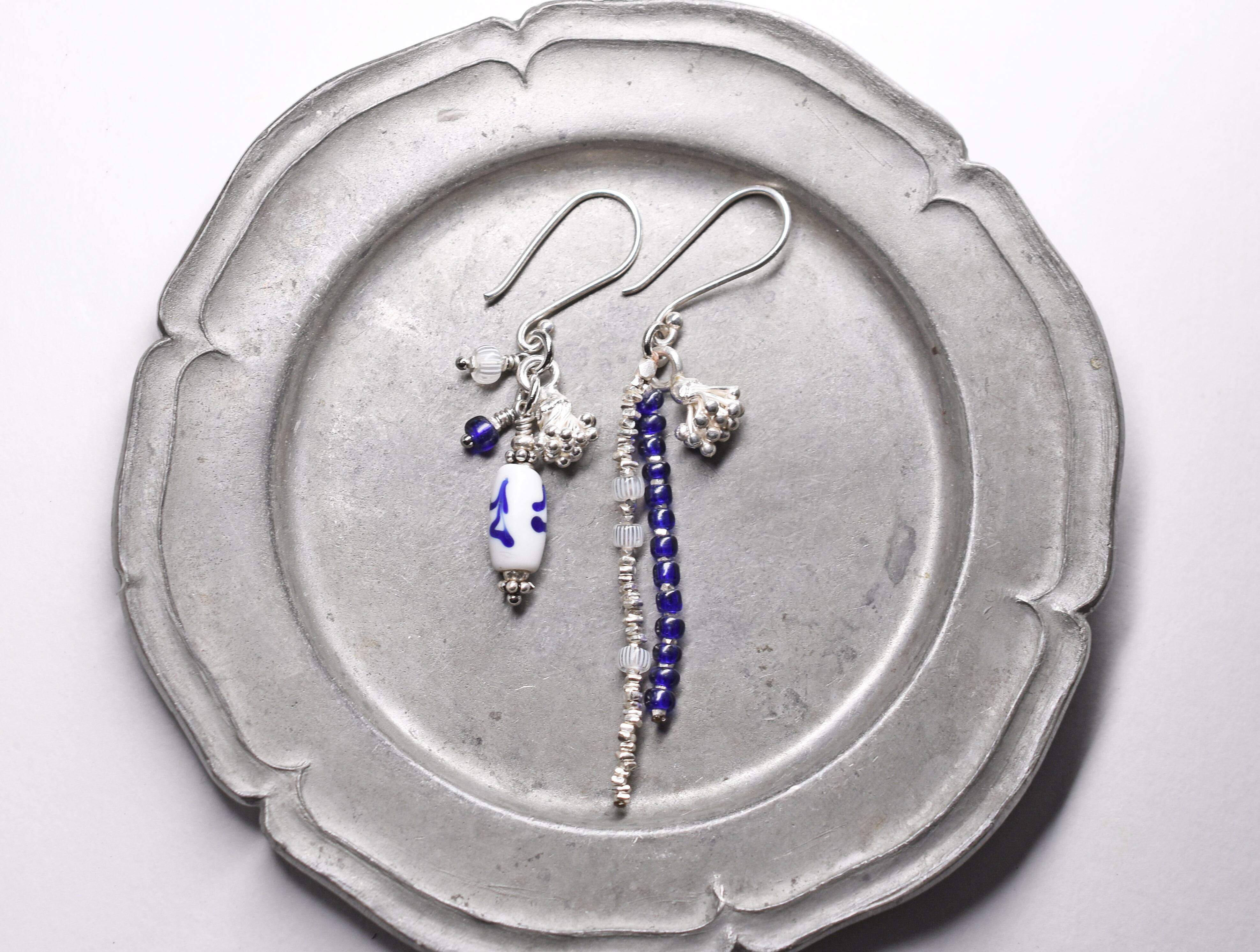 ダッチデルフトとカレンシルバーのアンティークビーズのアンシメトリーピアス
