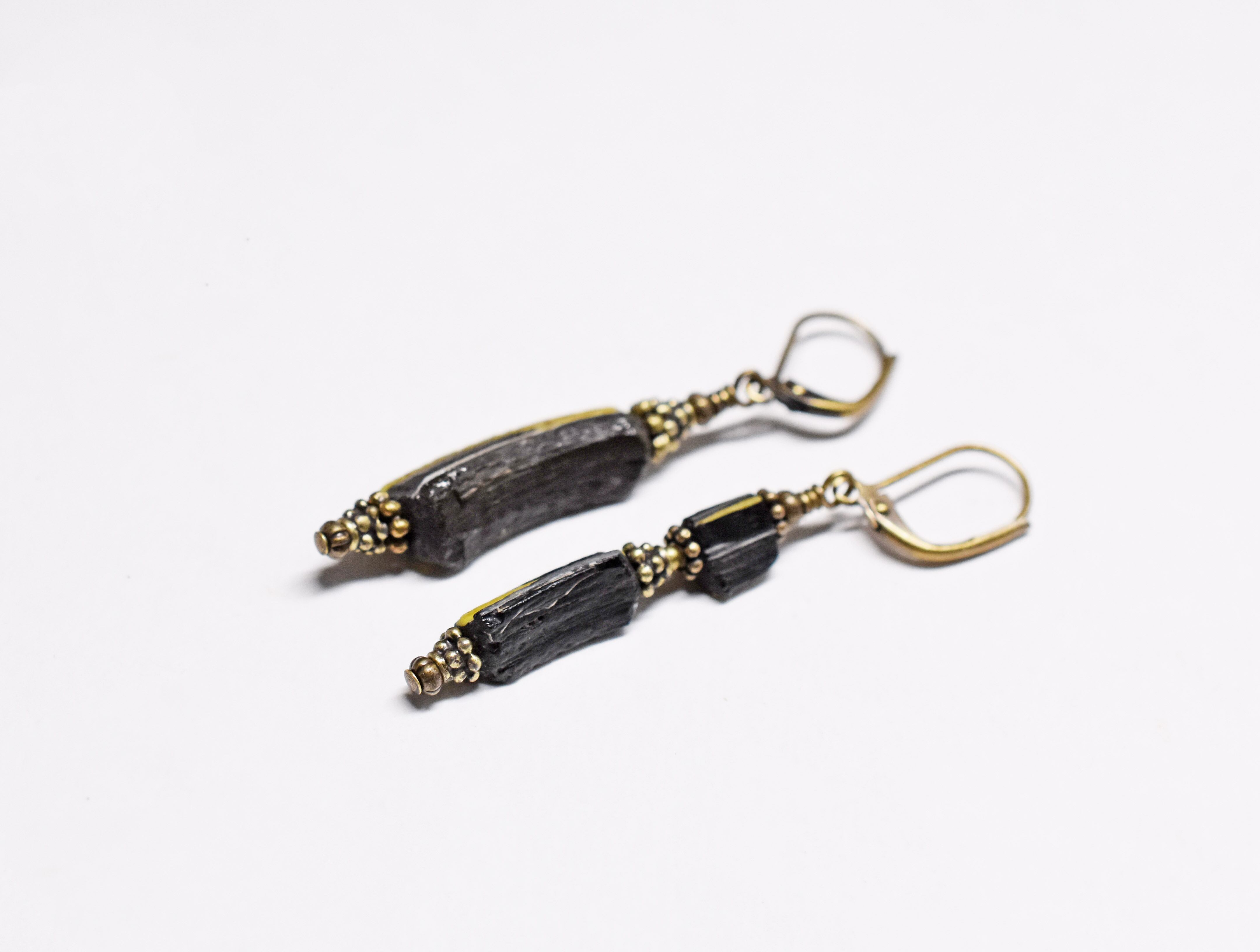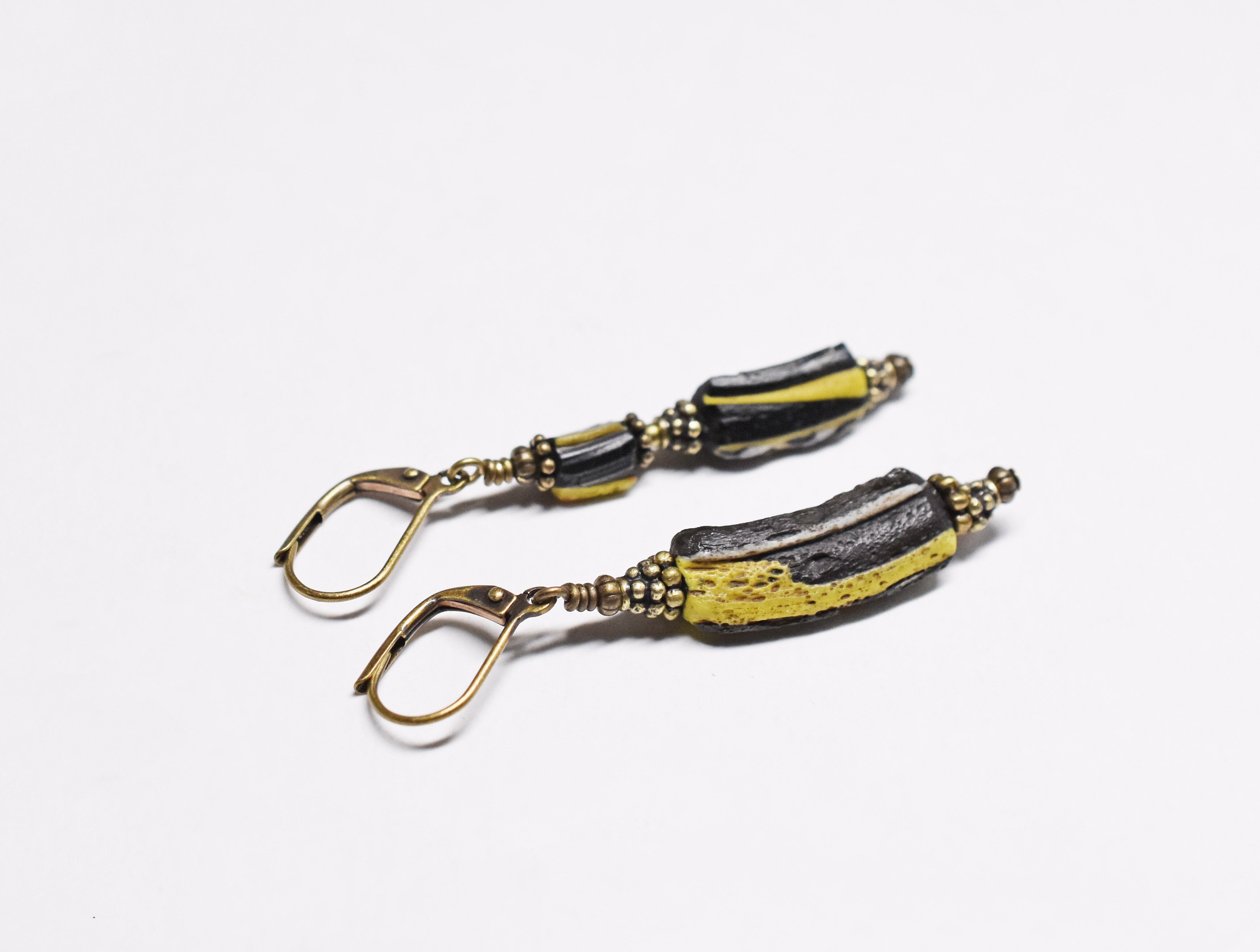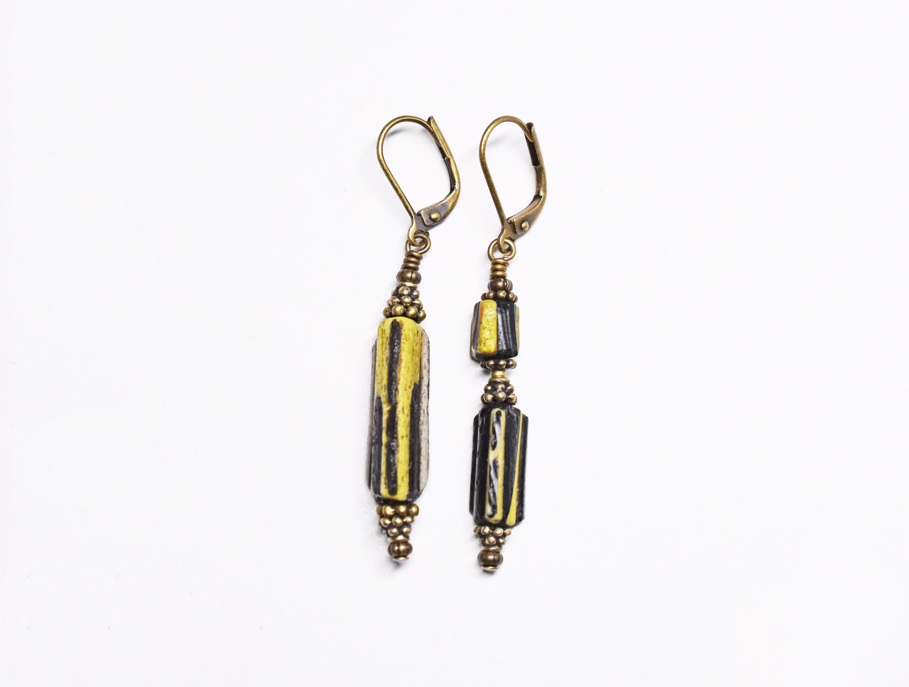 モザイク模様ローマングラスとイエロー&ブラックアンシメトリーピアス