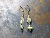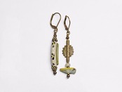 モザイク模様が施されたローマングラスと、鳥型のローマングラスビーズ、民族のパーツを繋いだアンシメトリーなピアスです。