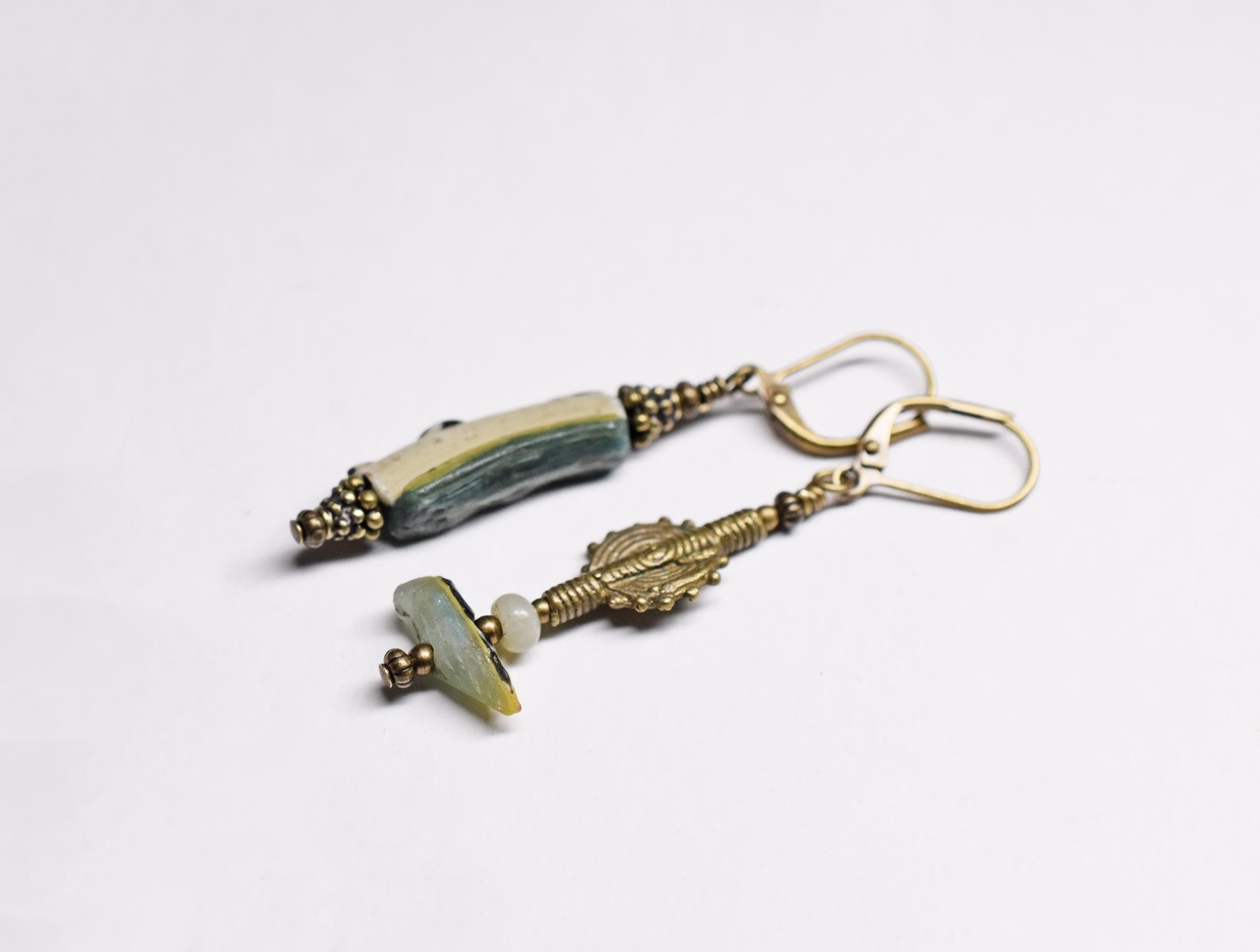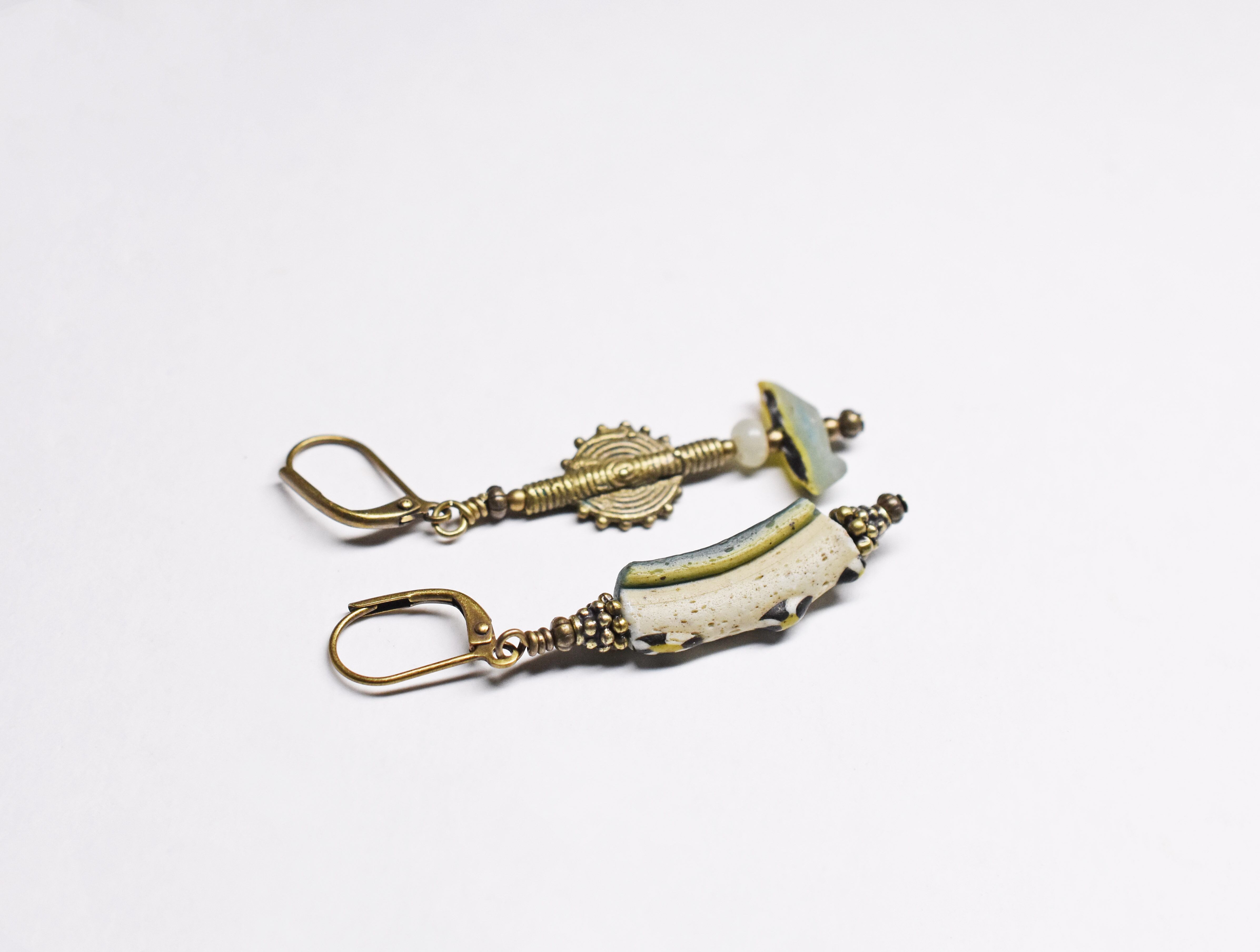 モザイク模様ローマングラスと鳥ビーズ、民族パーツのアンシメトリーピアス