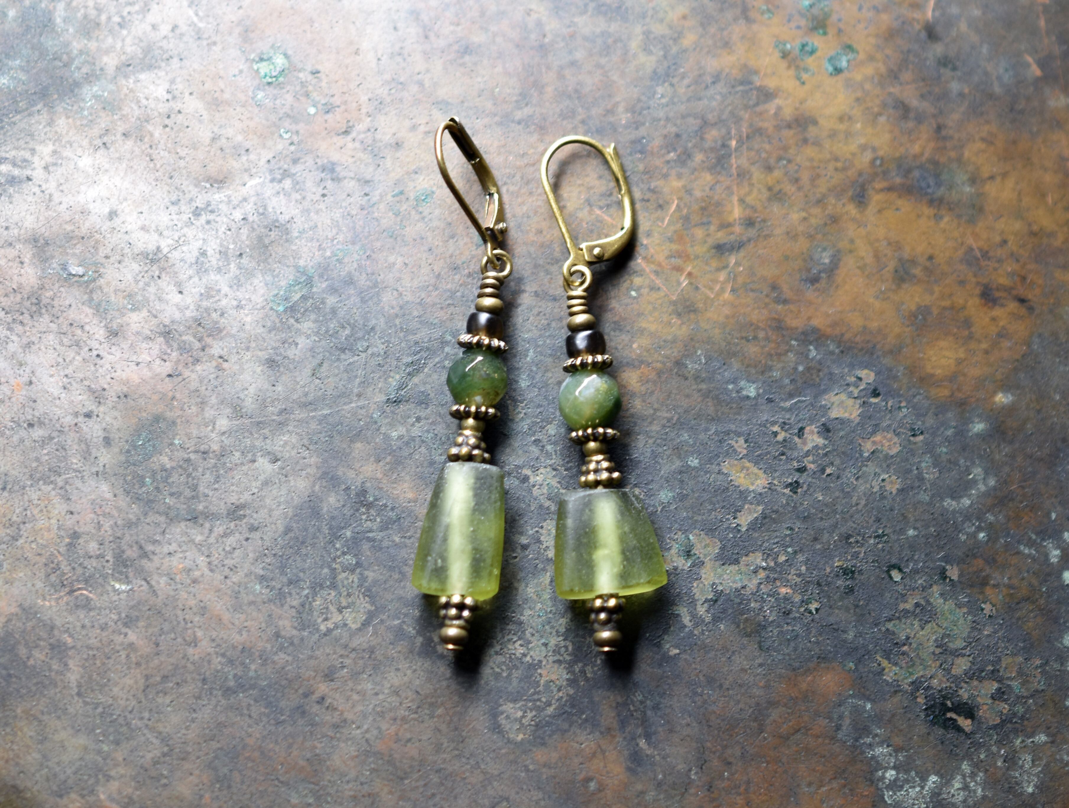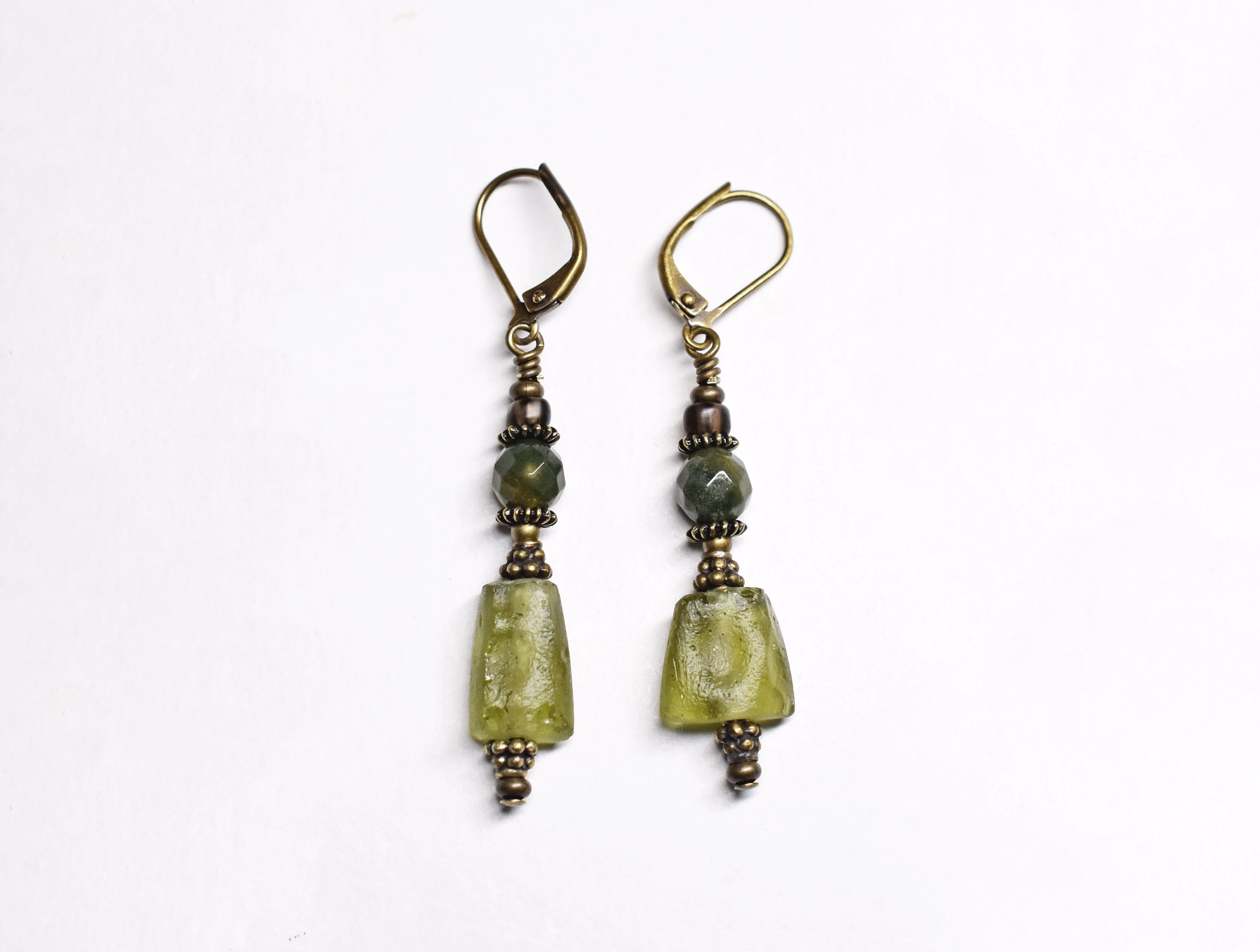 カーキ色ローマングラスと、インディアンアゲートのピアス