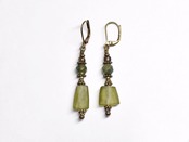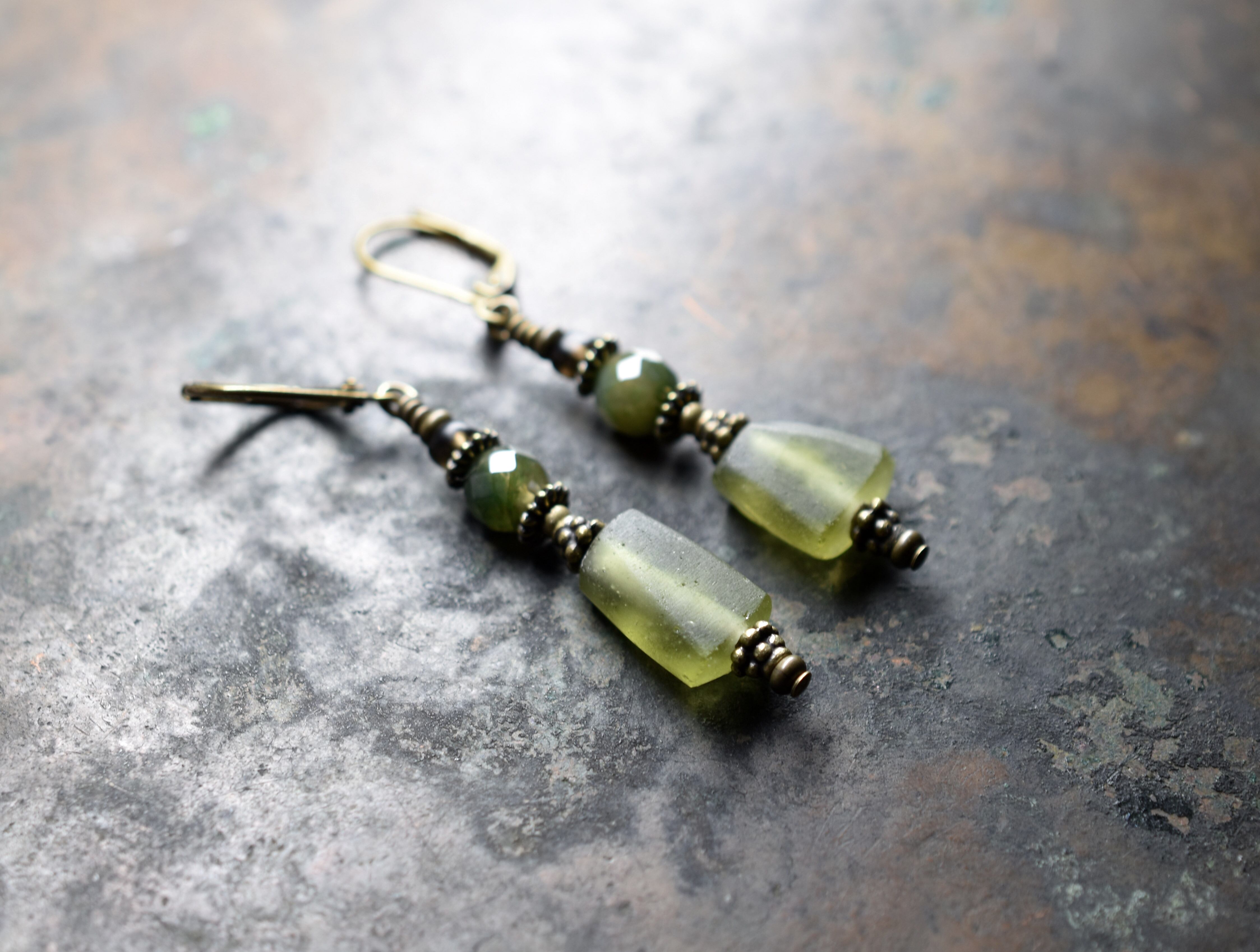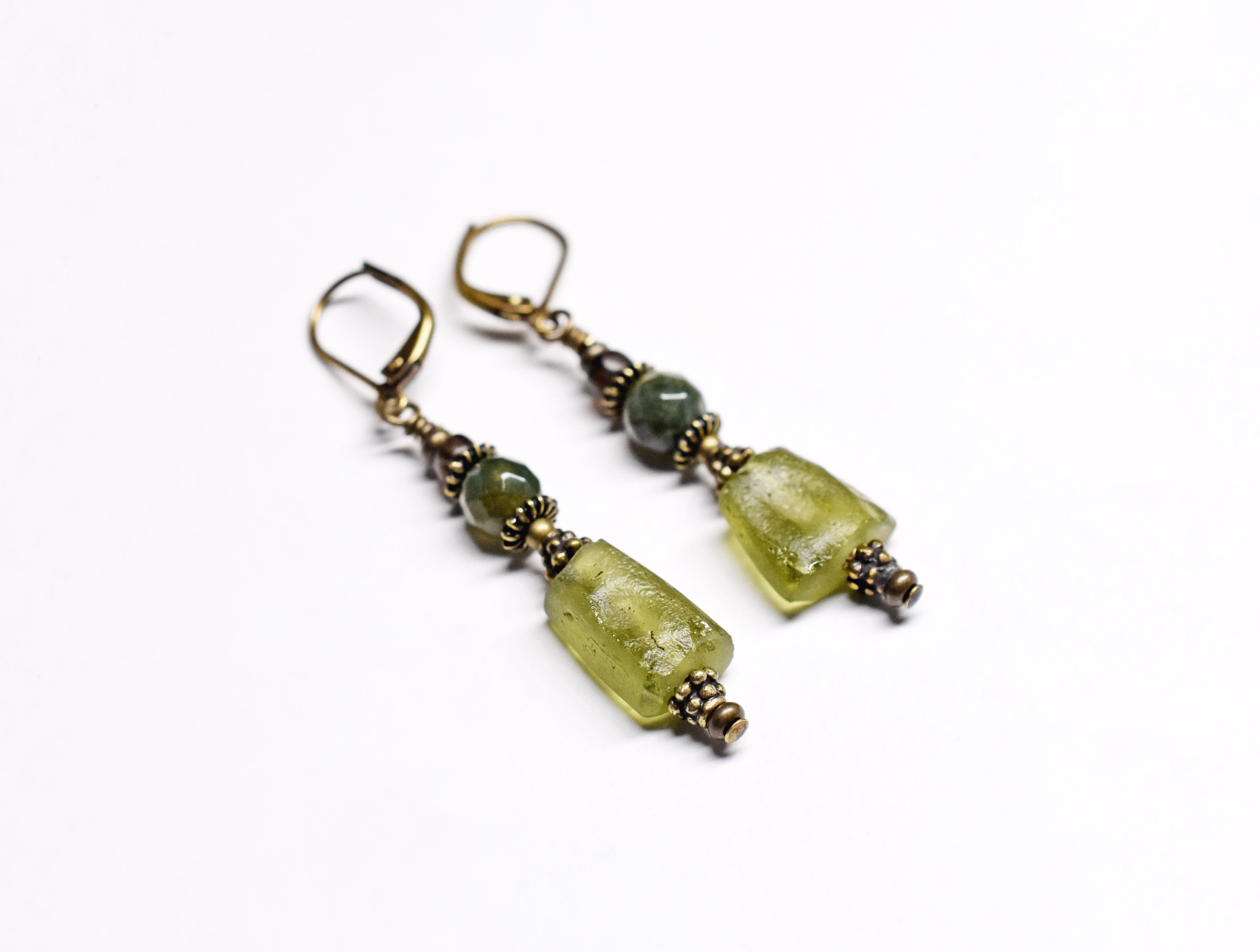ローマングラスと、インディアンアゲート、ジャワビーズを繋いだピアスです。