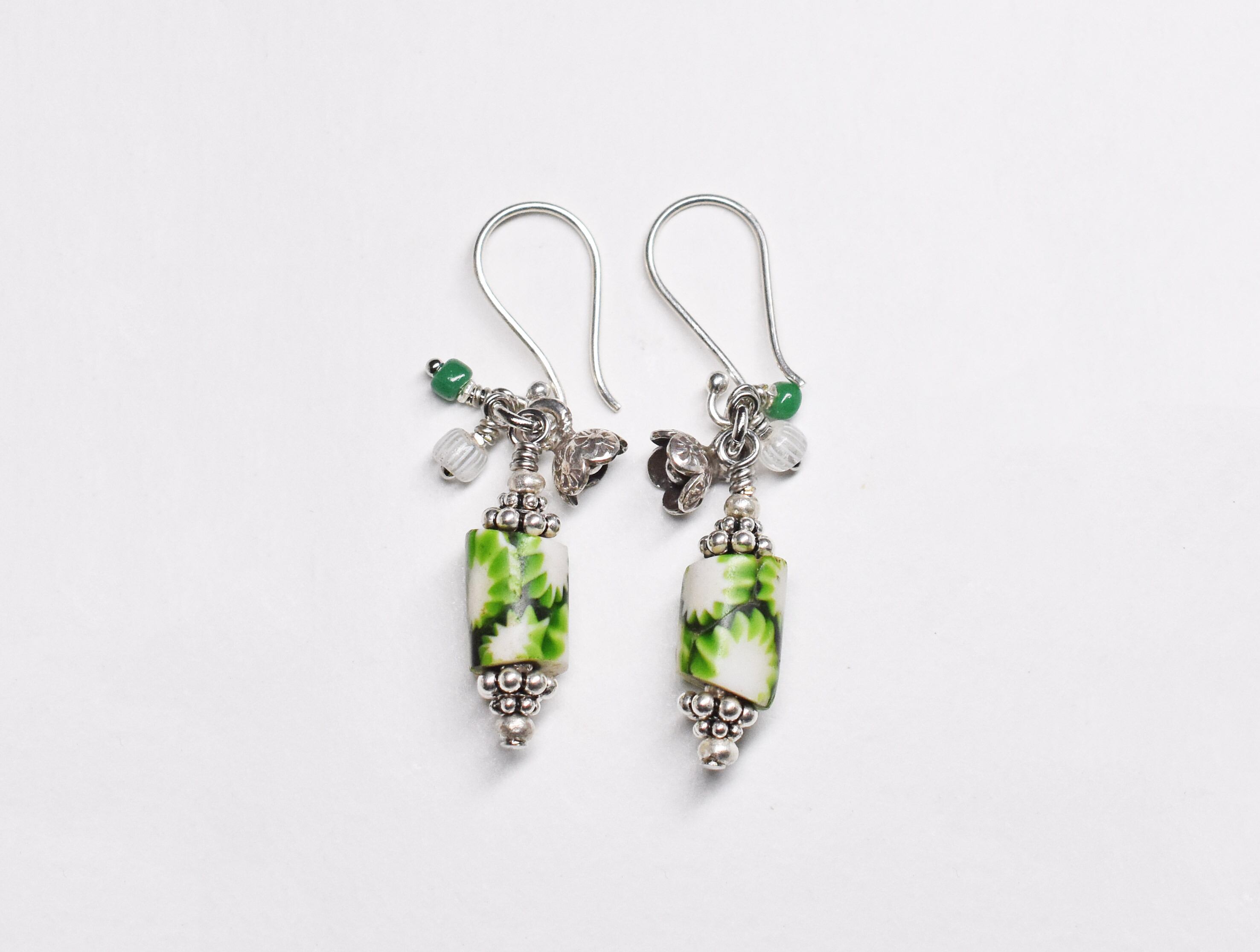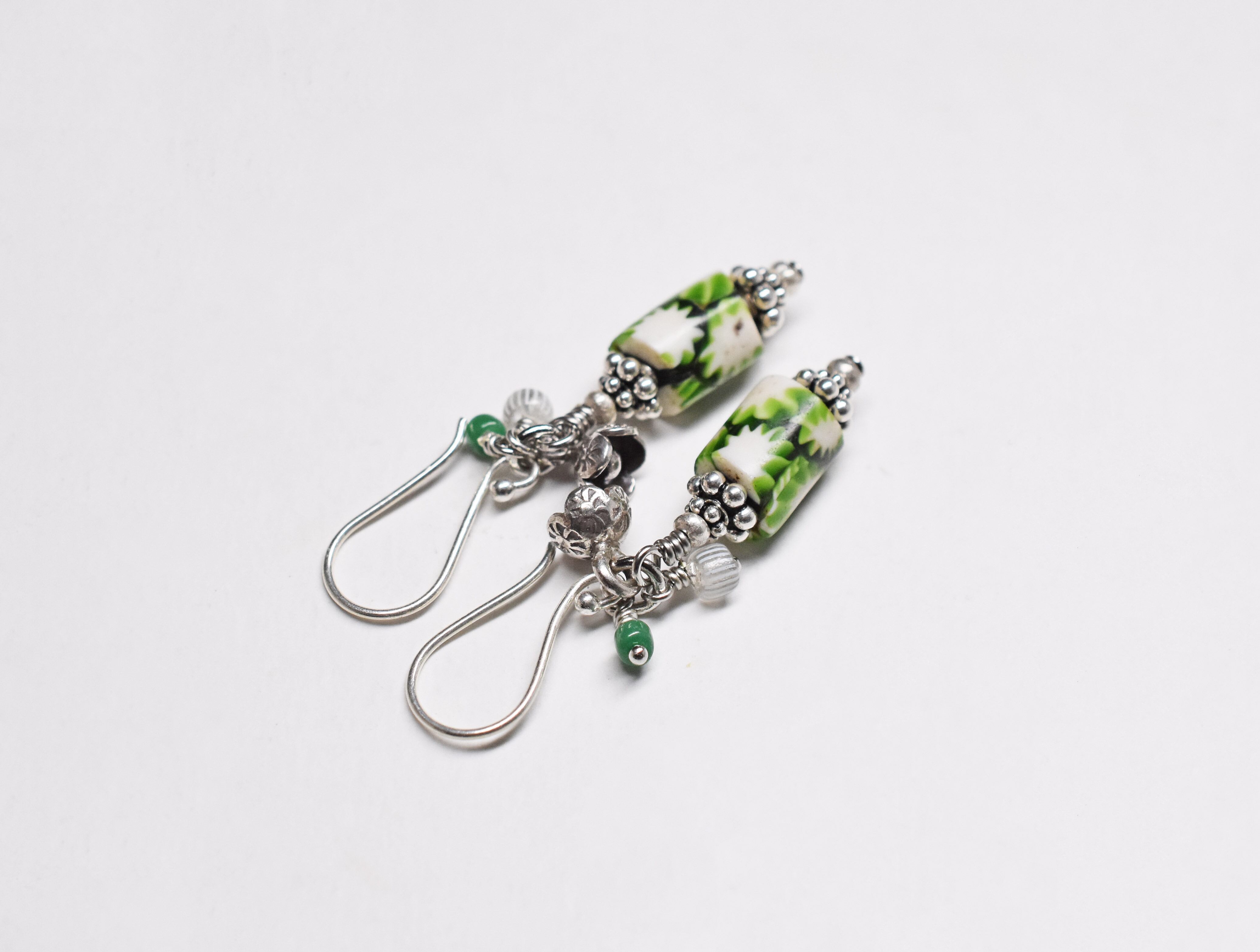 グリーン&ホワイトミルフィオリと小さなお花カレンシルバーのピアス