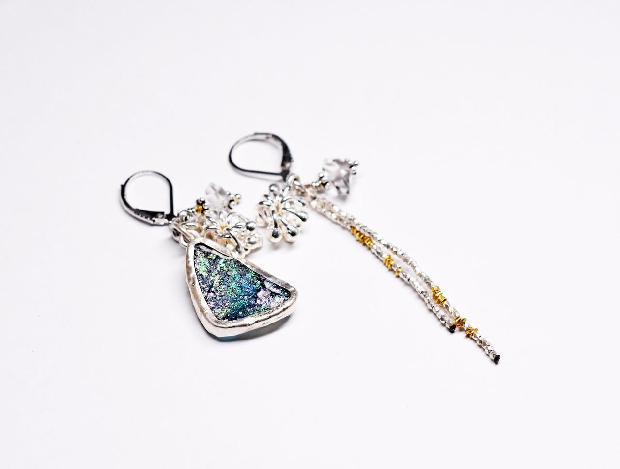 煌めくローマングラスとしゃらりとしたカレンシルバー、ハーキマーダイヤモンドのアンシメトリーピアス
