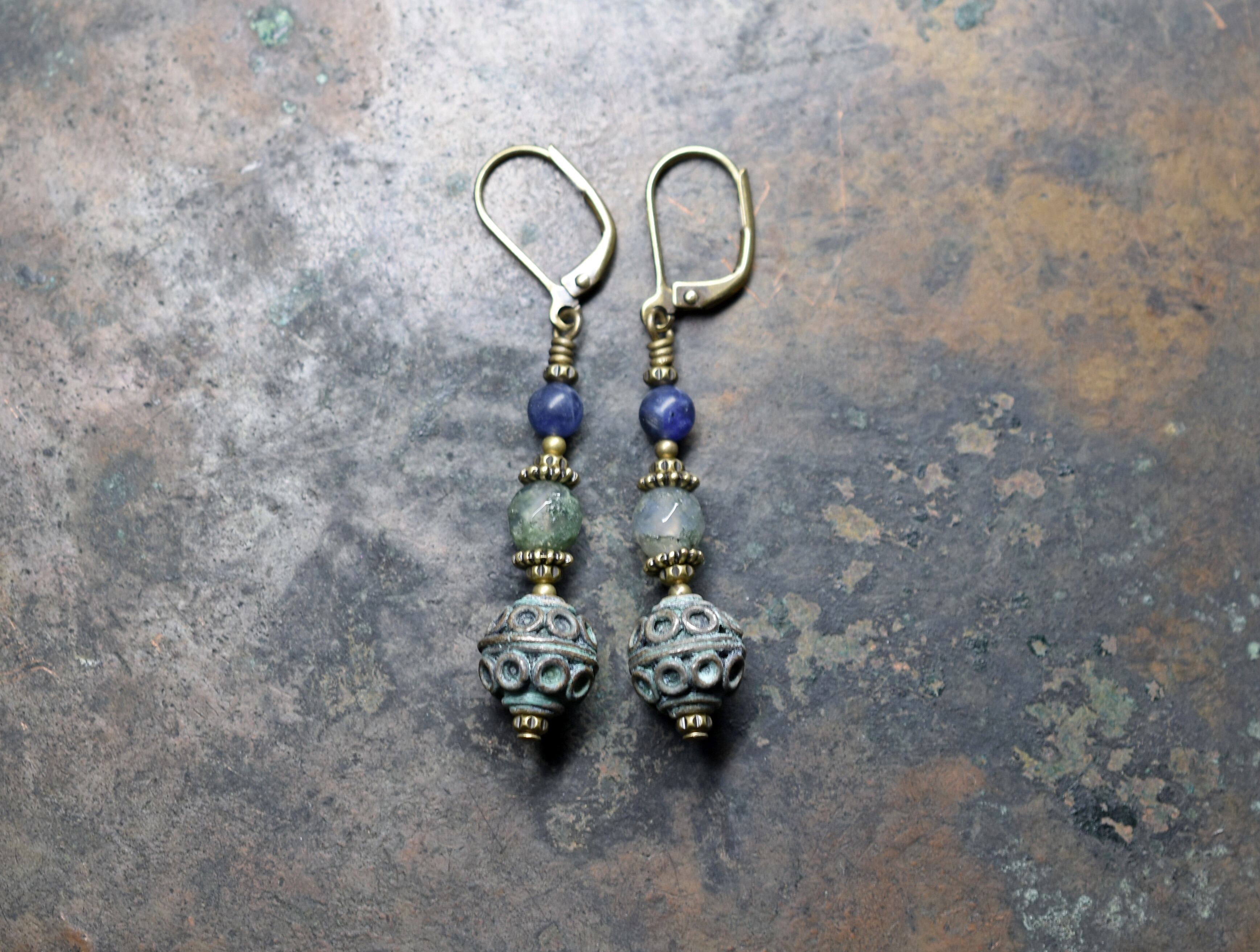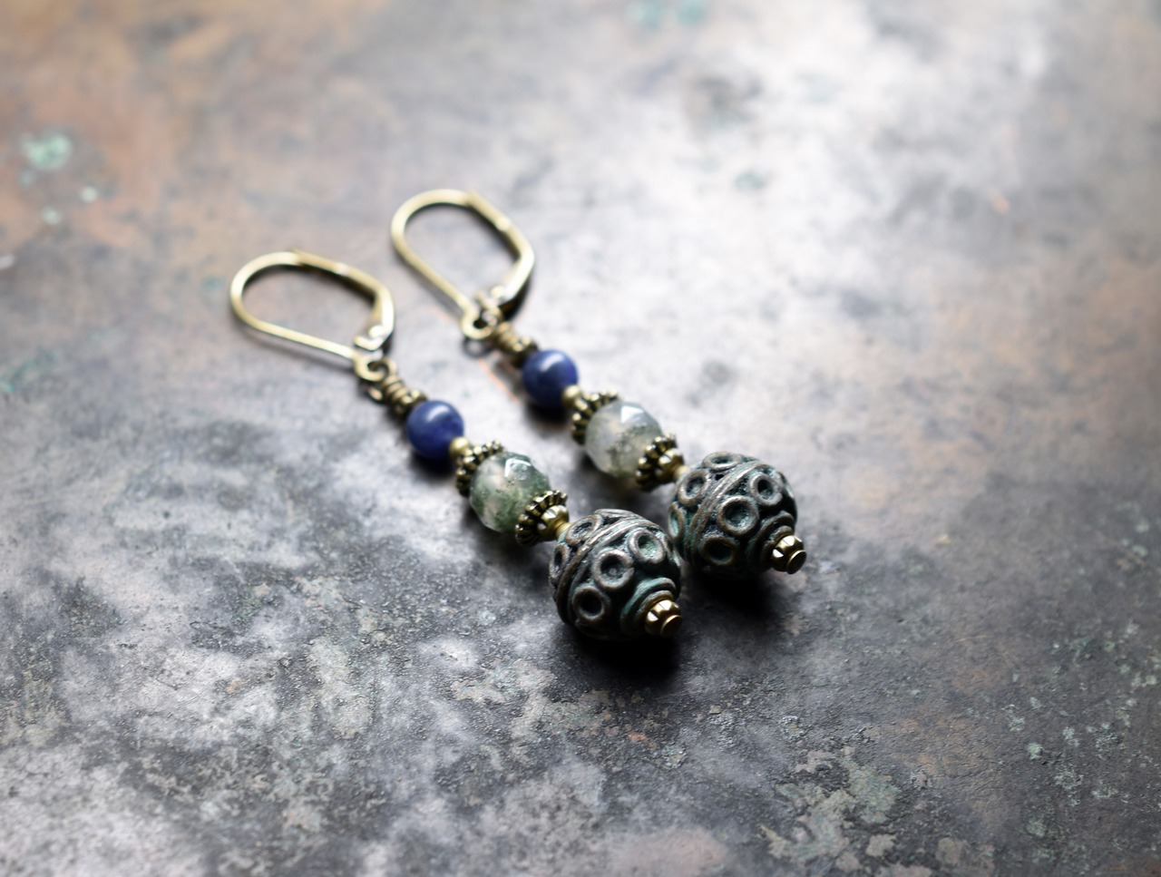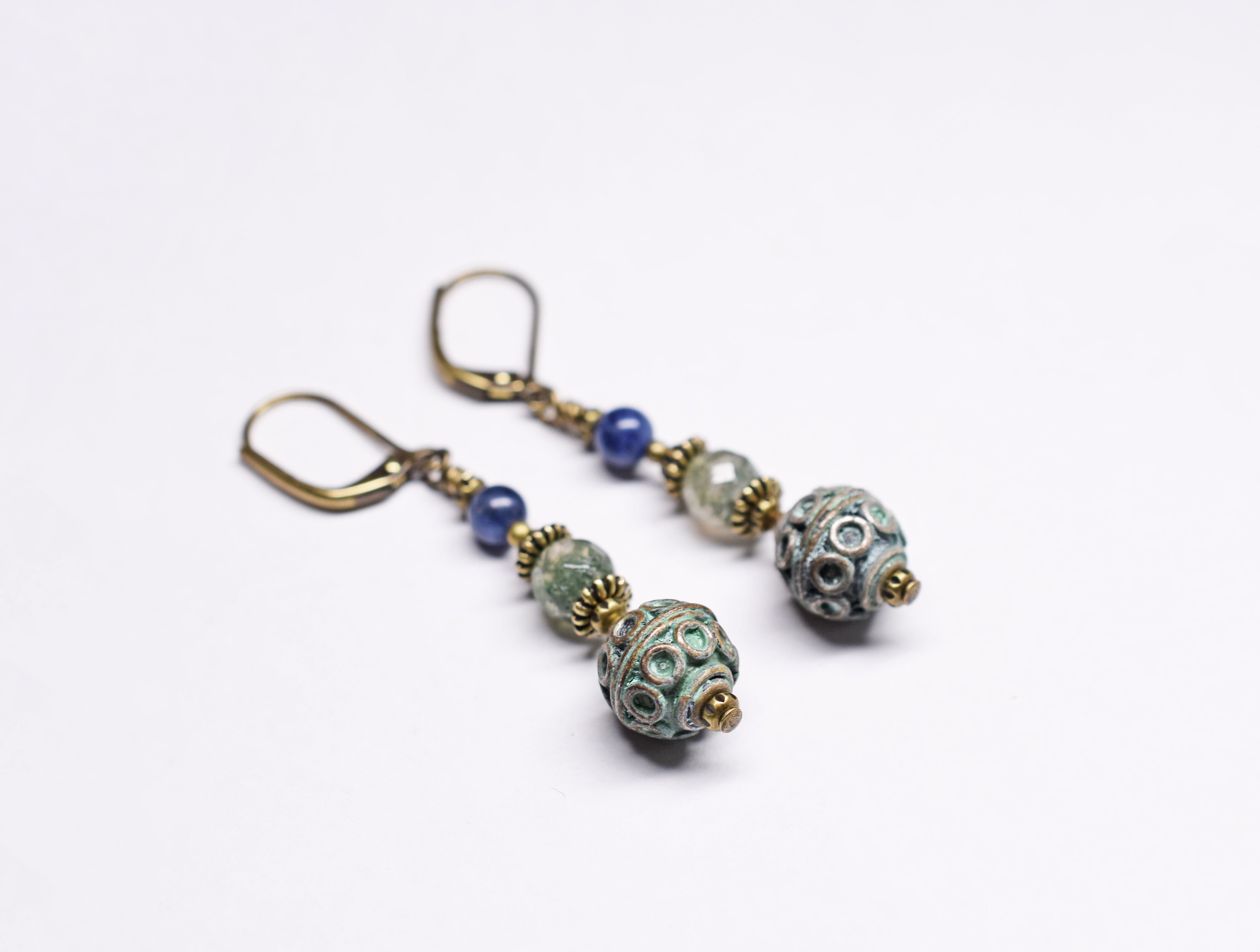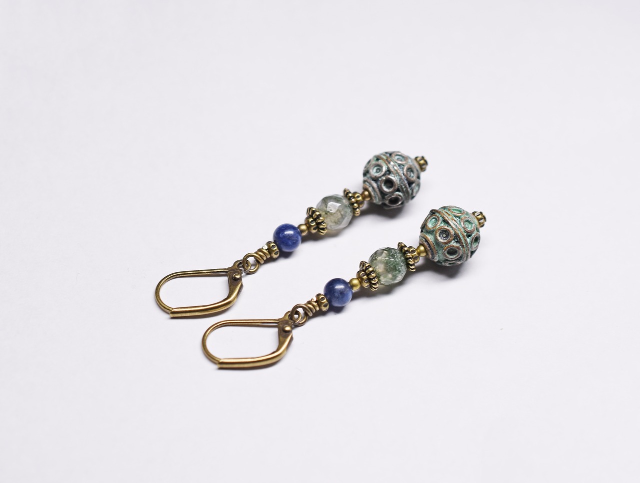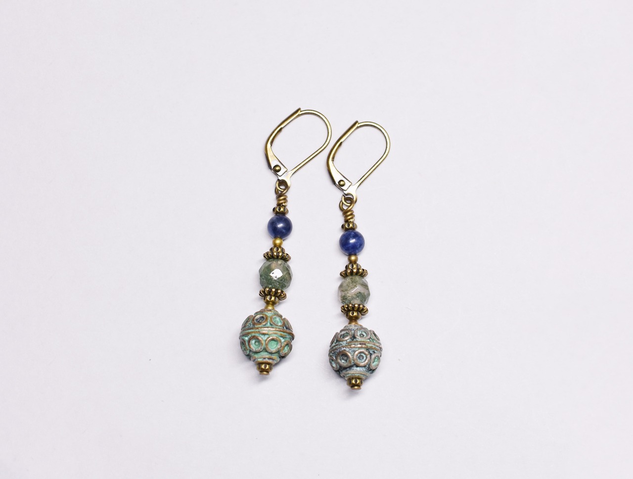 アフガニスタンのメタルパーツと、インディアンアゲート、ソーダライトを繋いだピアスです。