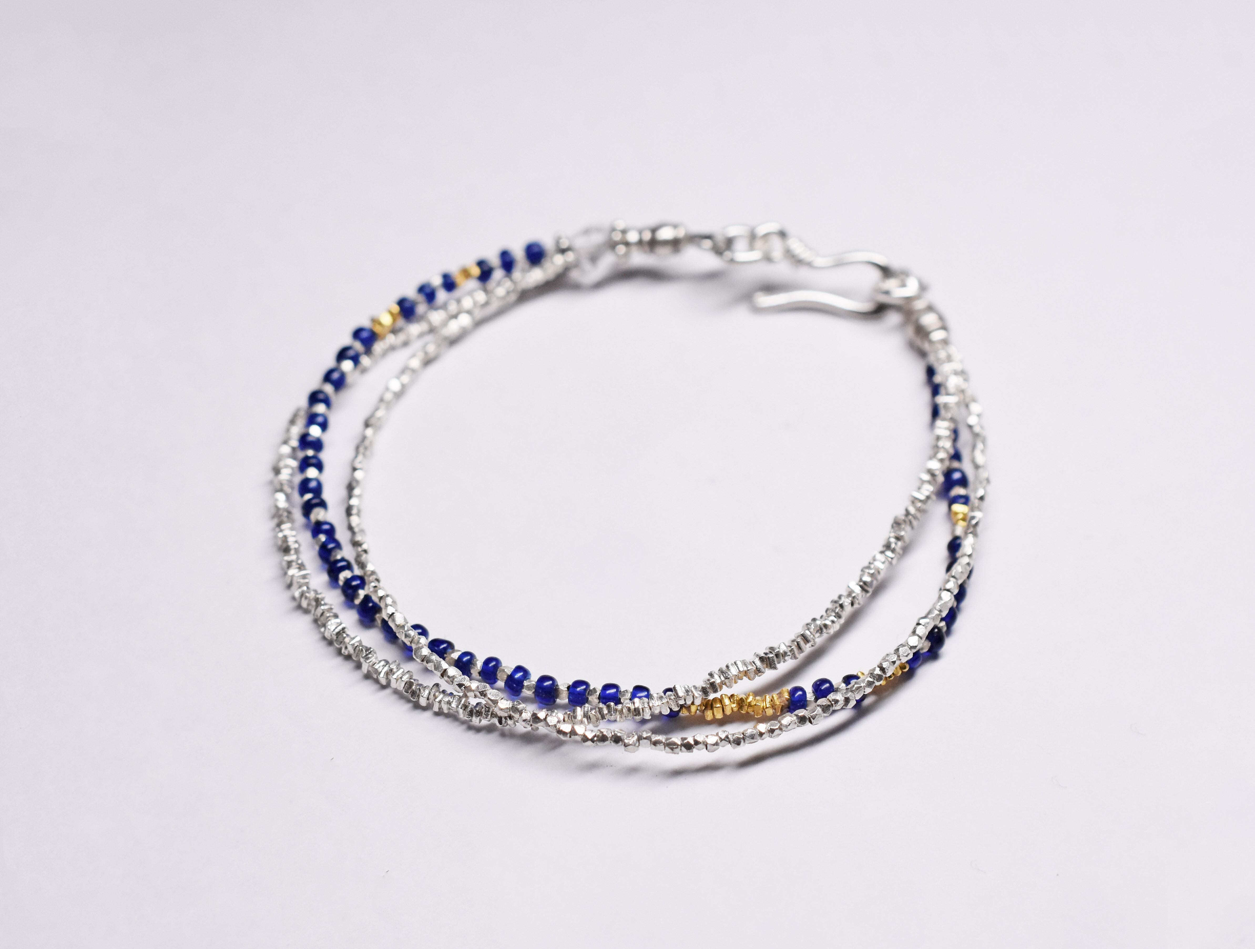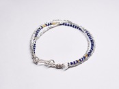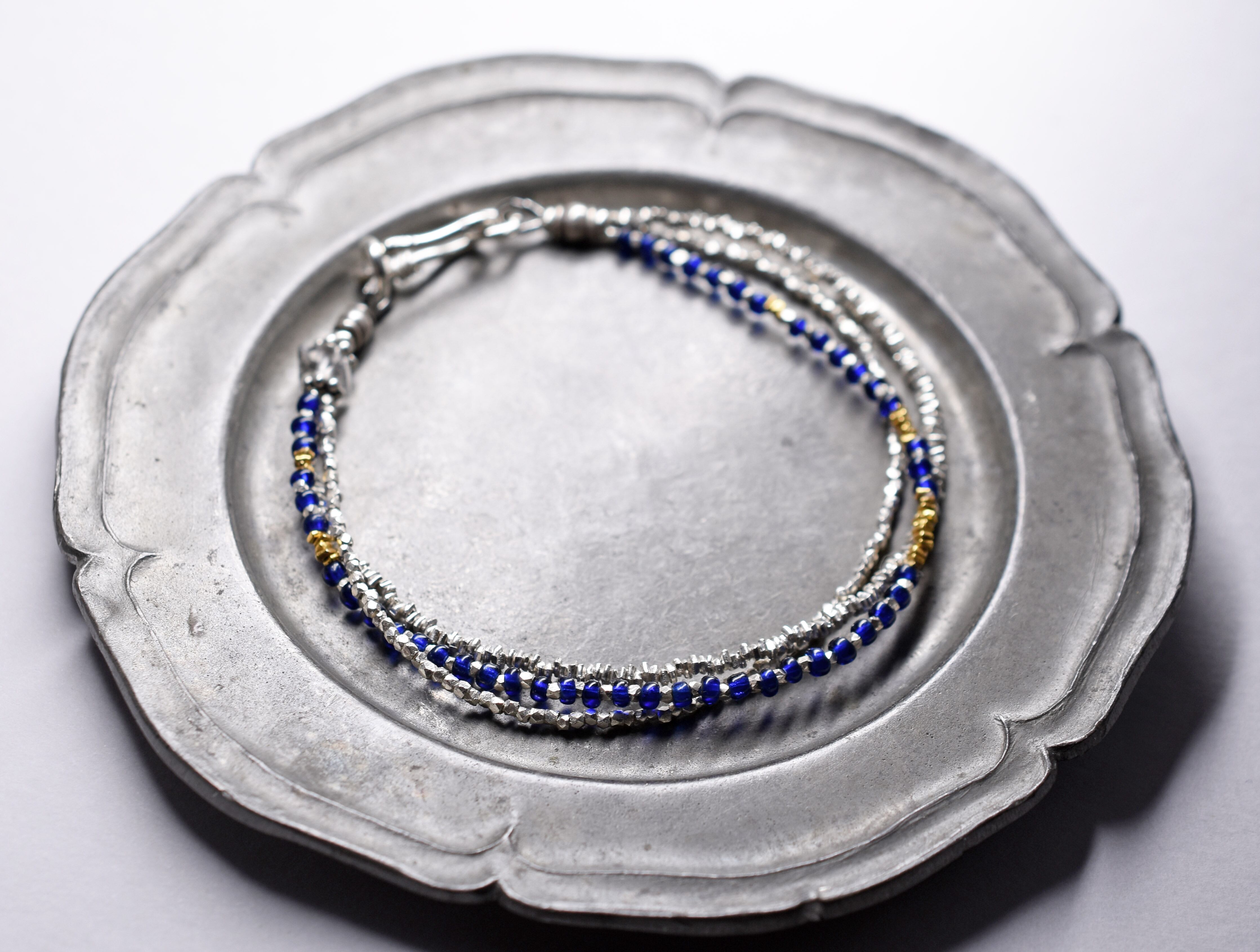 瑠璃色のアンティークビーズ、小さなカレンシルバービーズを3連に繋ぎ、一粒はーきまダイヤモンドを入れたブレスです。