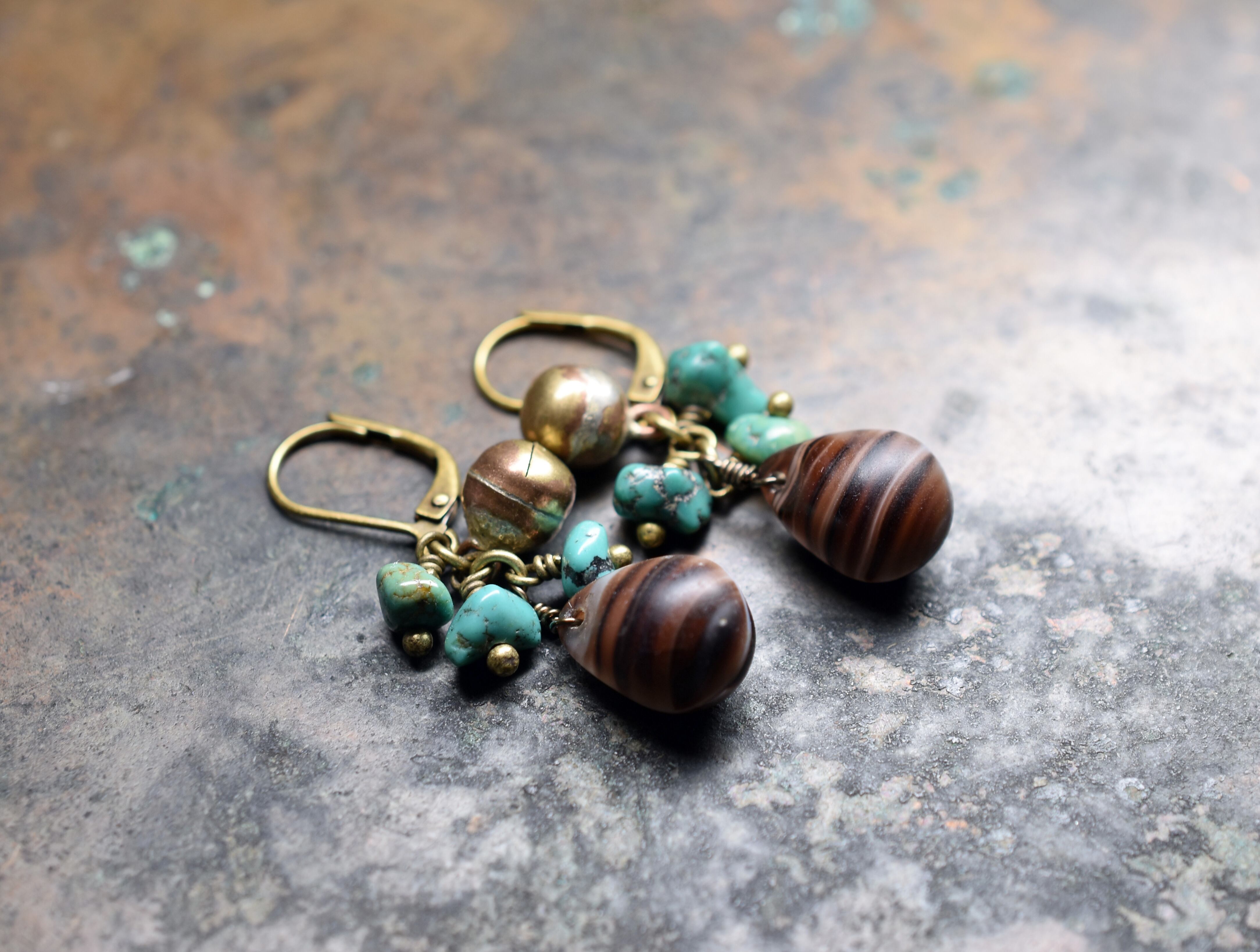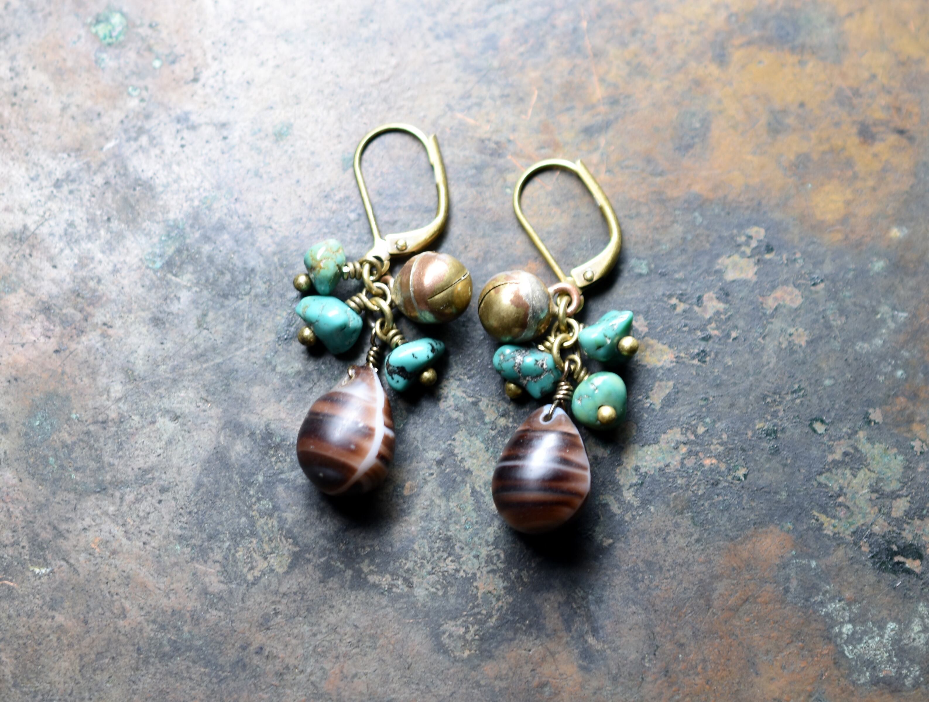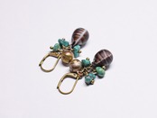 ウエディングビーズと呼ばれるボヘミアのアンティークビーズとターコイズ、鈴を繋いだピアスです。