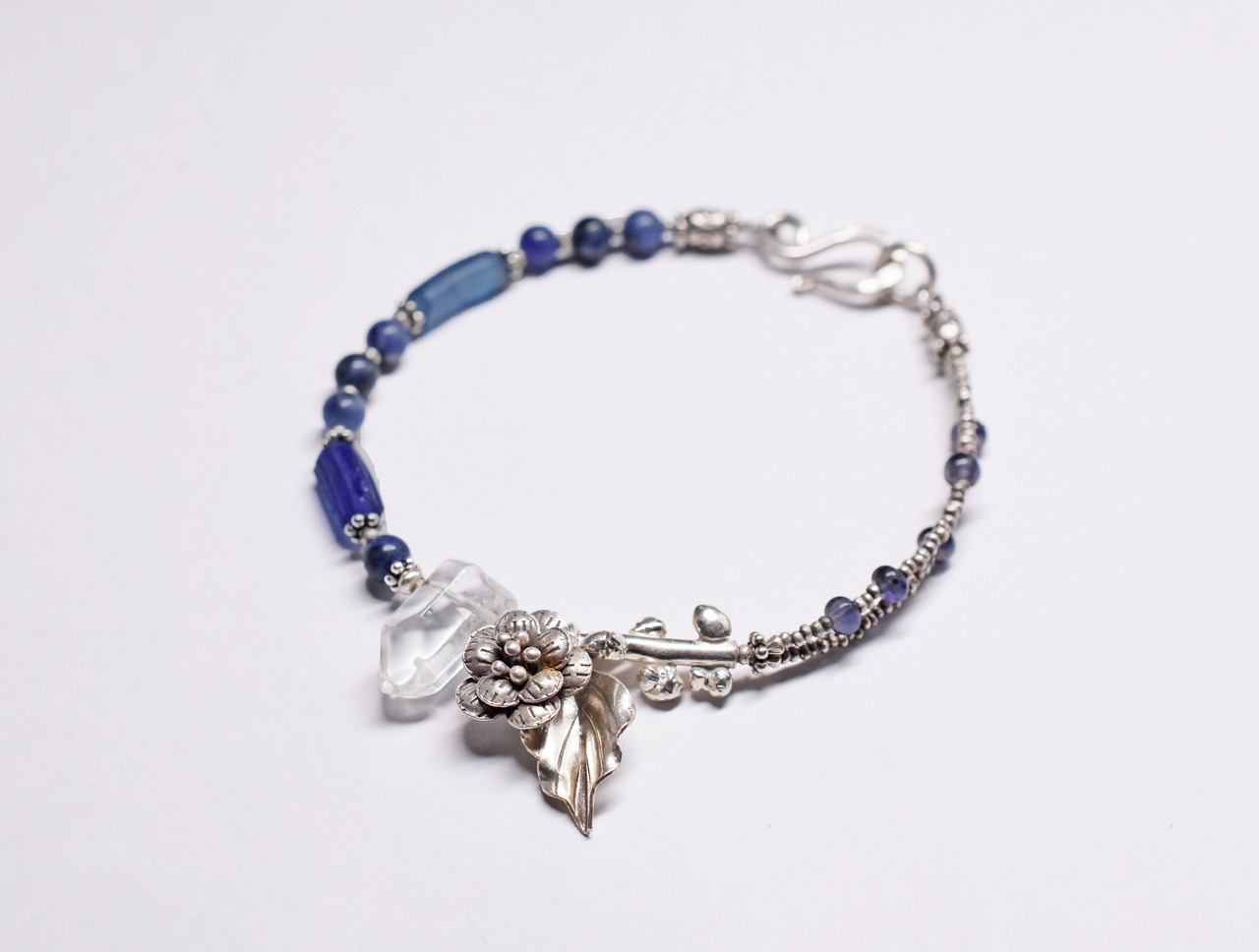 ヒマラヤ水晶、カレンシルバー、ローマングラス、ソーダ以来と等の天然石、ボタニカルなカレンシルバーを繋いだブレスです。
