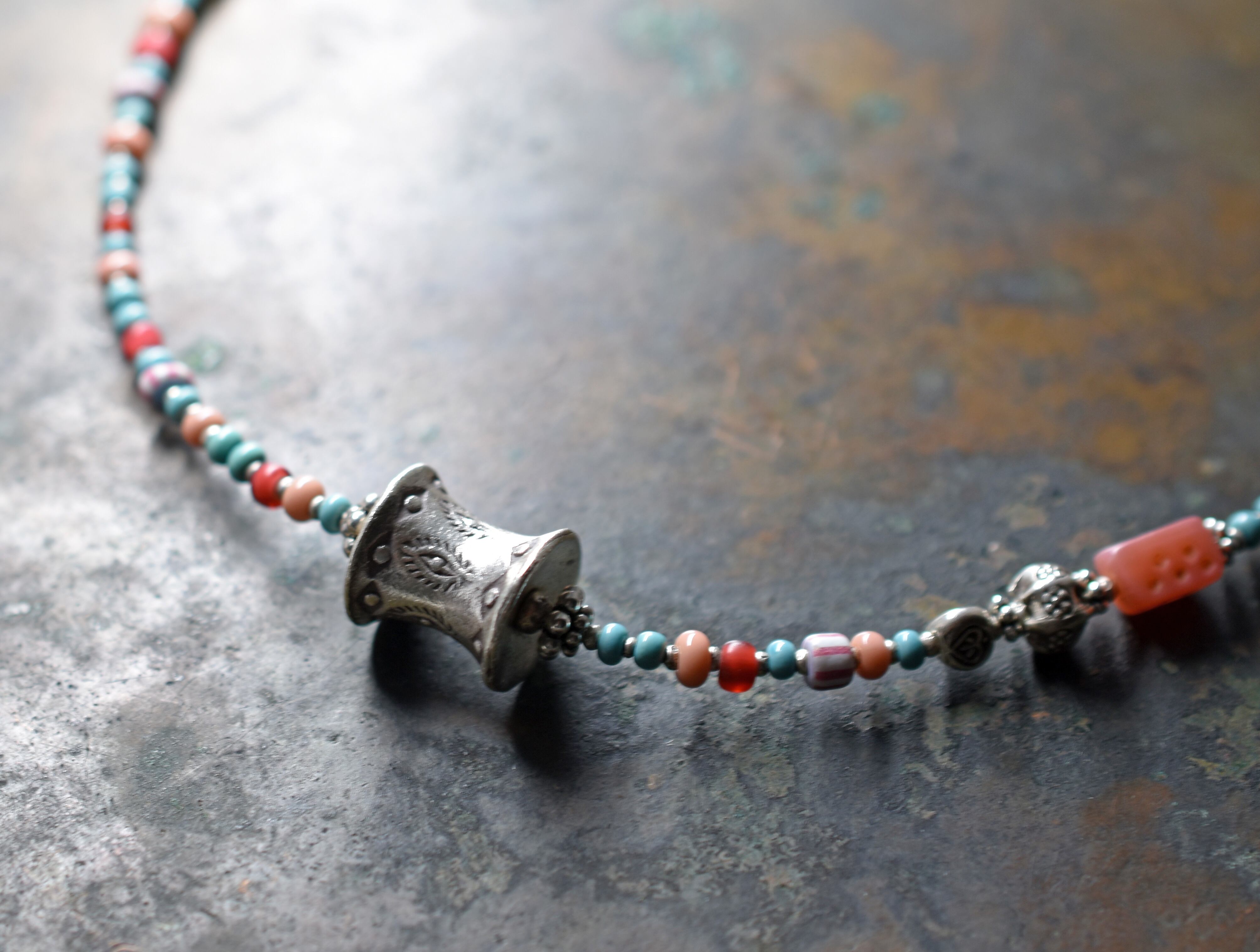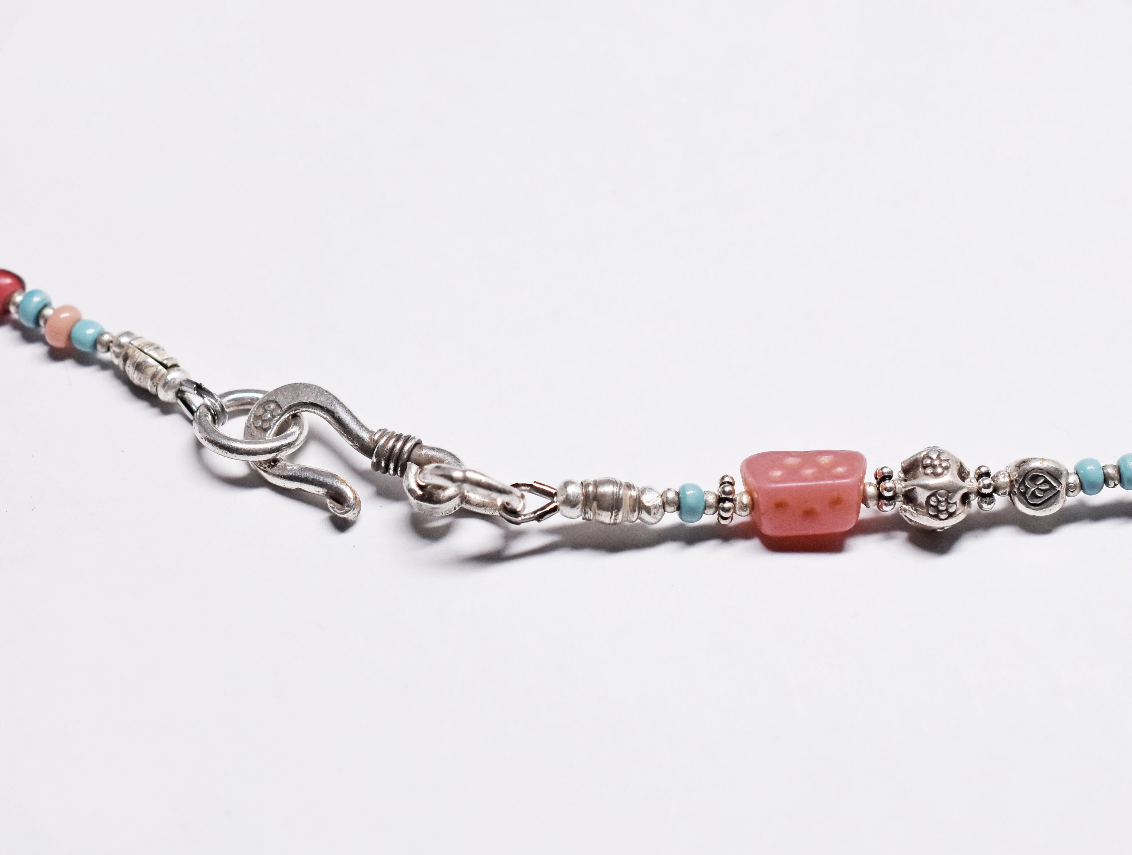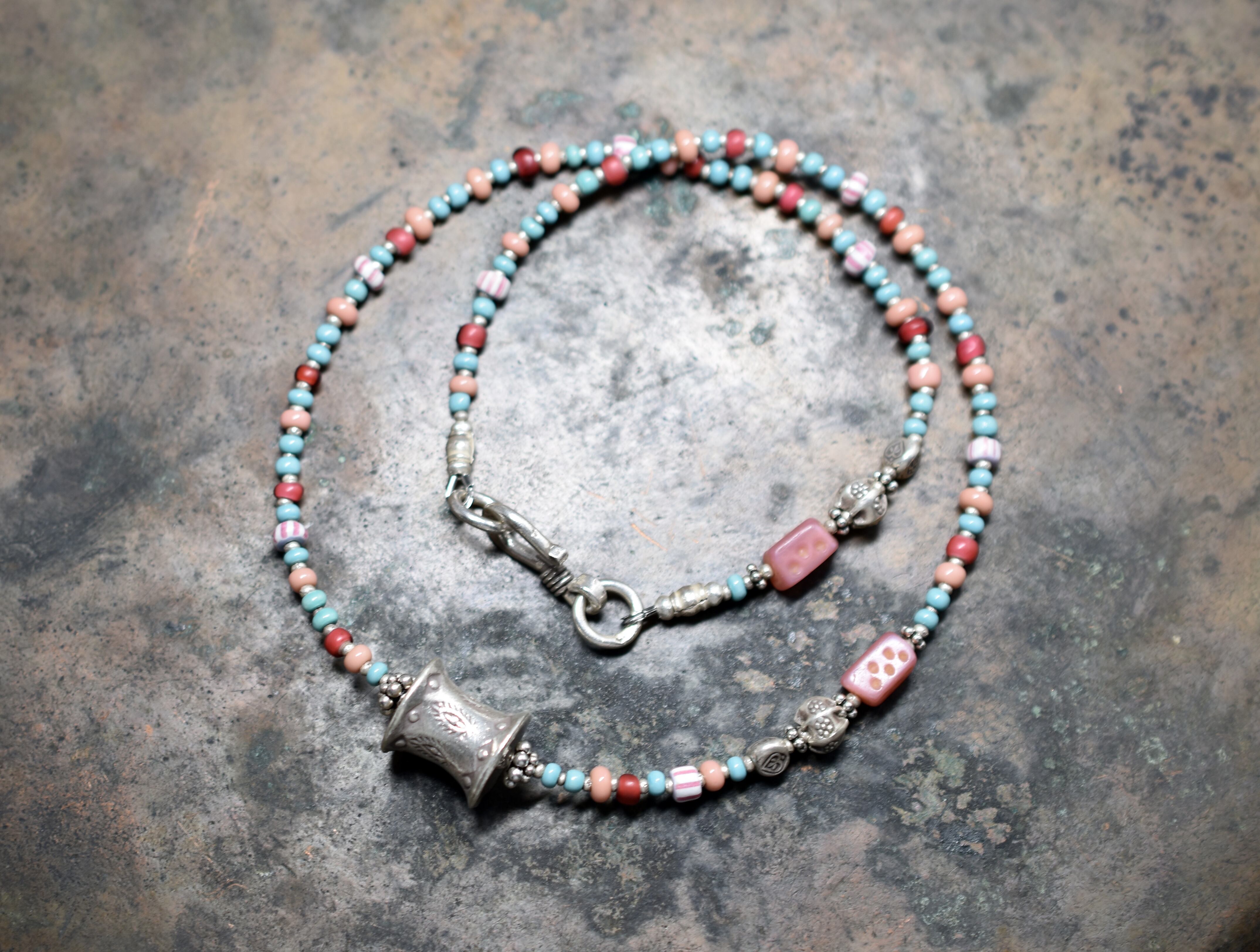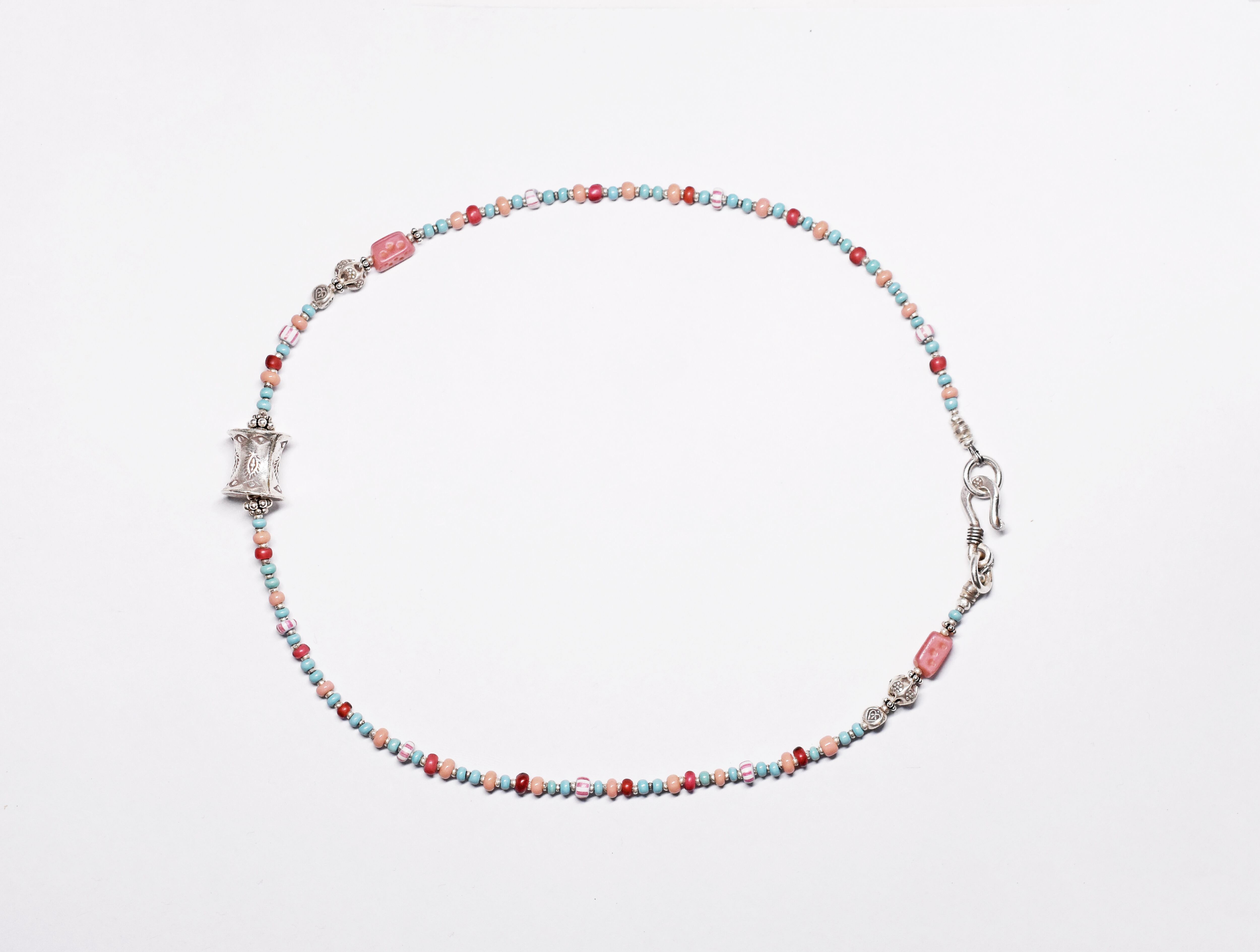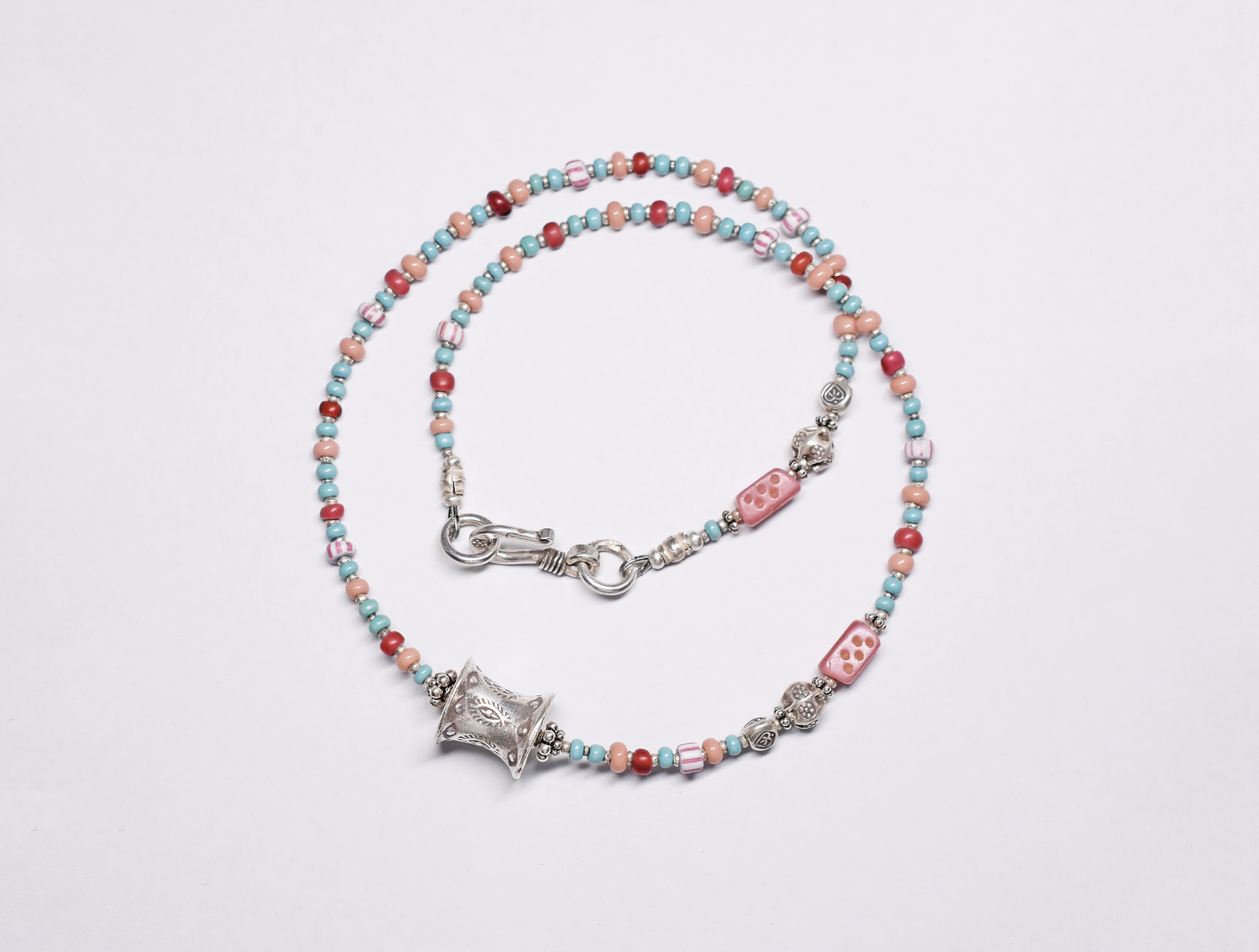 多彩なベネチアビーズと、ピンク色のダイスビーズ、カレンシルバーを繋いだネックレスです。