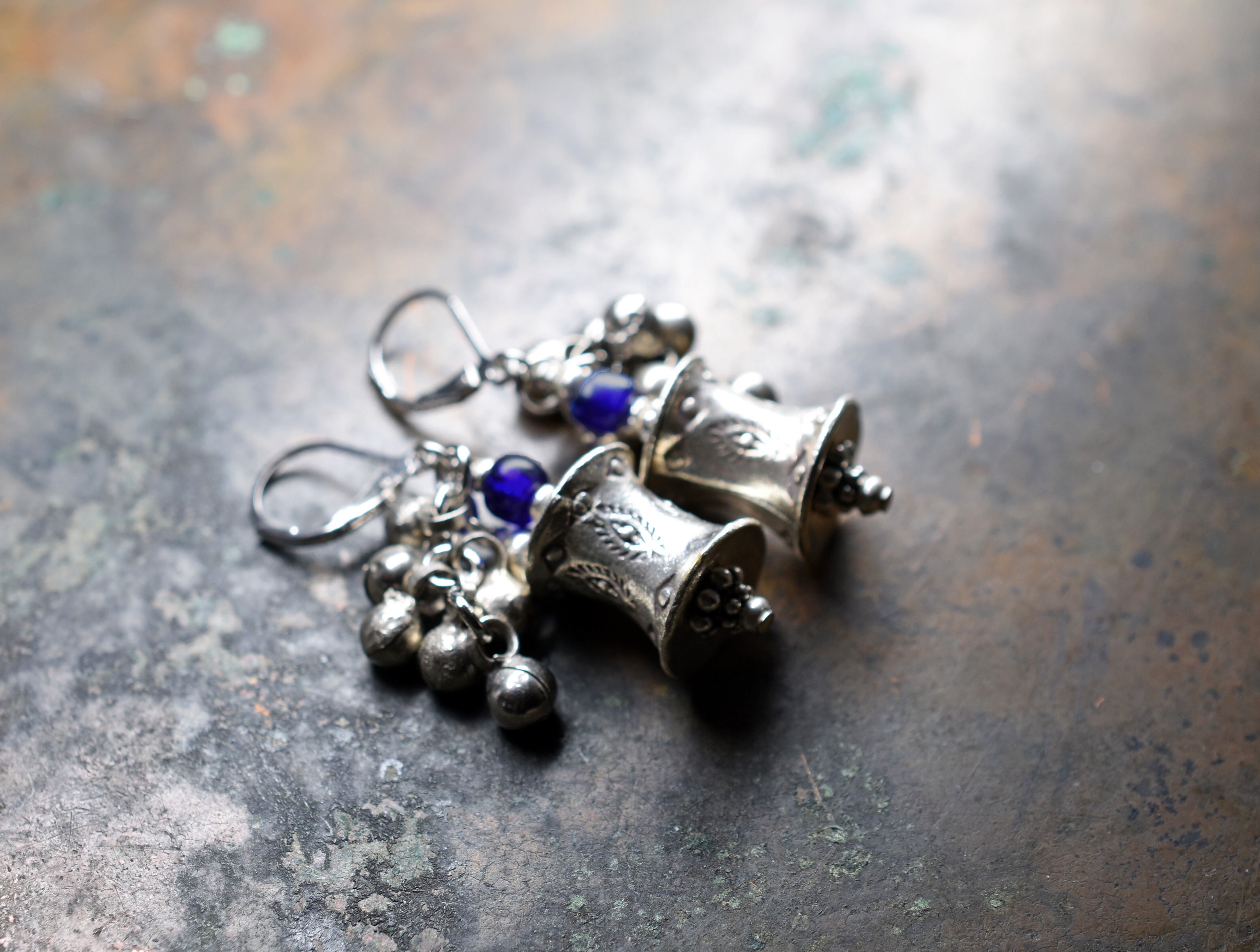 カレンシルバーとたわわな民族鈴、瑠璃色アンティークビーズのピアス