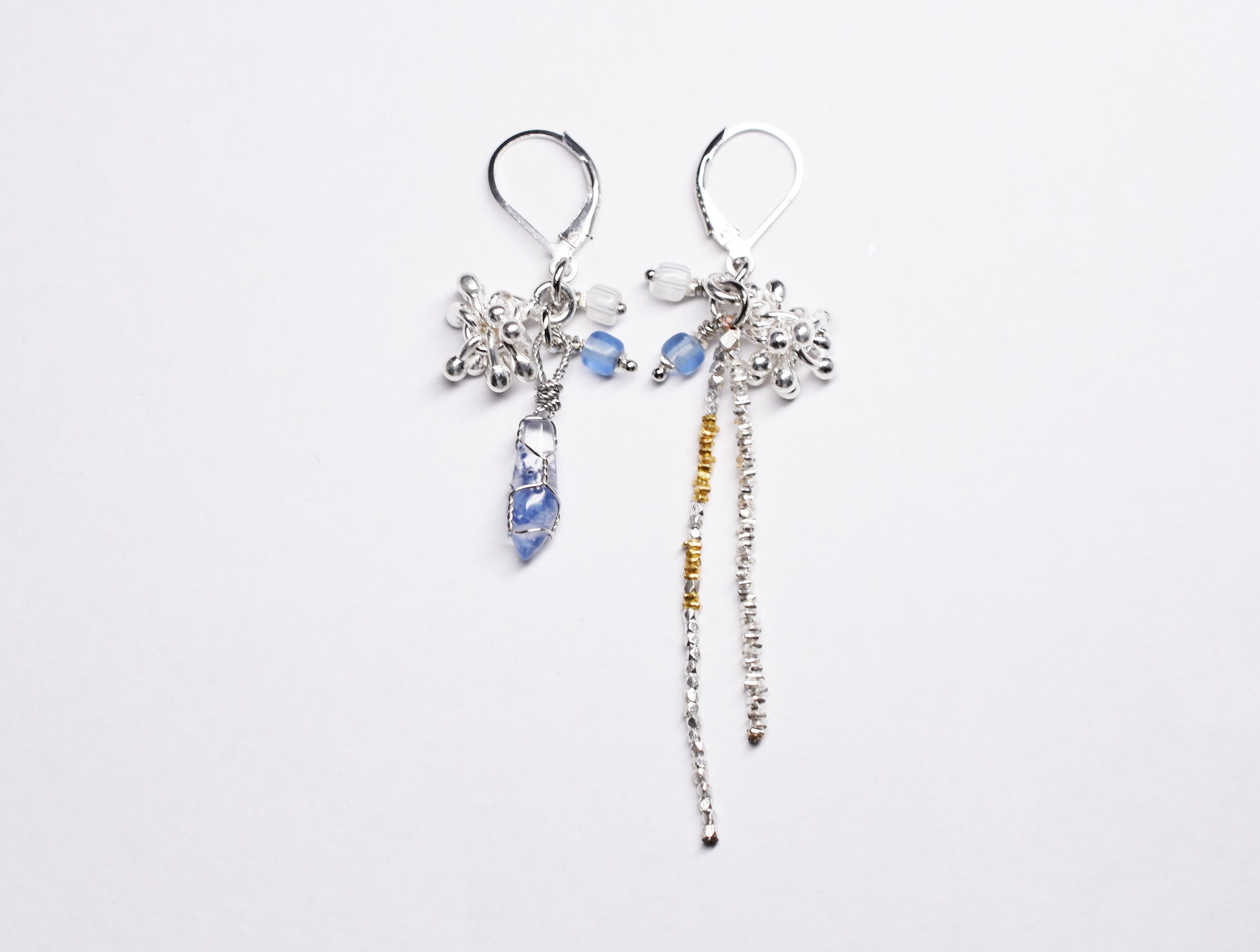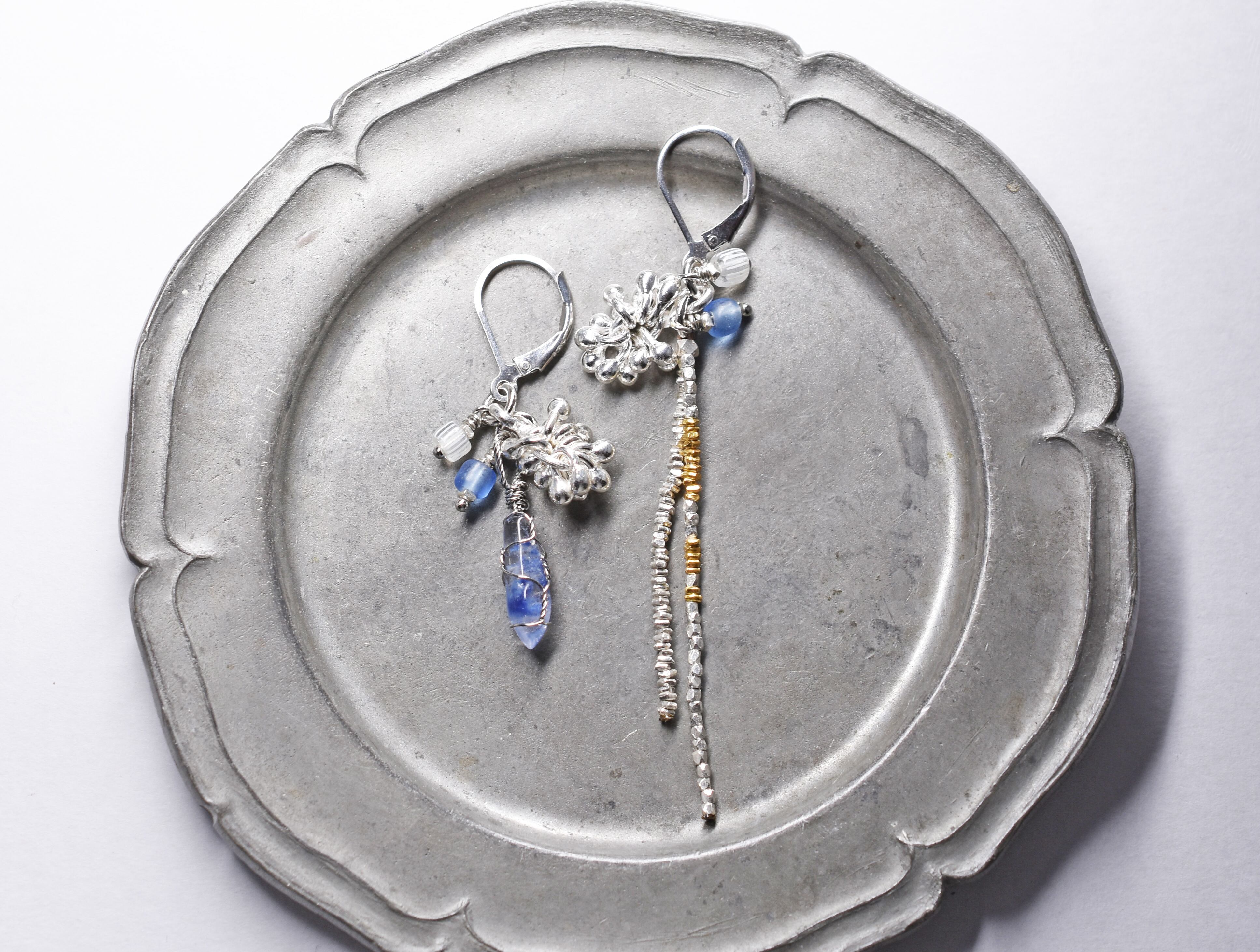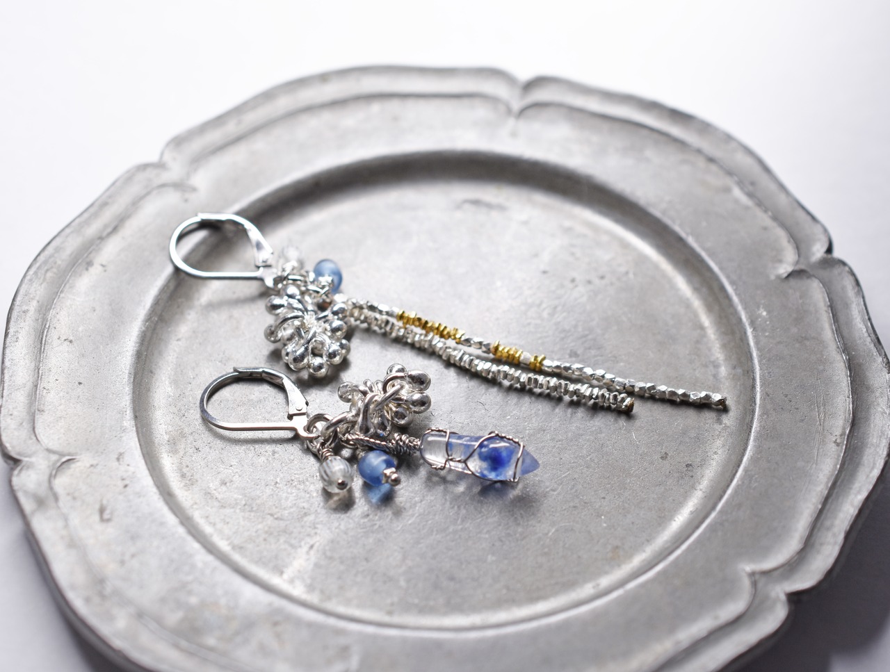 素材:デュモルチェライトインクォーツ(ワイヤーはステンレス)、カレンシルバー、18金コーティングカレンシルバー、ガラス、ハーキマーダイヤモンド