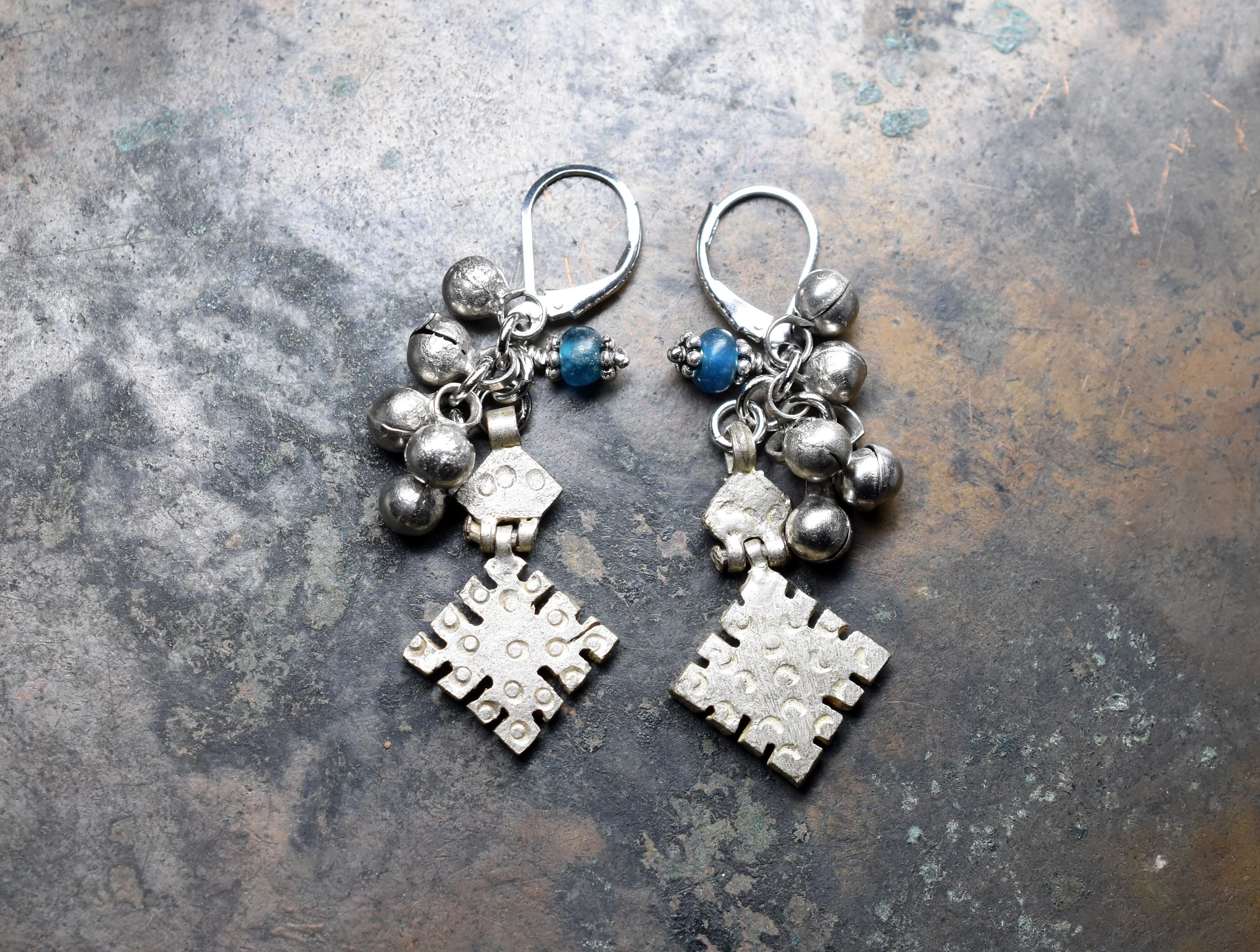 小さなエチオピアンクロスと鈴、ブルーグリーンのアンティークビーズをつなだい繋いだピアスです。