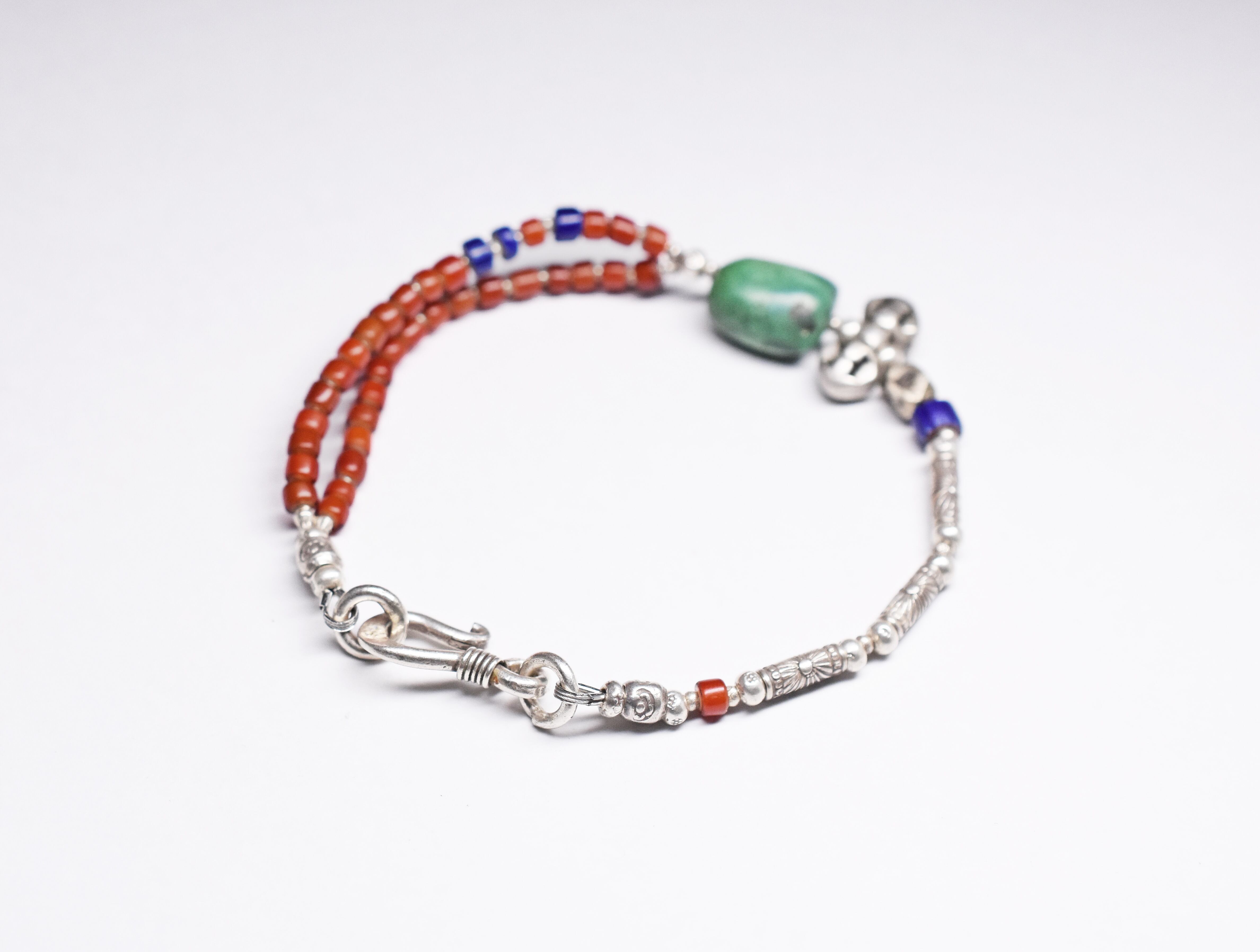 チベタンターコイズとドルジェ、カレンシルバー、金赤のホワイトハーツを繋いだブレスです。
