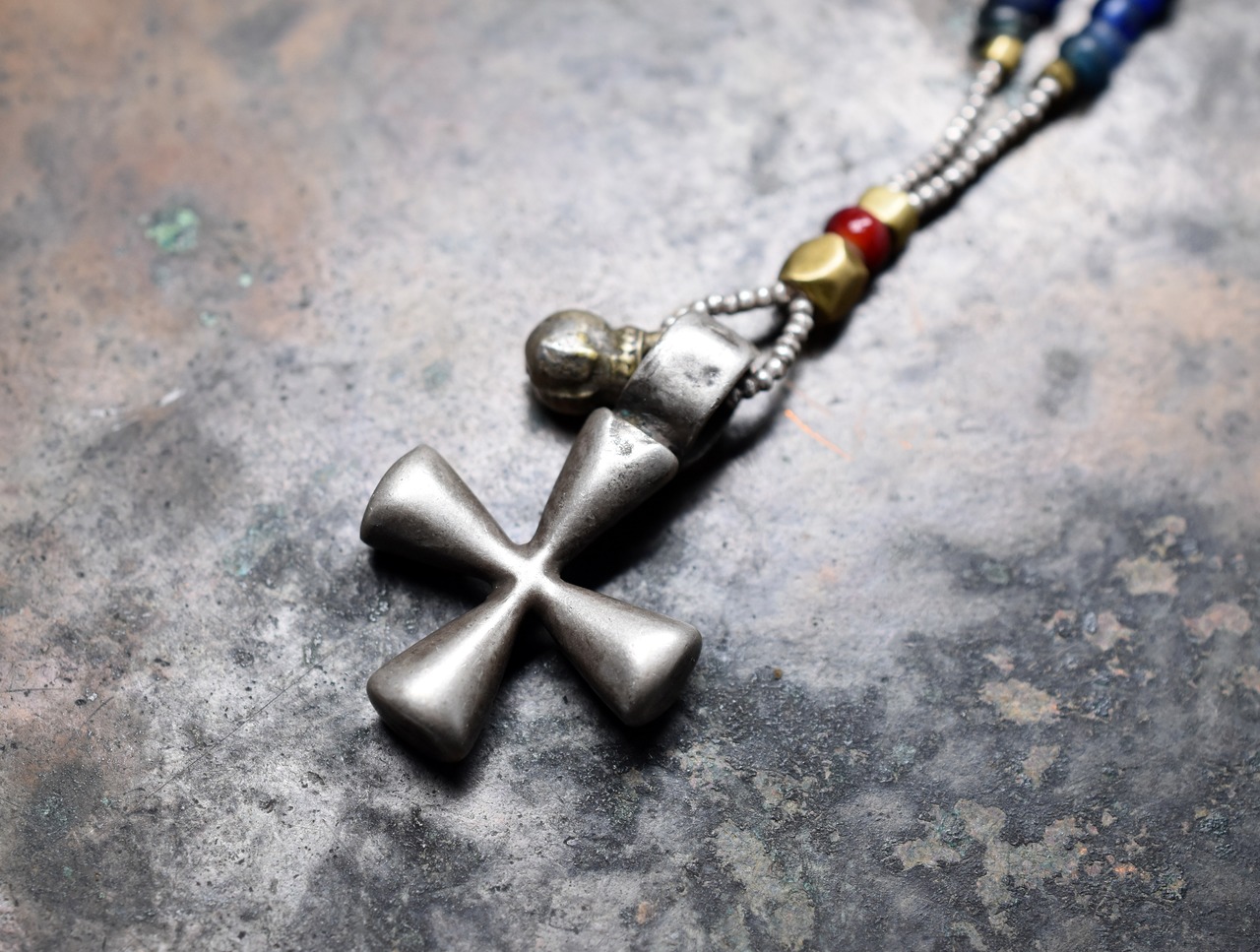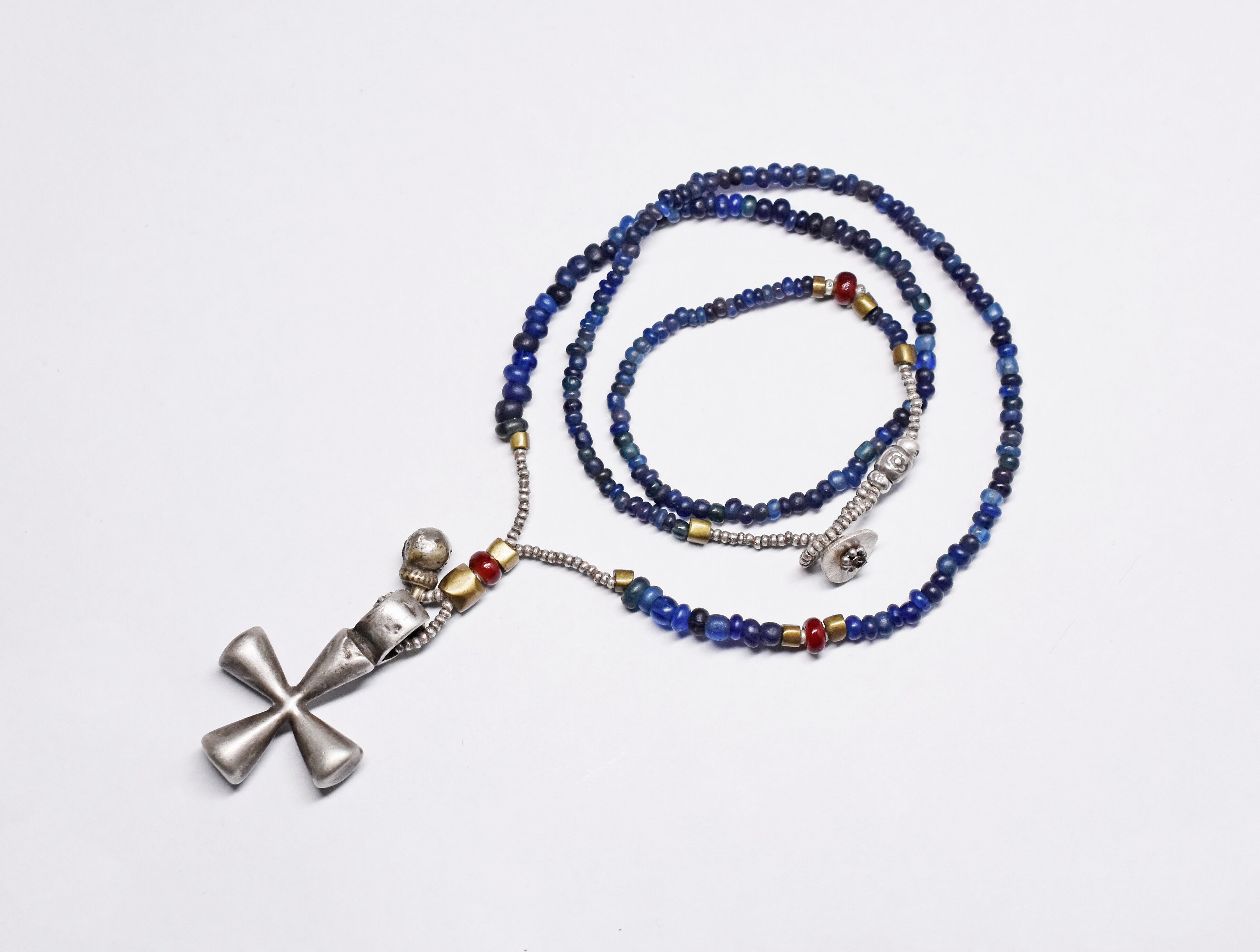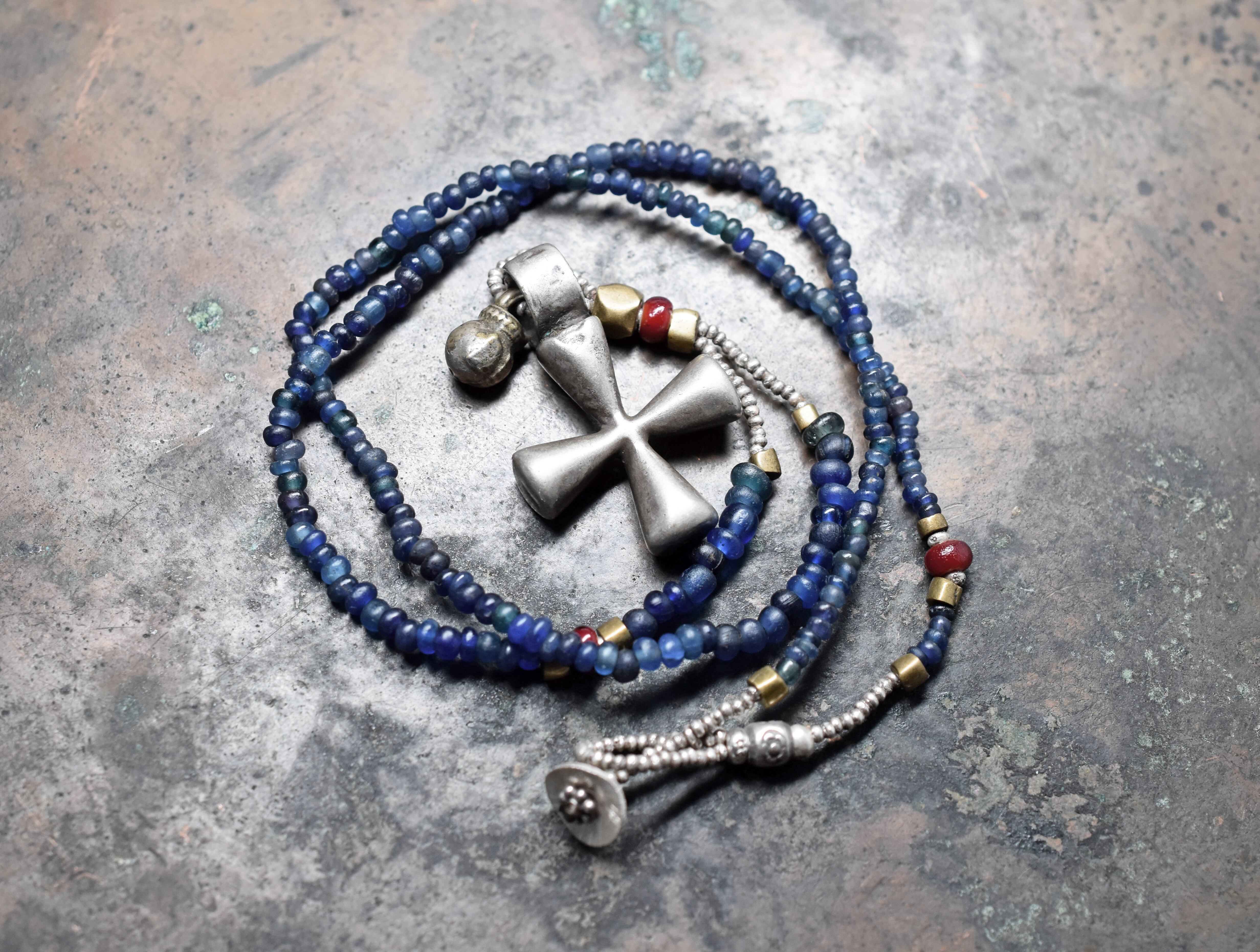 古いシルバー製のエチオピアンクロスと、ダークブルーのアンティークビーズ、oldオリッサブラス、血赤色のホワイトハーツなどを繋いだネックレスです。