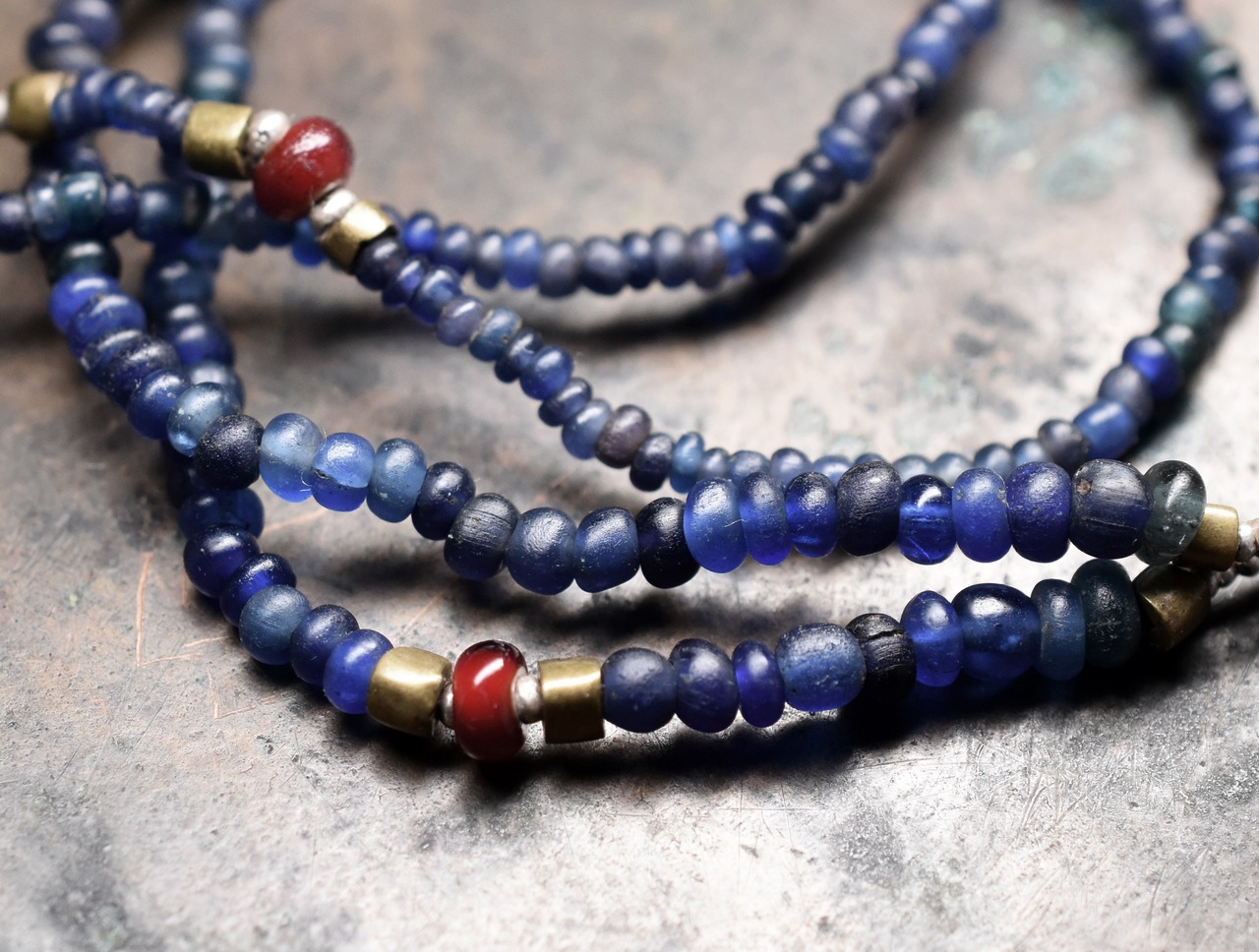 ダークブルーのビーズはインドパシフィックビーズと呼ばれるアンティークビーズです。