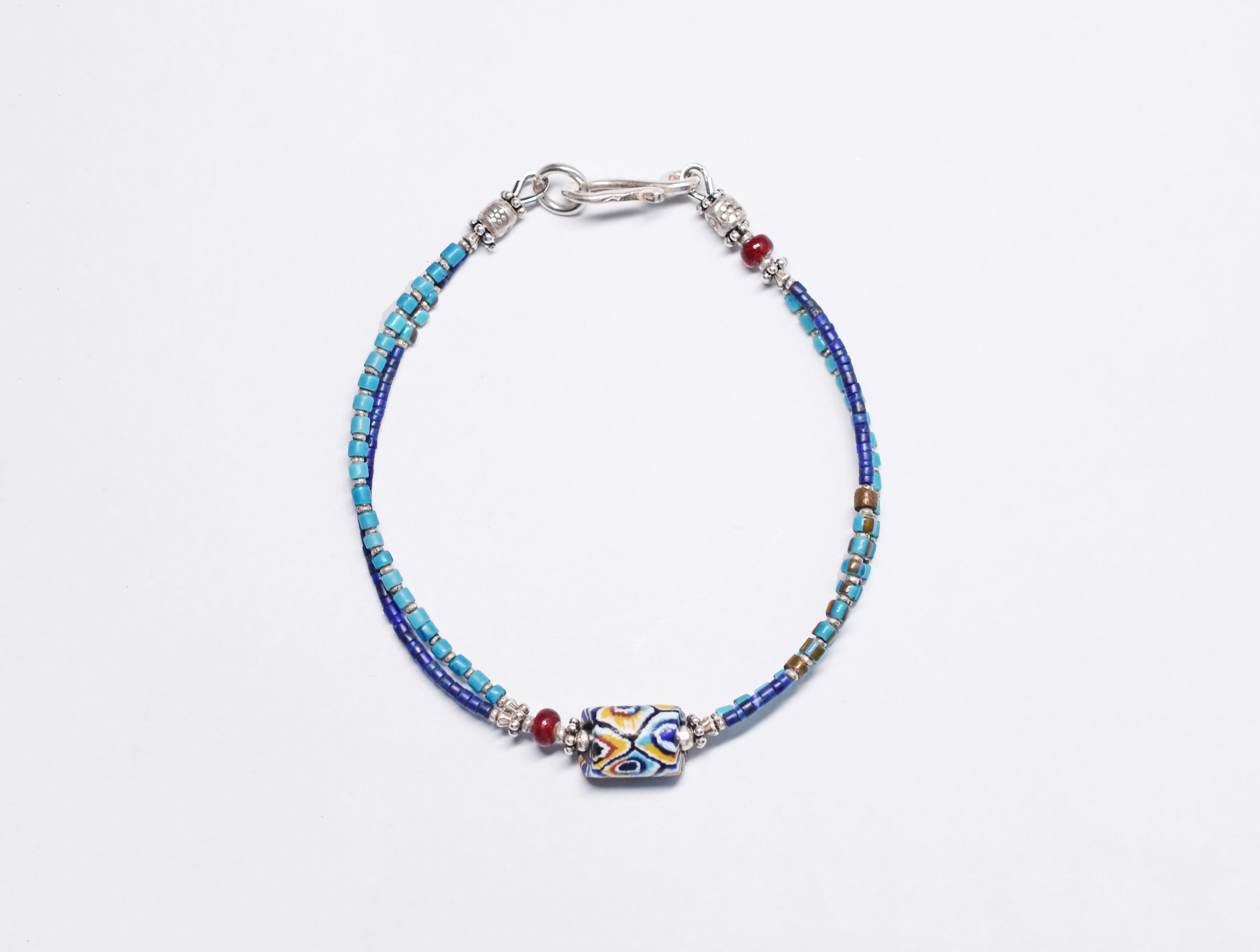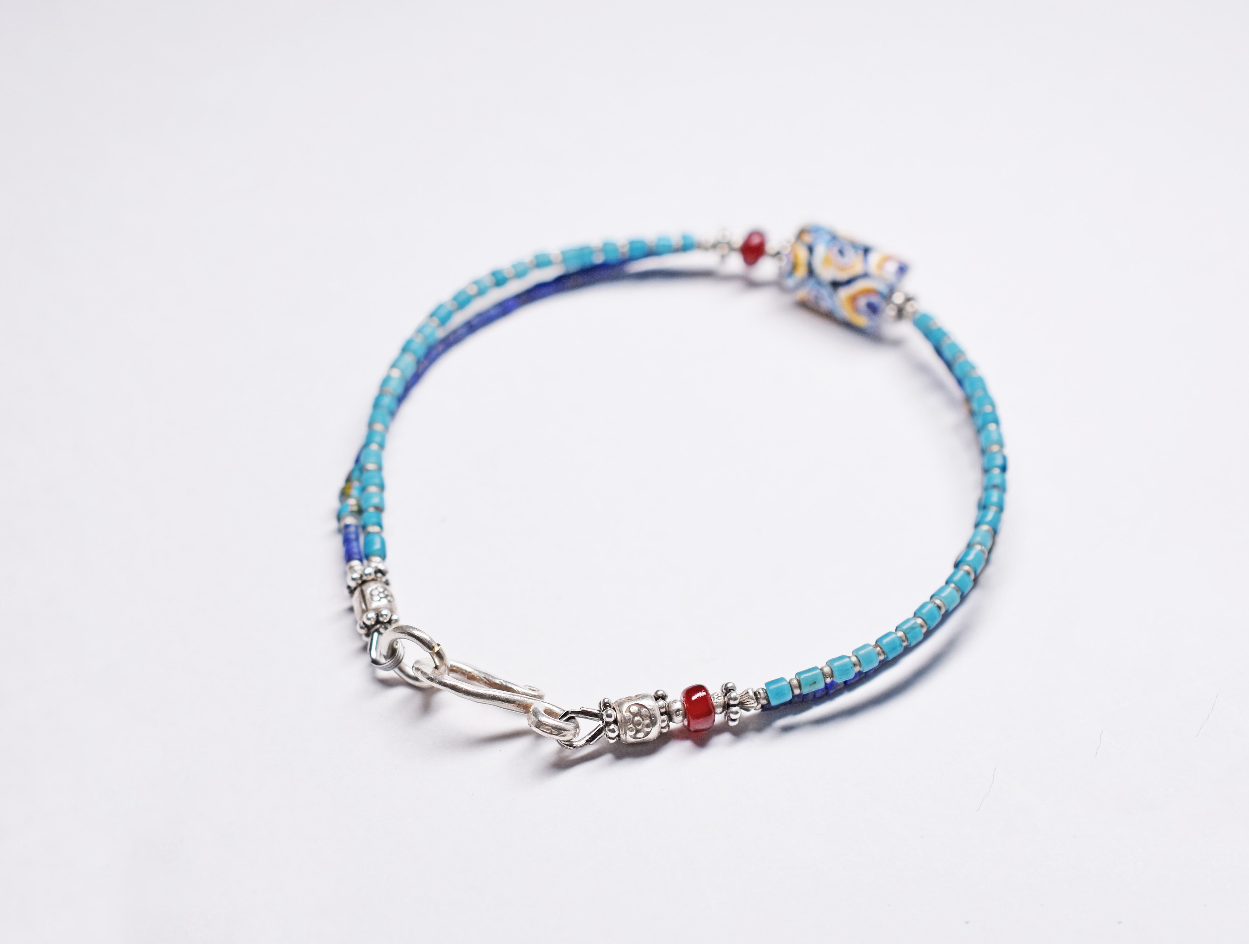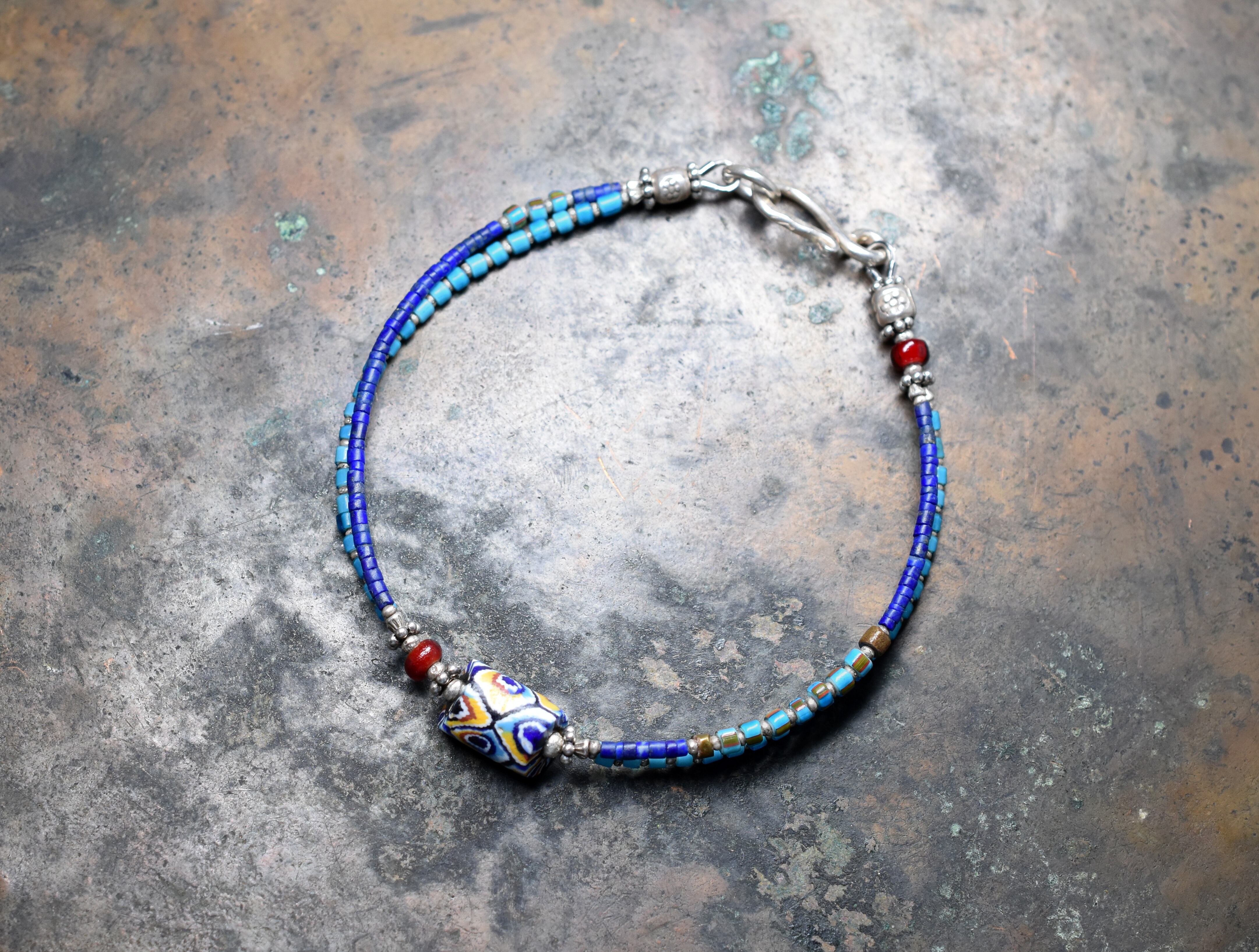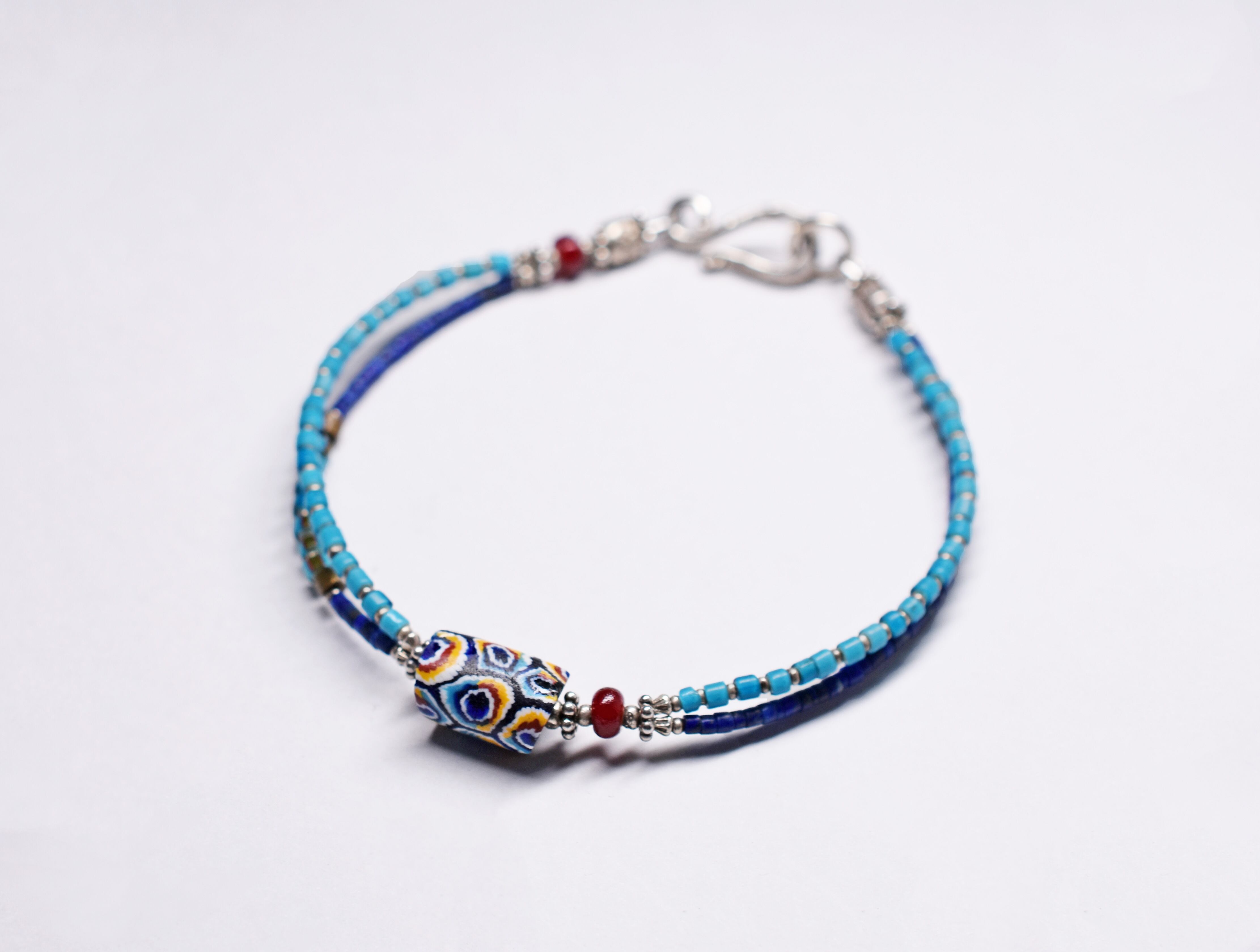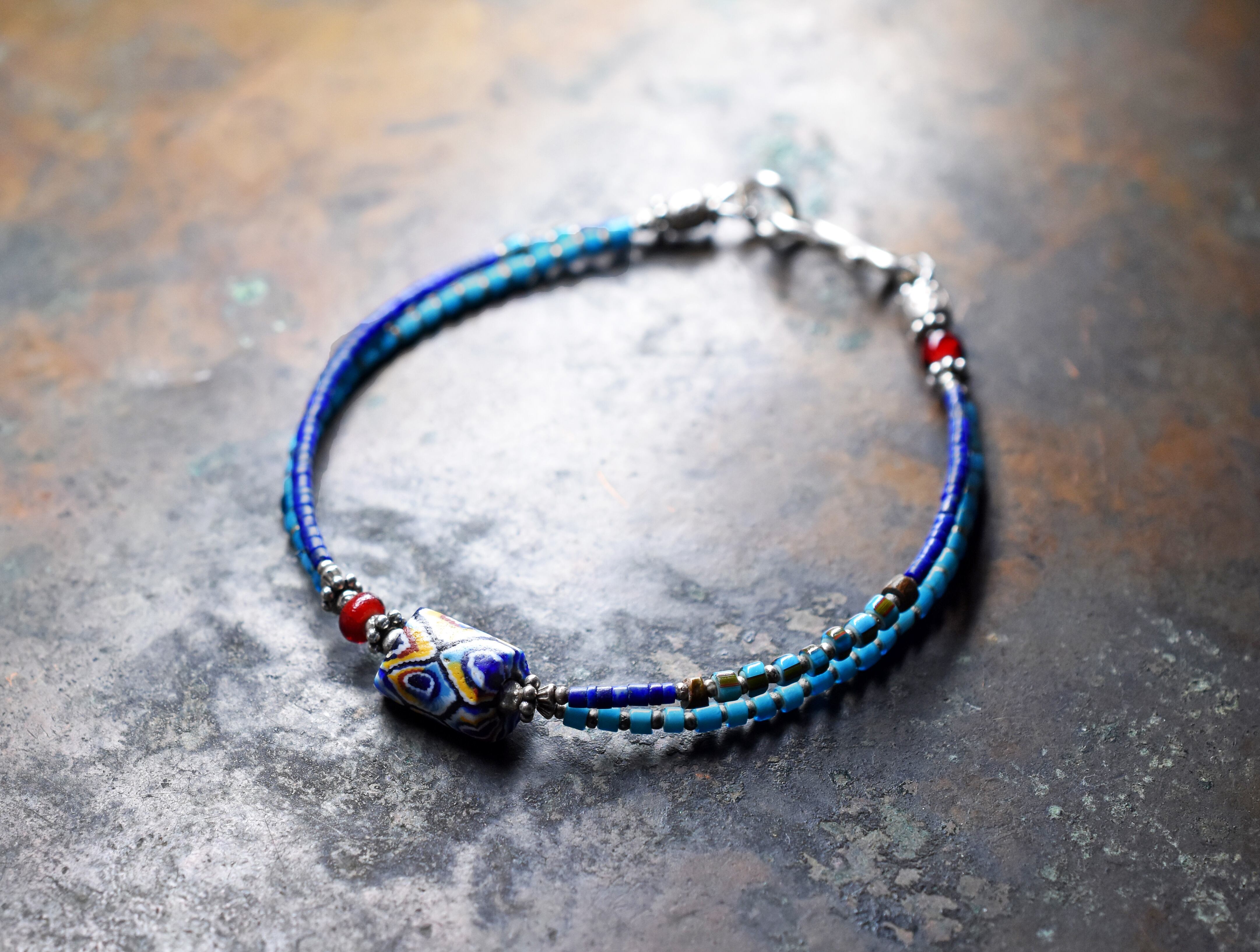 ミルフィオリ(千の華)と呼ばれるアンティークのベネチアビーズ(19~20世紀)を、小さなラピスラズリと、ターコイズブルーのホワイトハーツで繋いだブレスです。