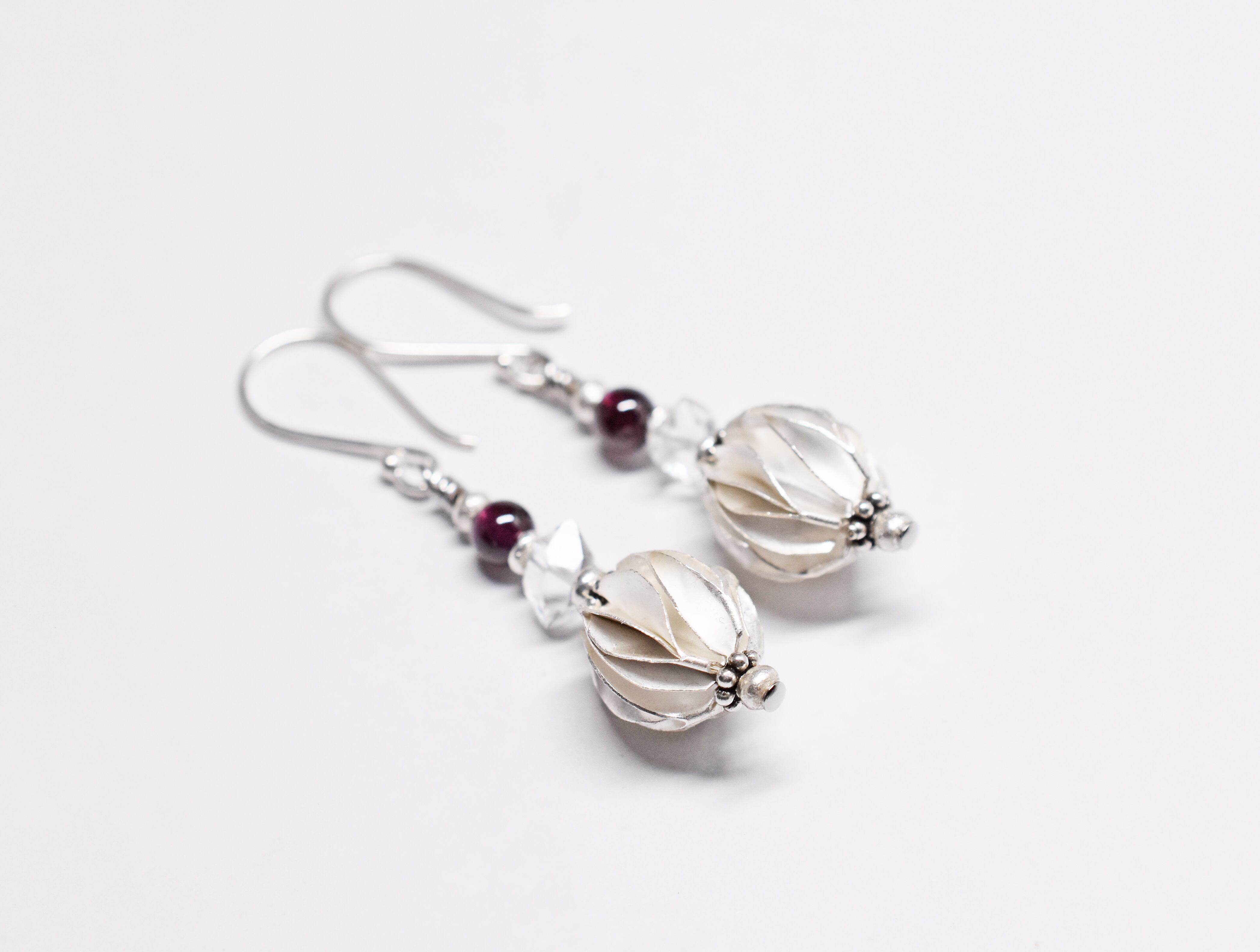 ひらひらのカレンシルバーに、ハーキマーダイヤモンド、ガーネットを繋げたピアスです。