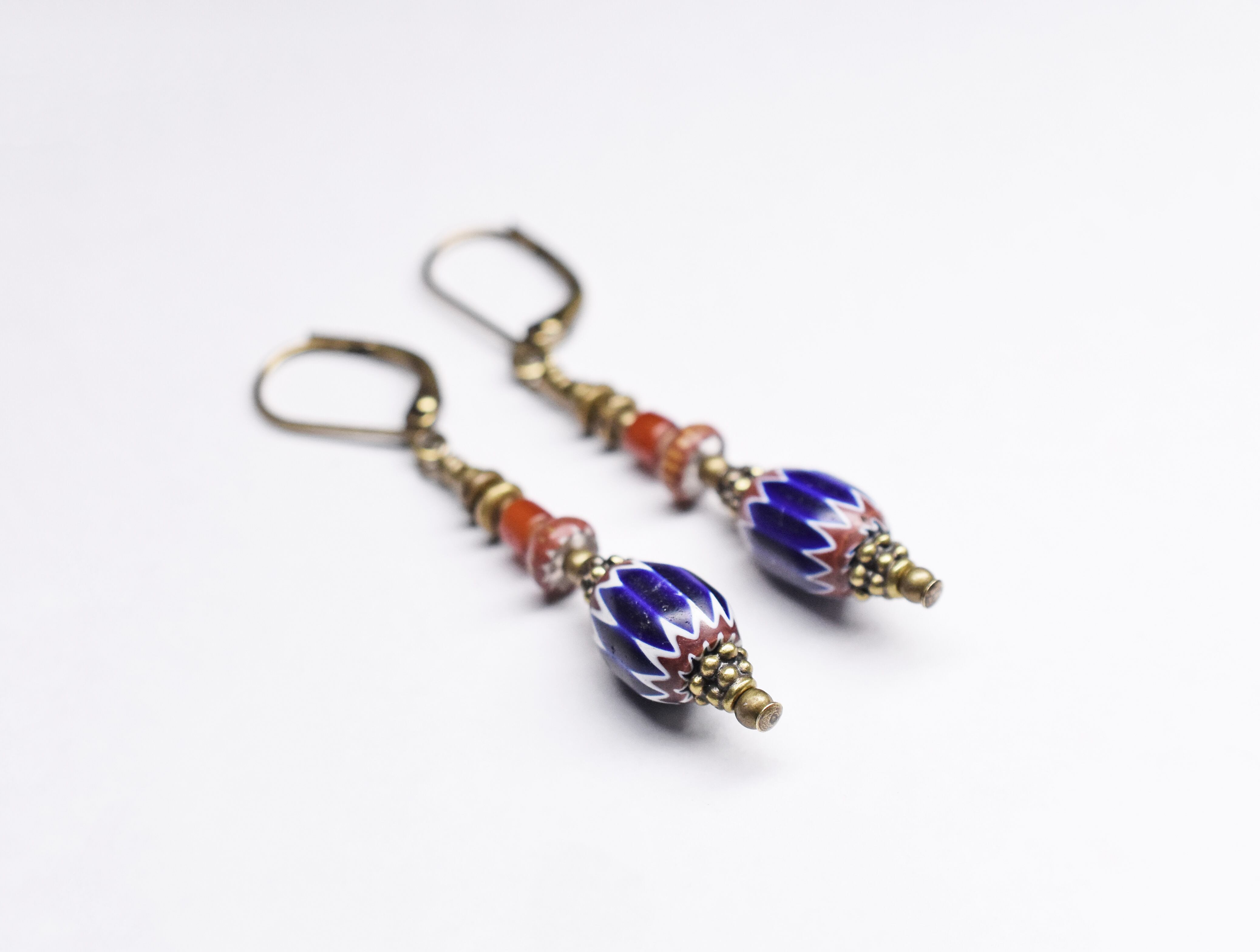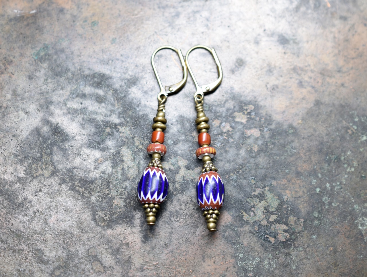 2種類のアンティークのシェブロンビーズと飴色のホワイトーツ、ブラスビーズを繋いだピアスです。