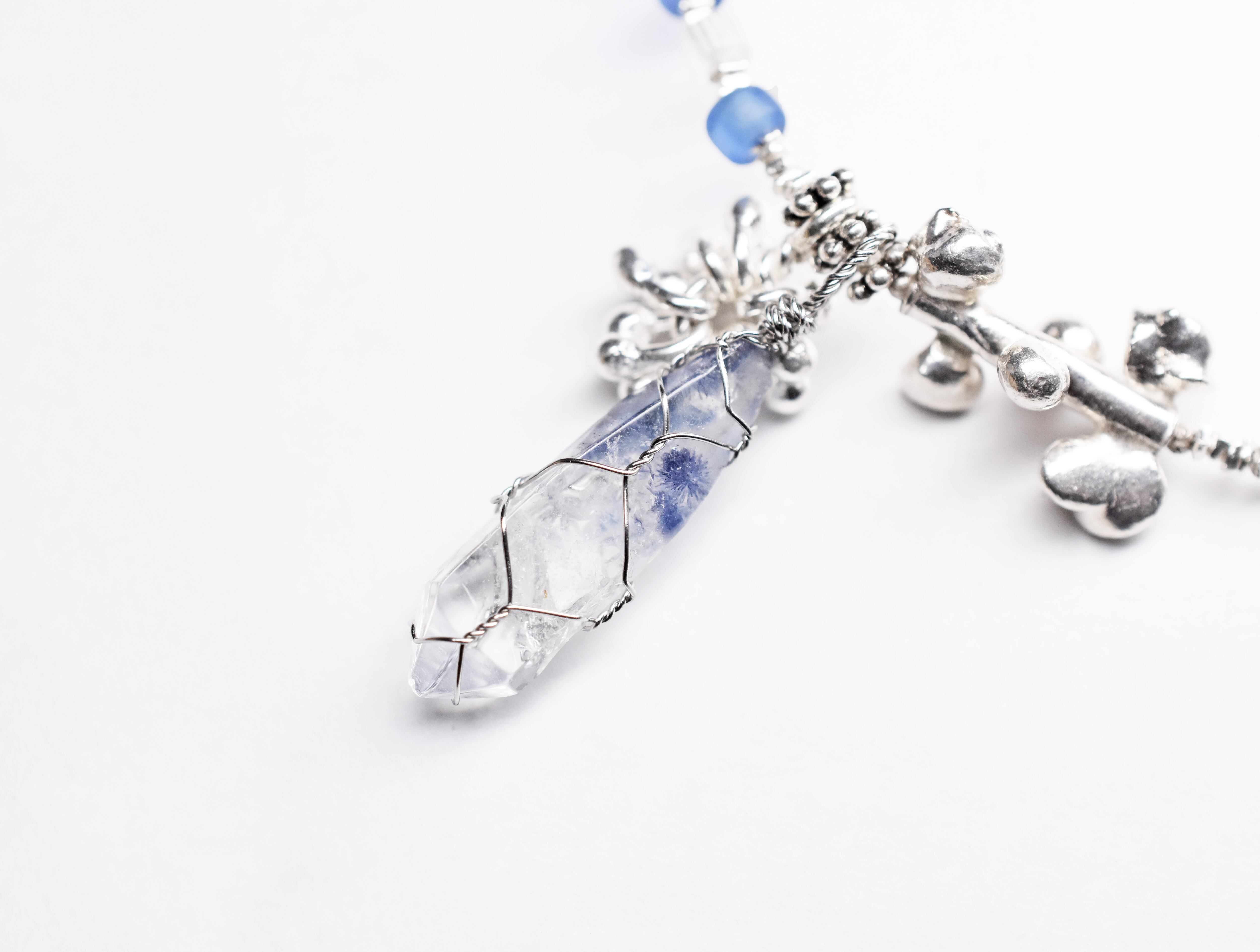素材:デュモルチェライトインクォーツ(ワイヤーはステンレス)、カレンシルバー、ガラス、ハーキマーダイヤモンド、ワイヤー