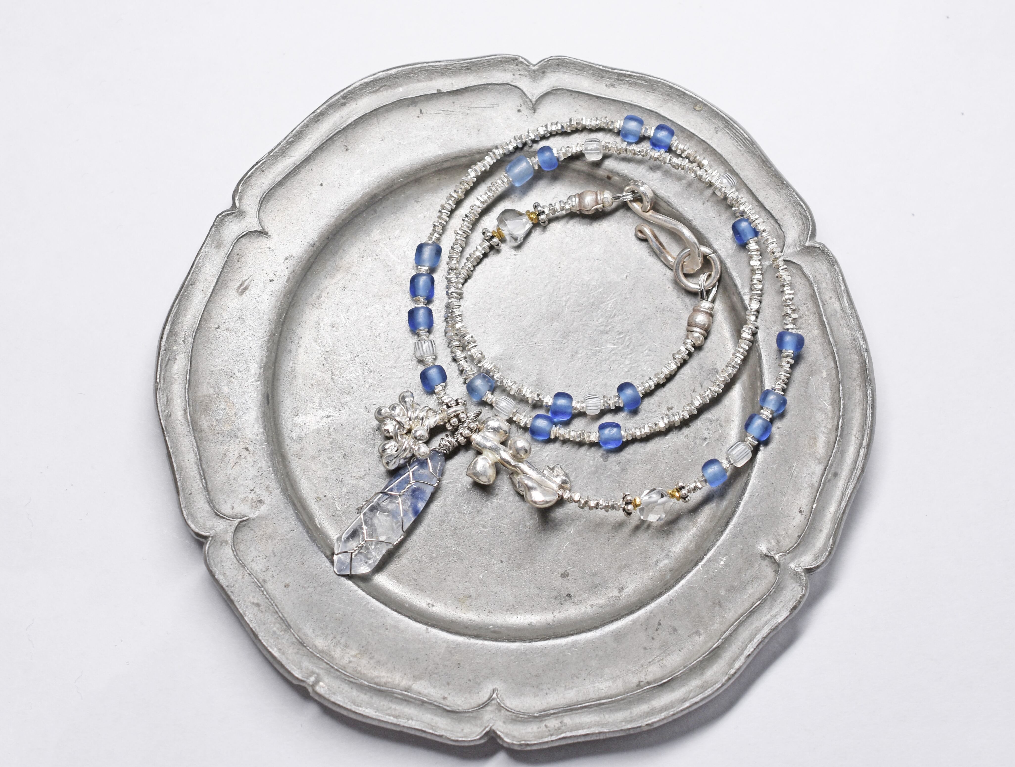 デュモルチェライトインクォーツと、しゃらりとしたカレンシルバチャーム、アンティークビーズを繋いだ煌めくネックレスです。