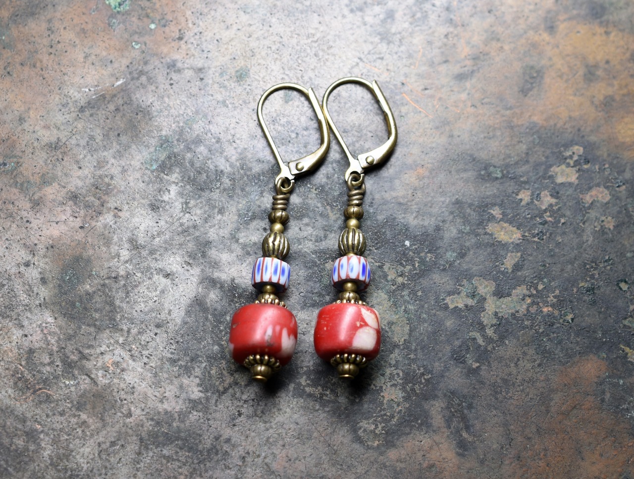 アンティークのボヘミアビーズとベネチアビーズ、ブラスビーズを繋いだピアスです。