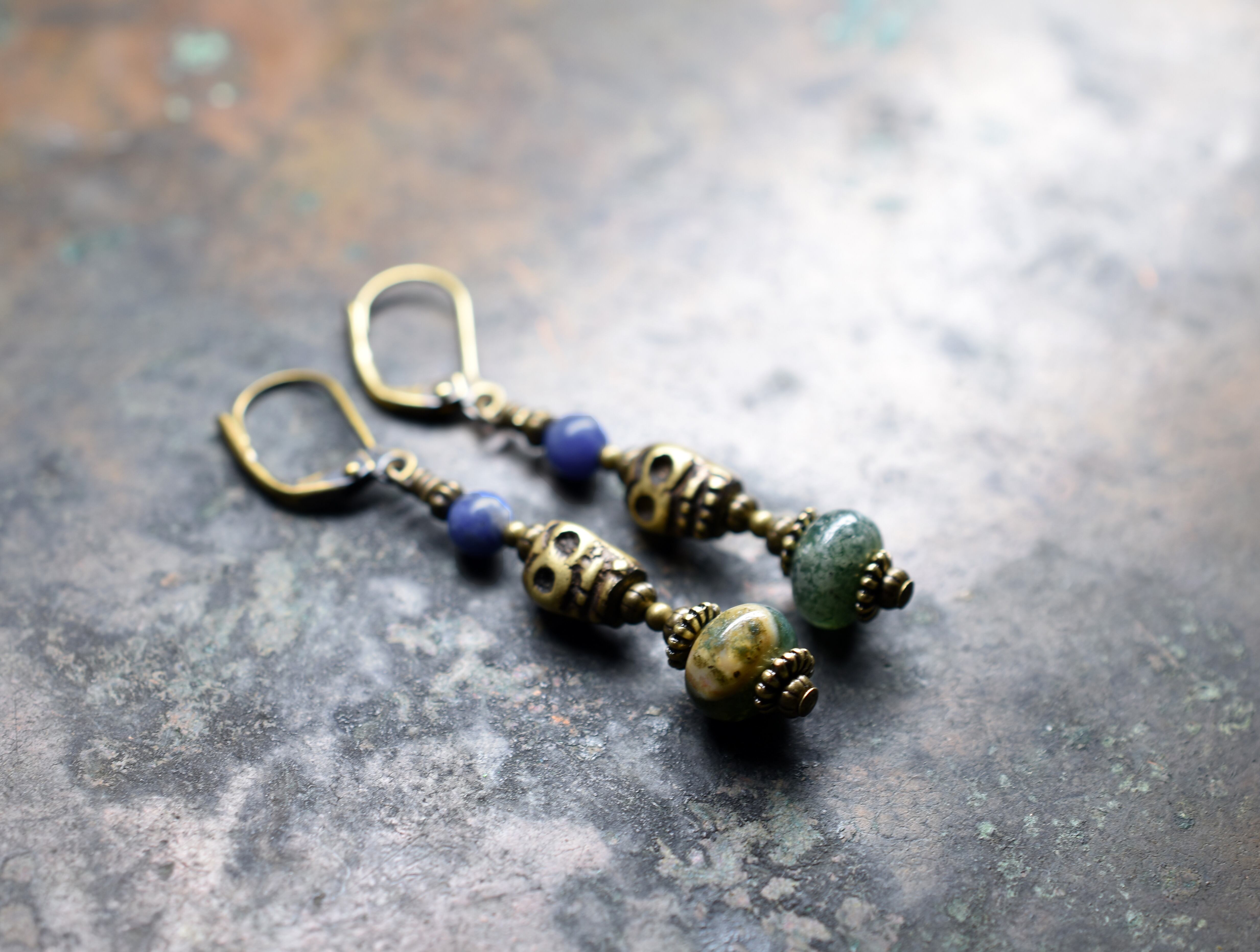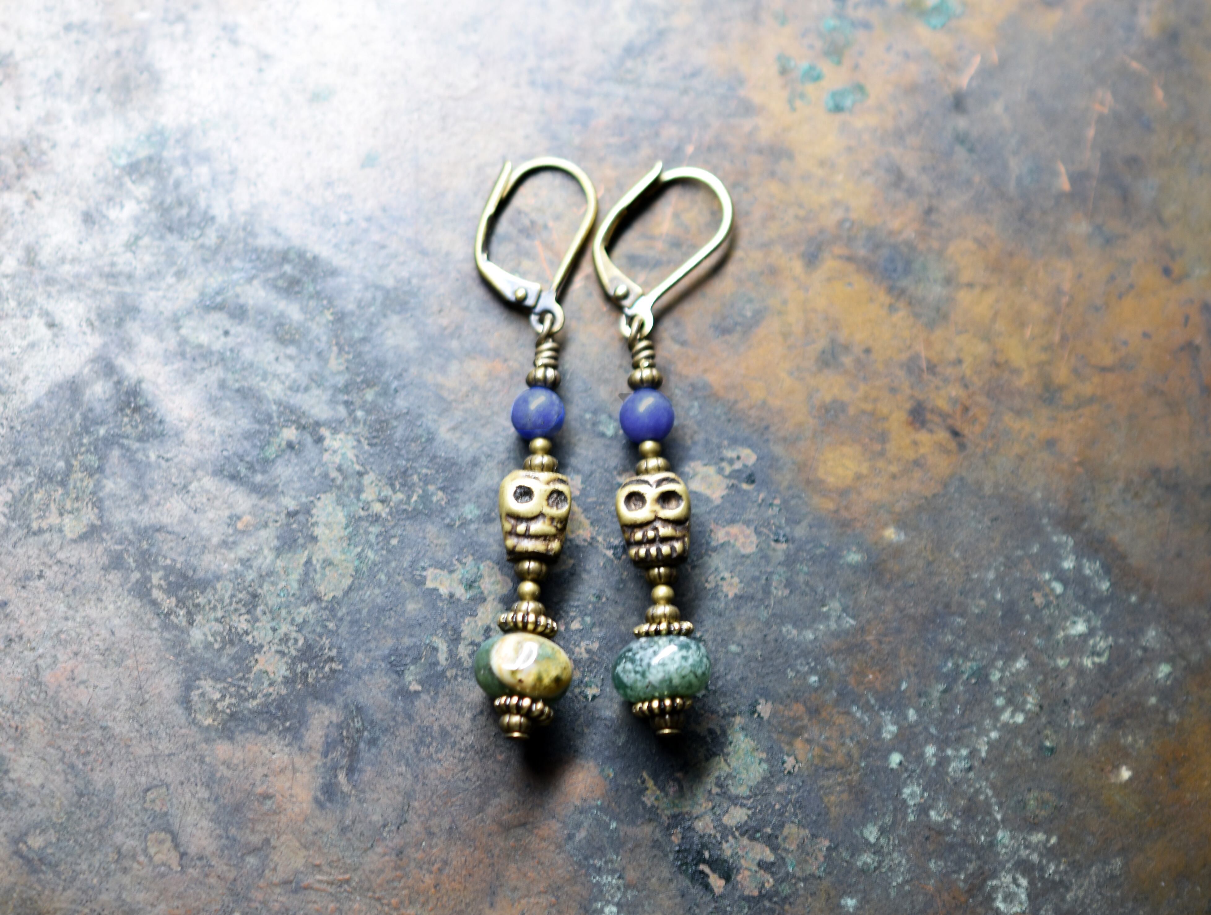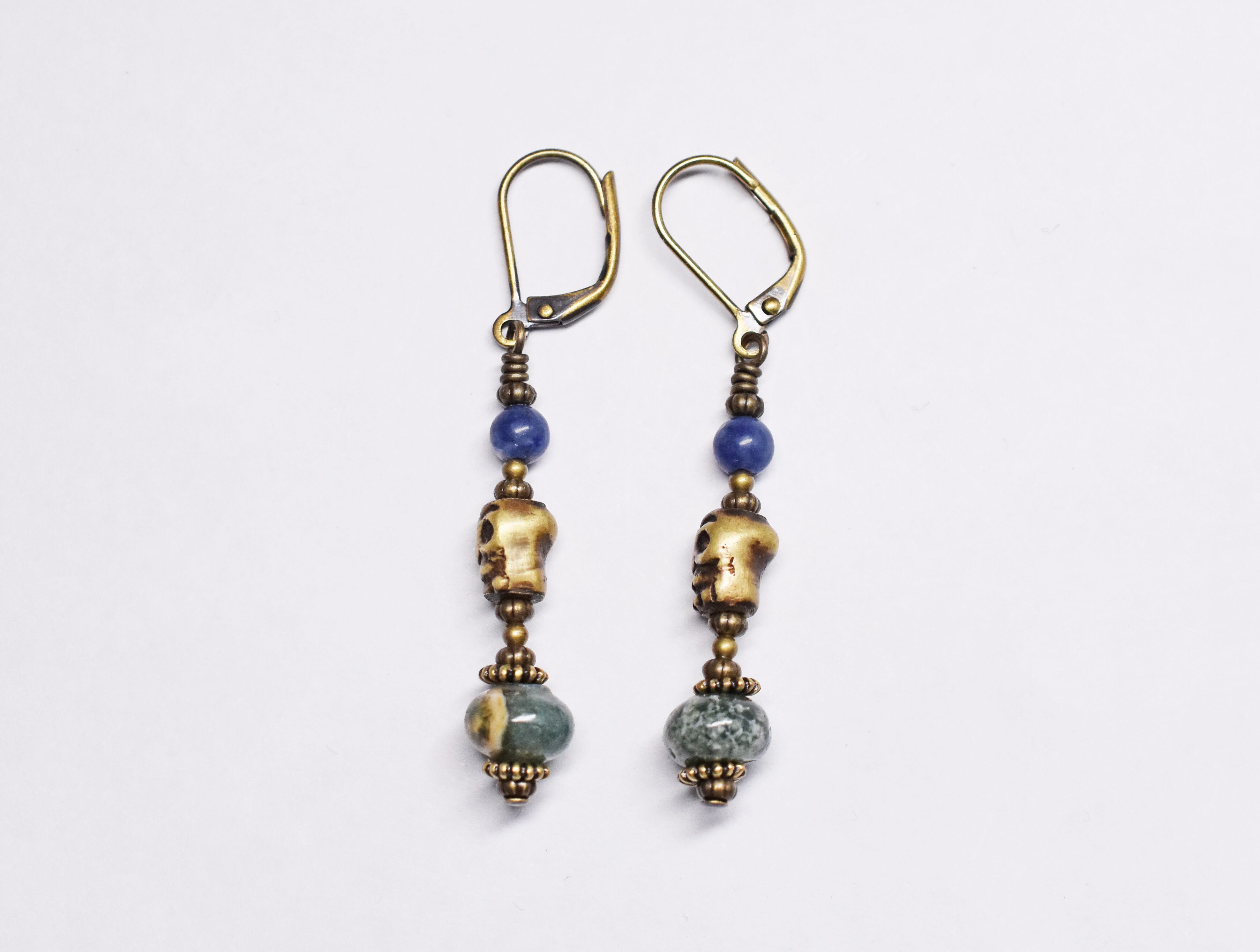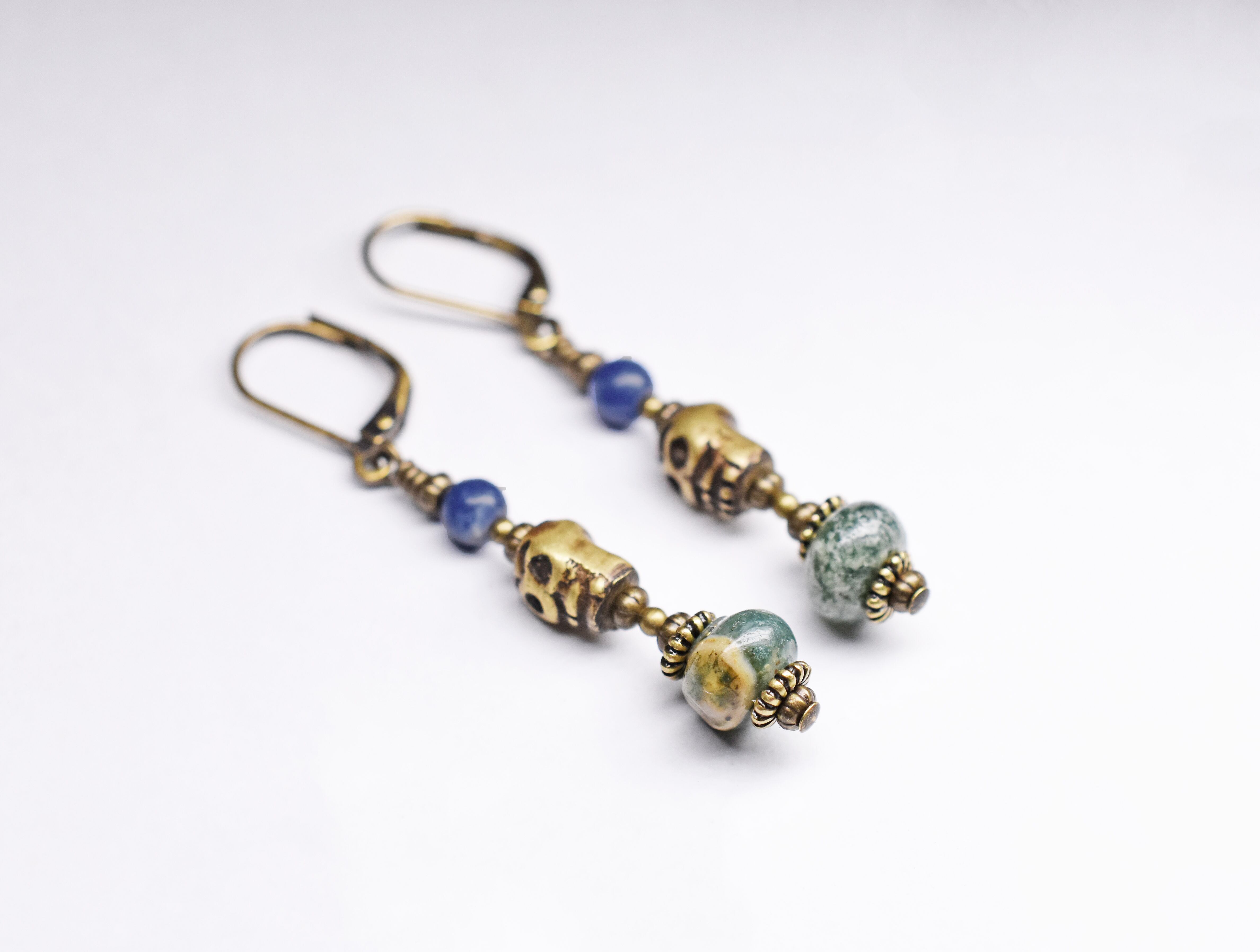 真鍮製のドクロビーズと2種類のストーンビーズを繋いだピアスです。
