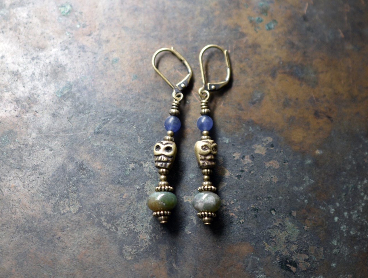 ブラススカルと2種類のストーンビーズピアス(濃色)