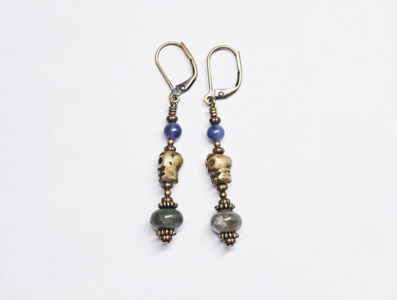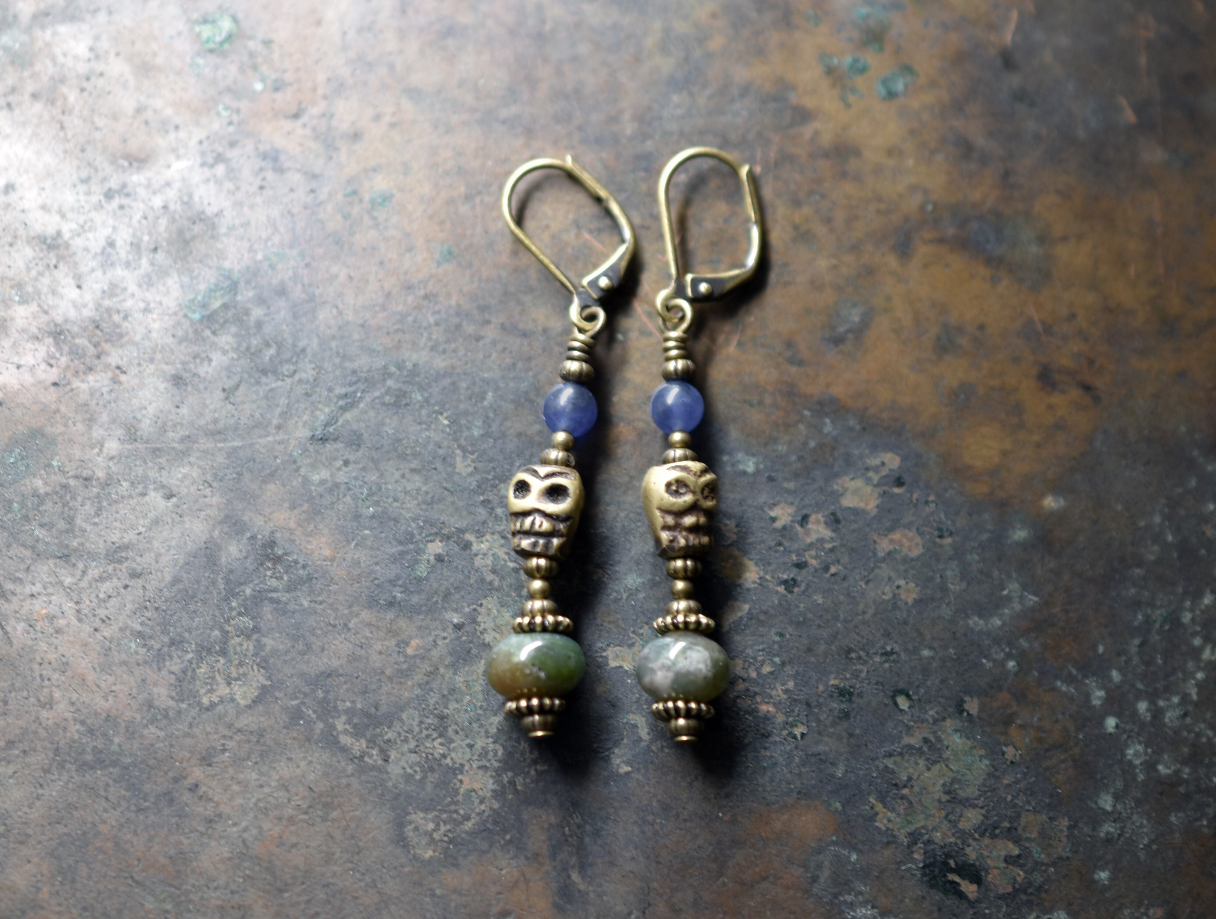 真鍮製のドクロビーズと2種類のストーンビーズを繋いだピアスです。