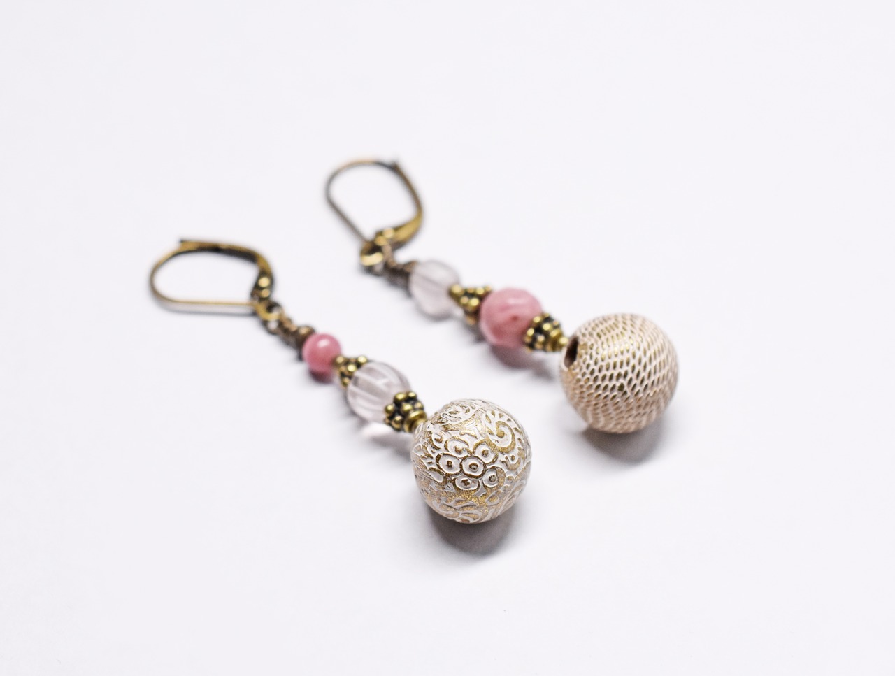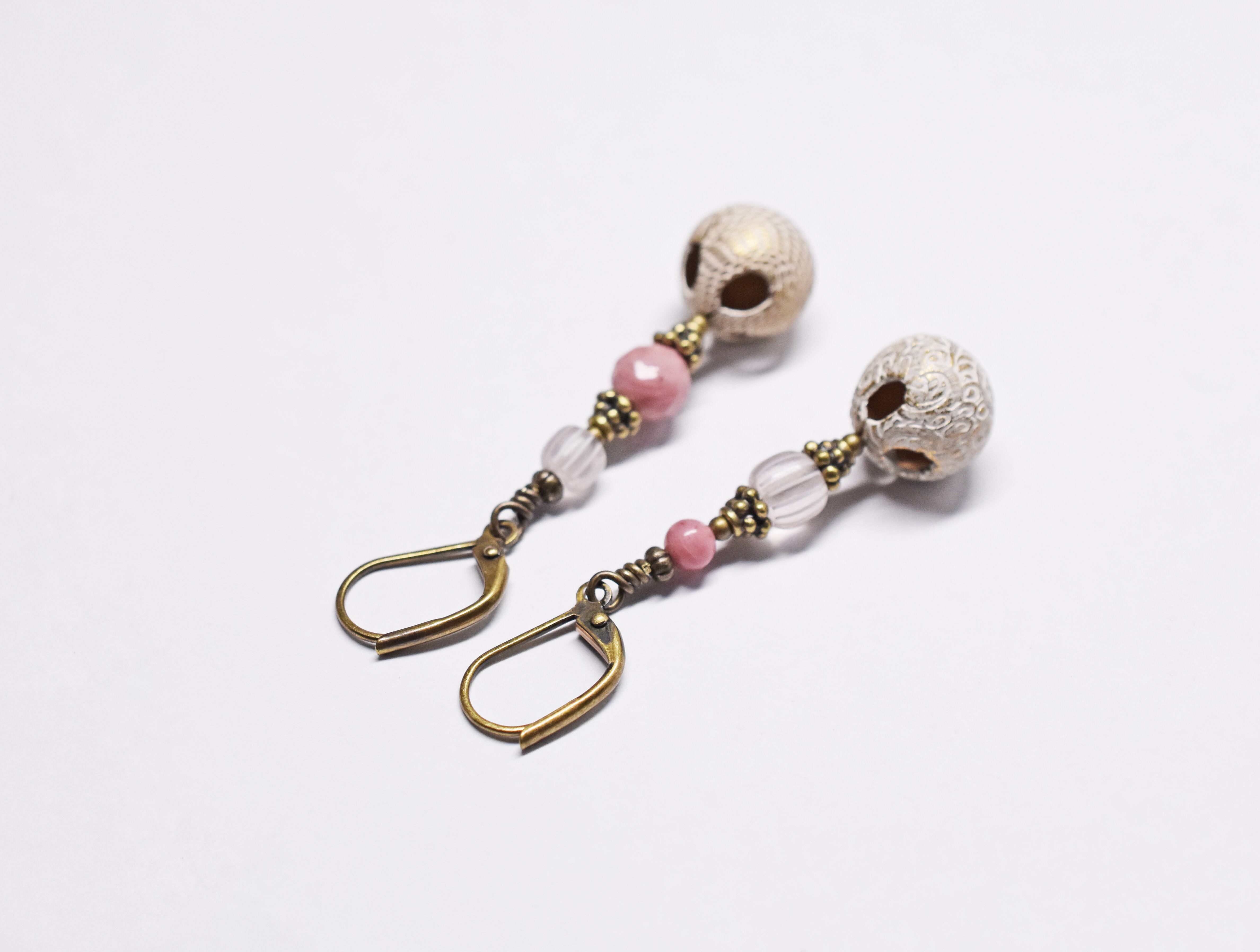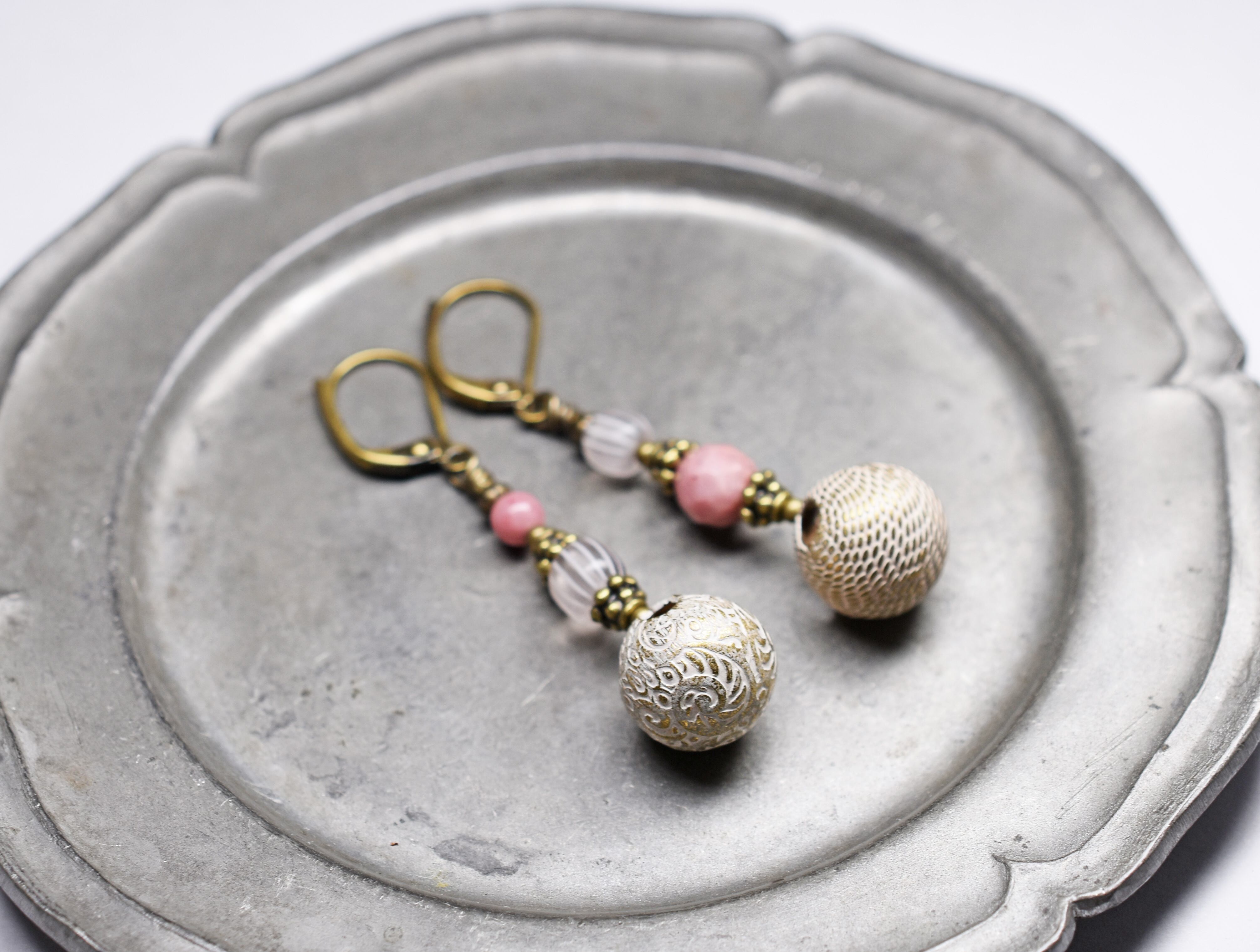 フランスのデッドストックメタルパーツとグーズベリー、天然石を合わせたピアスです。