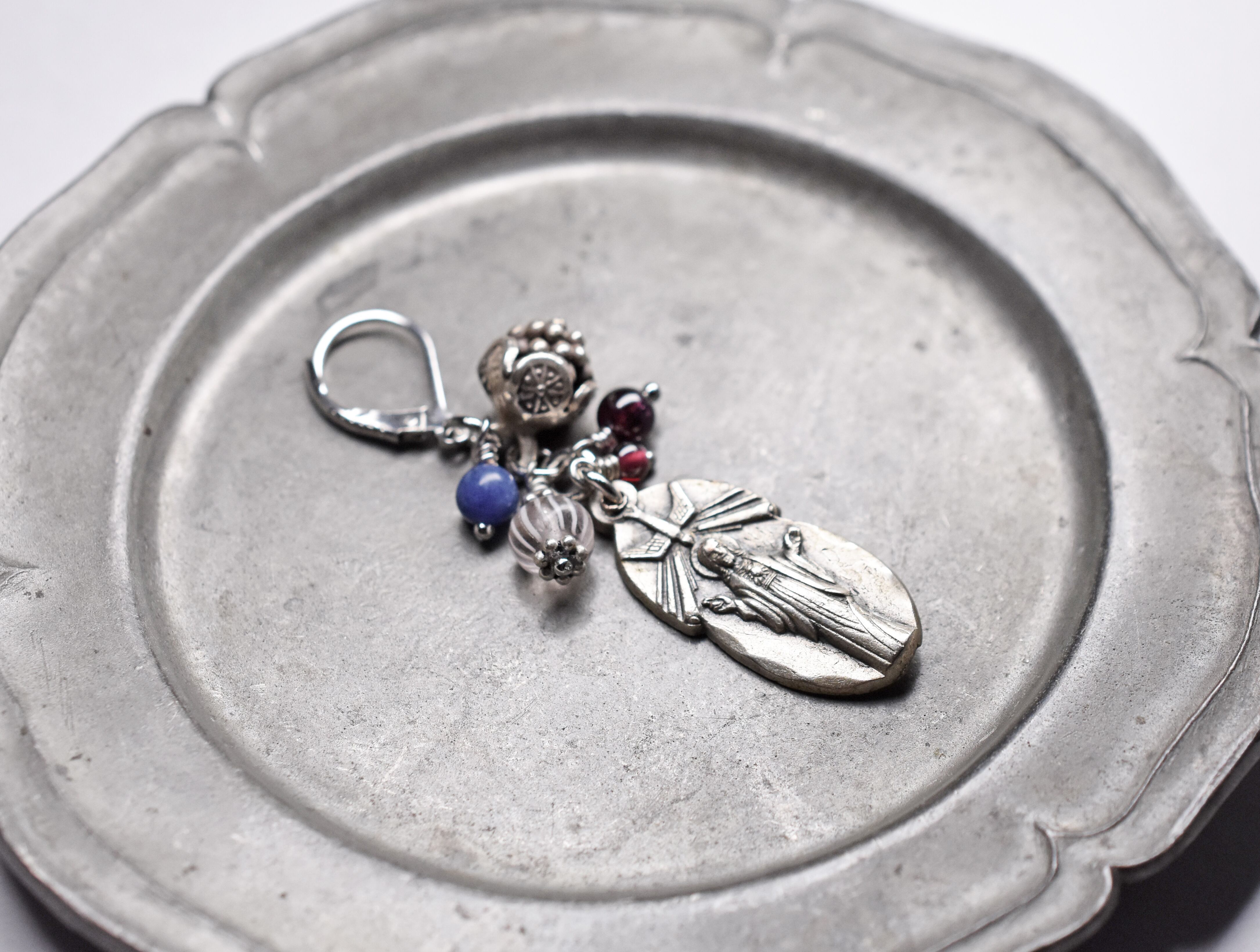 イタリア製のメダイとコロンと丸いカレンシルバー のお花、天然石とアンティークビーズを合わせた、片耳のピアスです。