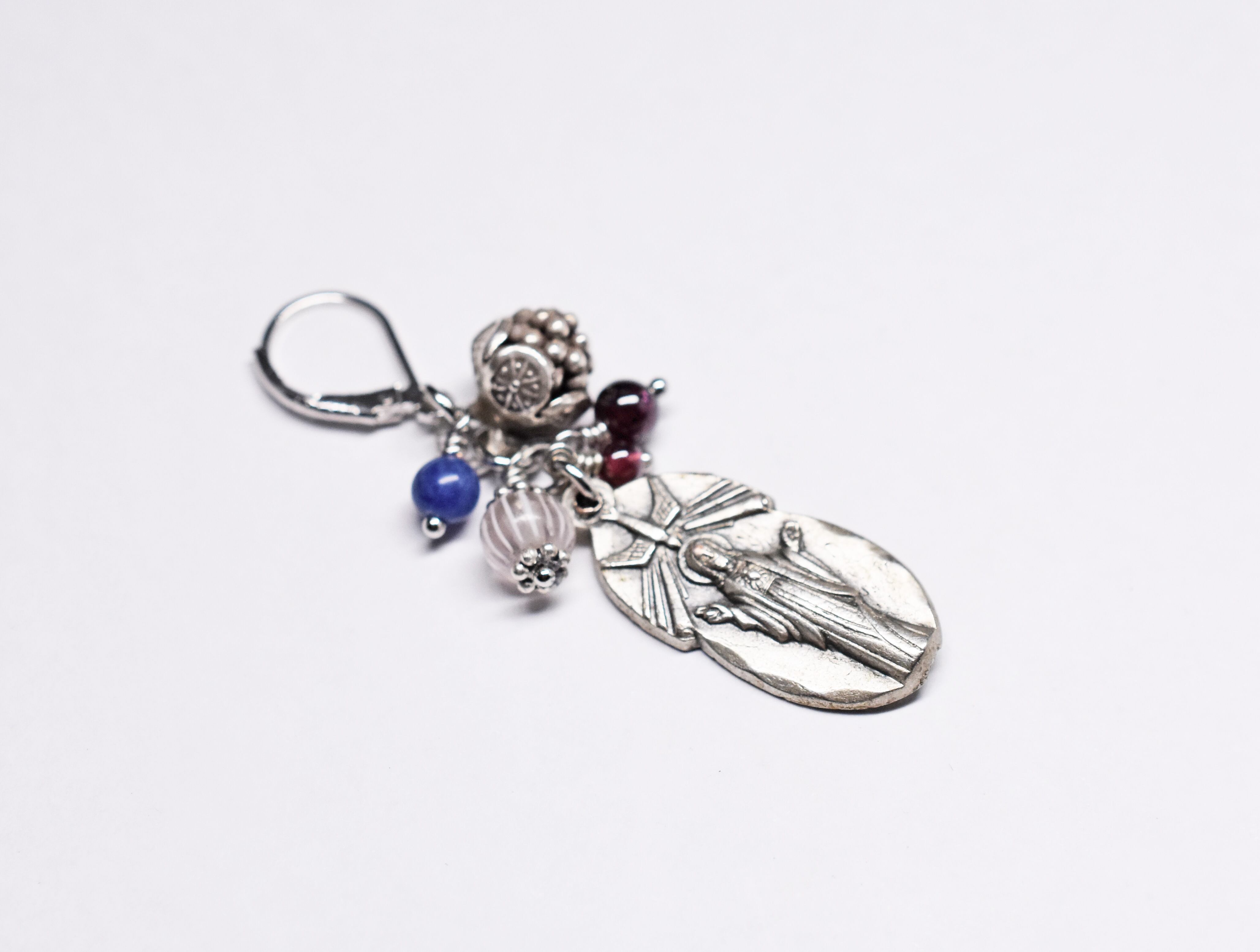 キリストのメダイとカレンシルバー、天然石、グーズベリーの片耳ピアス
