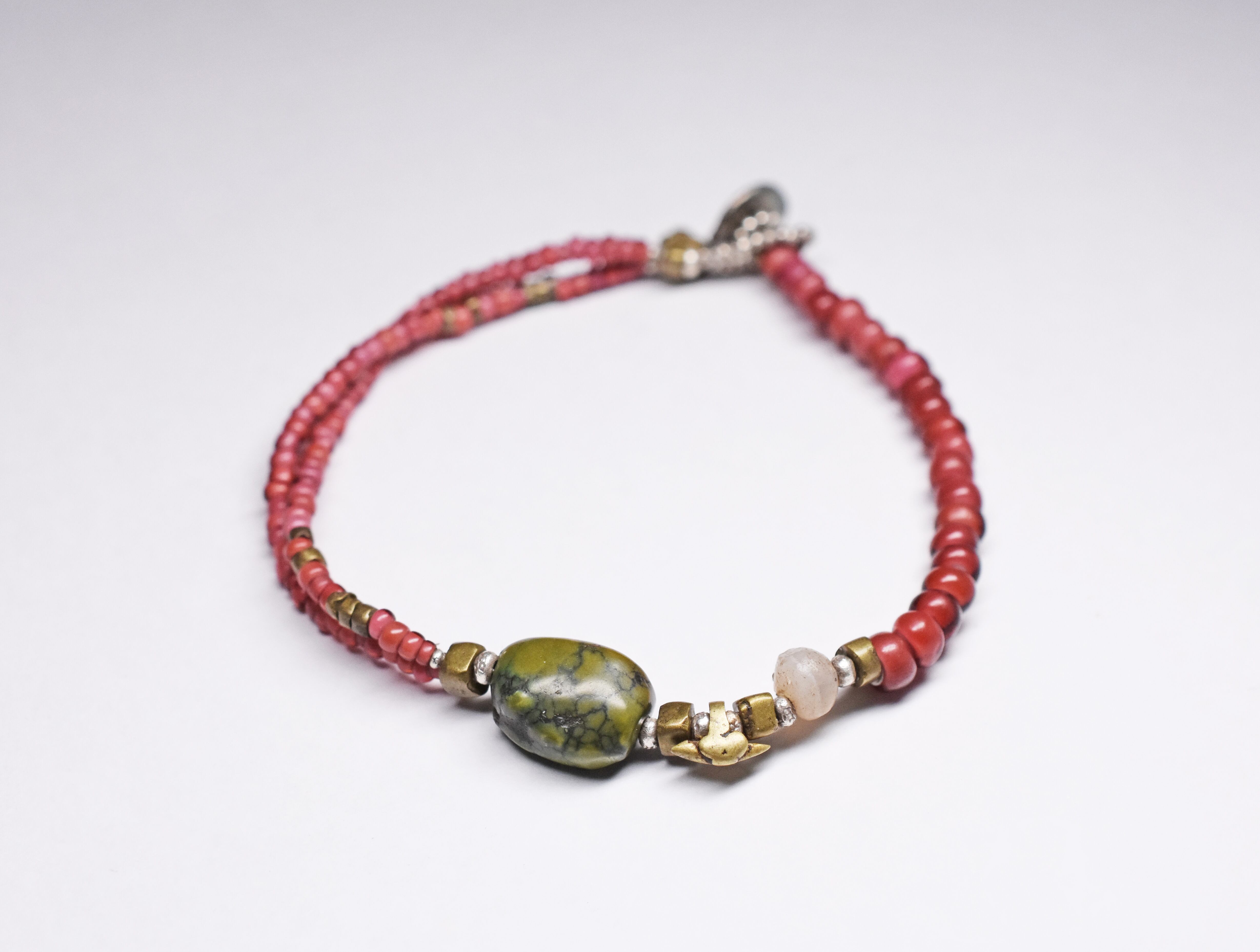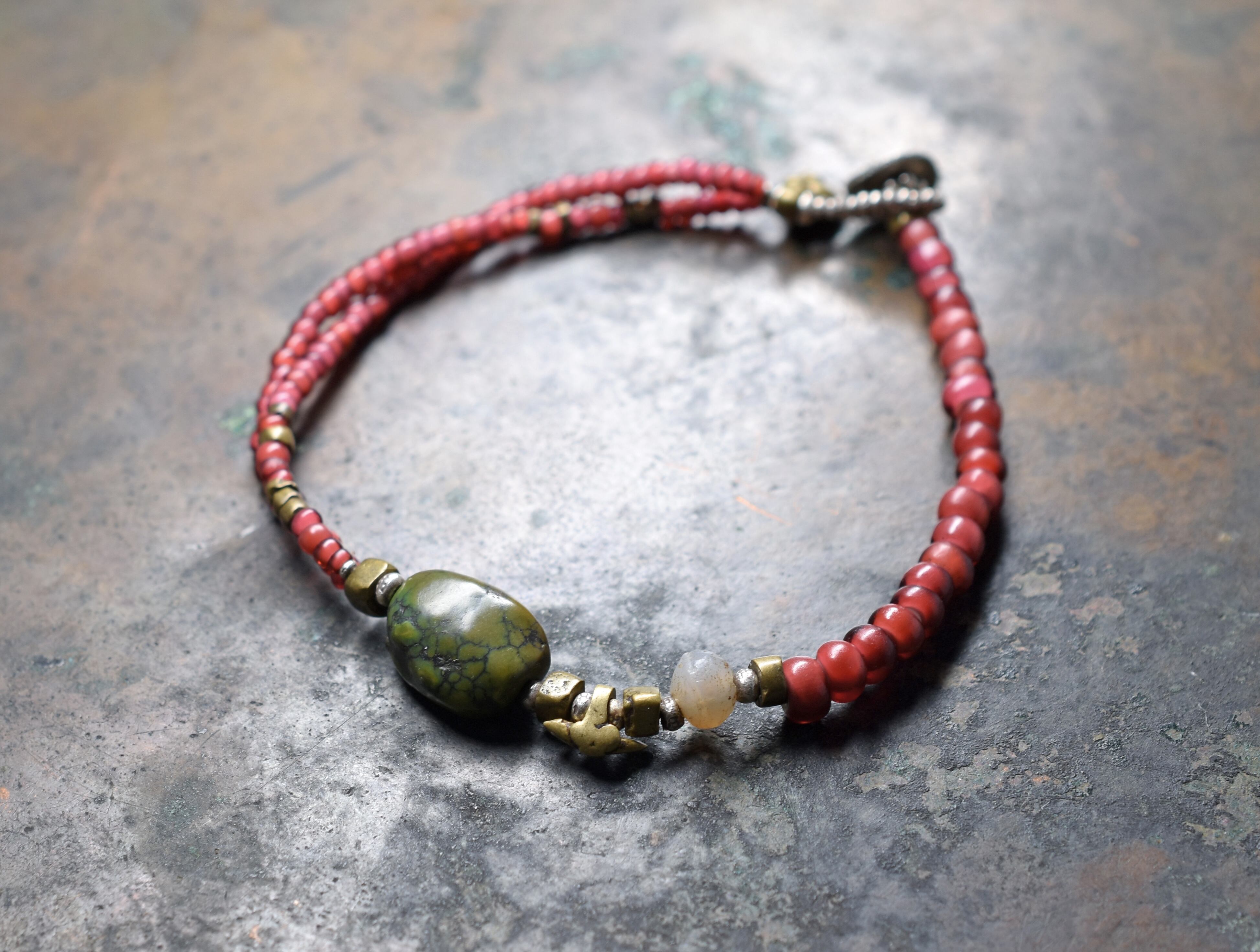 oldチベタンターコイズと、古代瑪瑙、金赤ホワイトハーツ、oldオリッサブラスのブレス