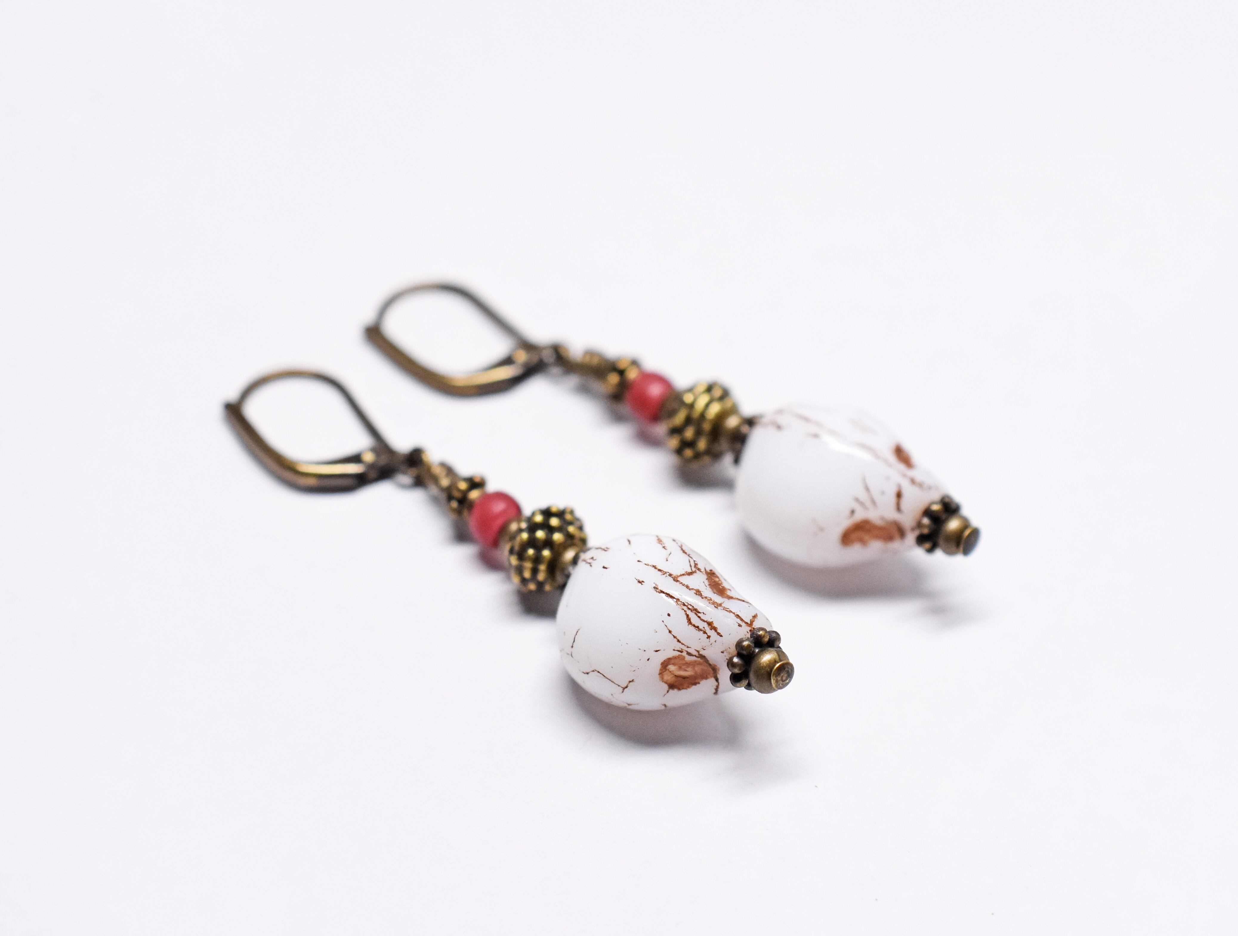 チェコ産のスカラビーズと、金赤のホワイトハーツを繋いだピアスです。