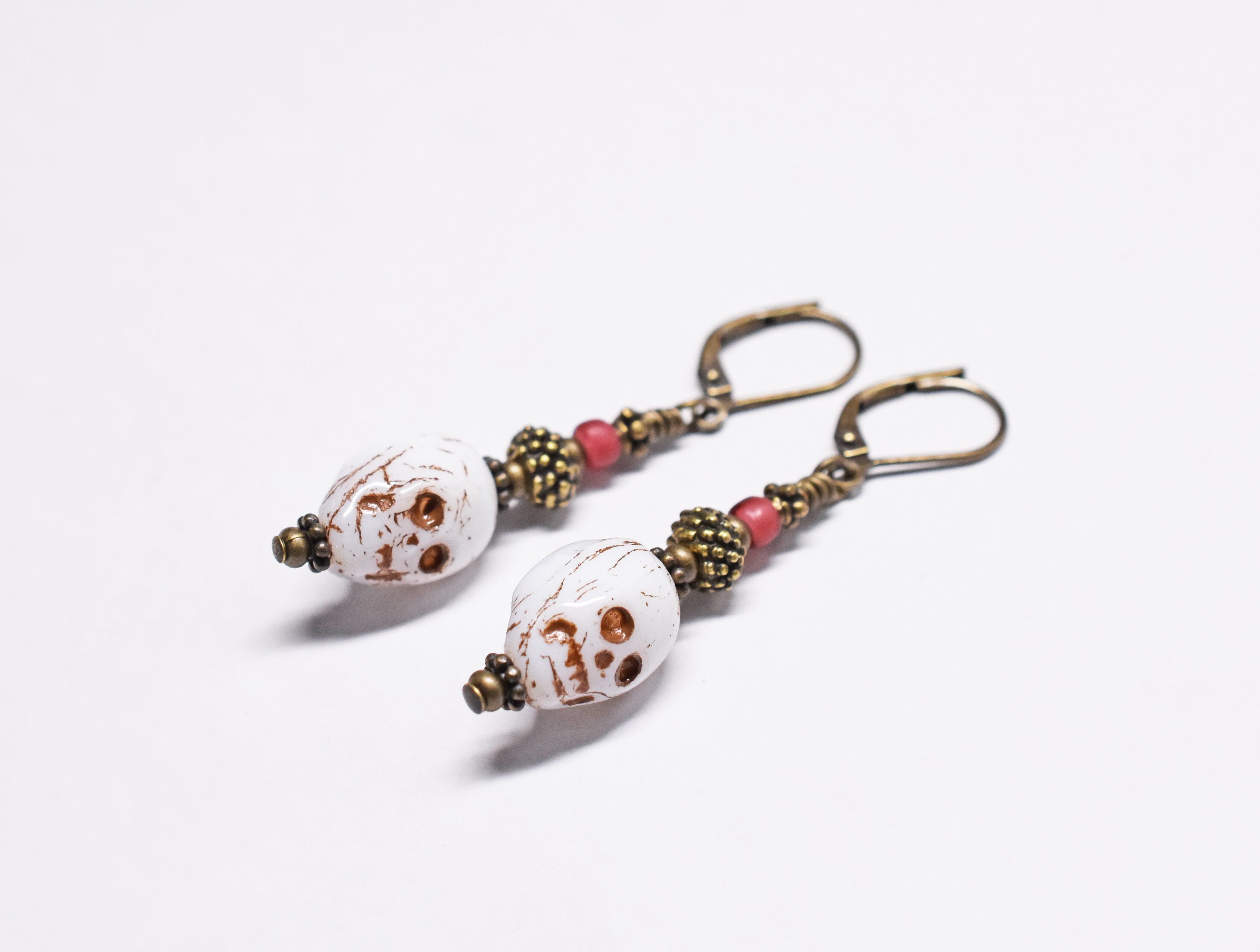 チェコ産スカルビーズと金赤ホワイトハーツのピアス