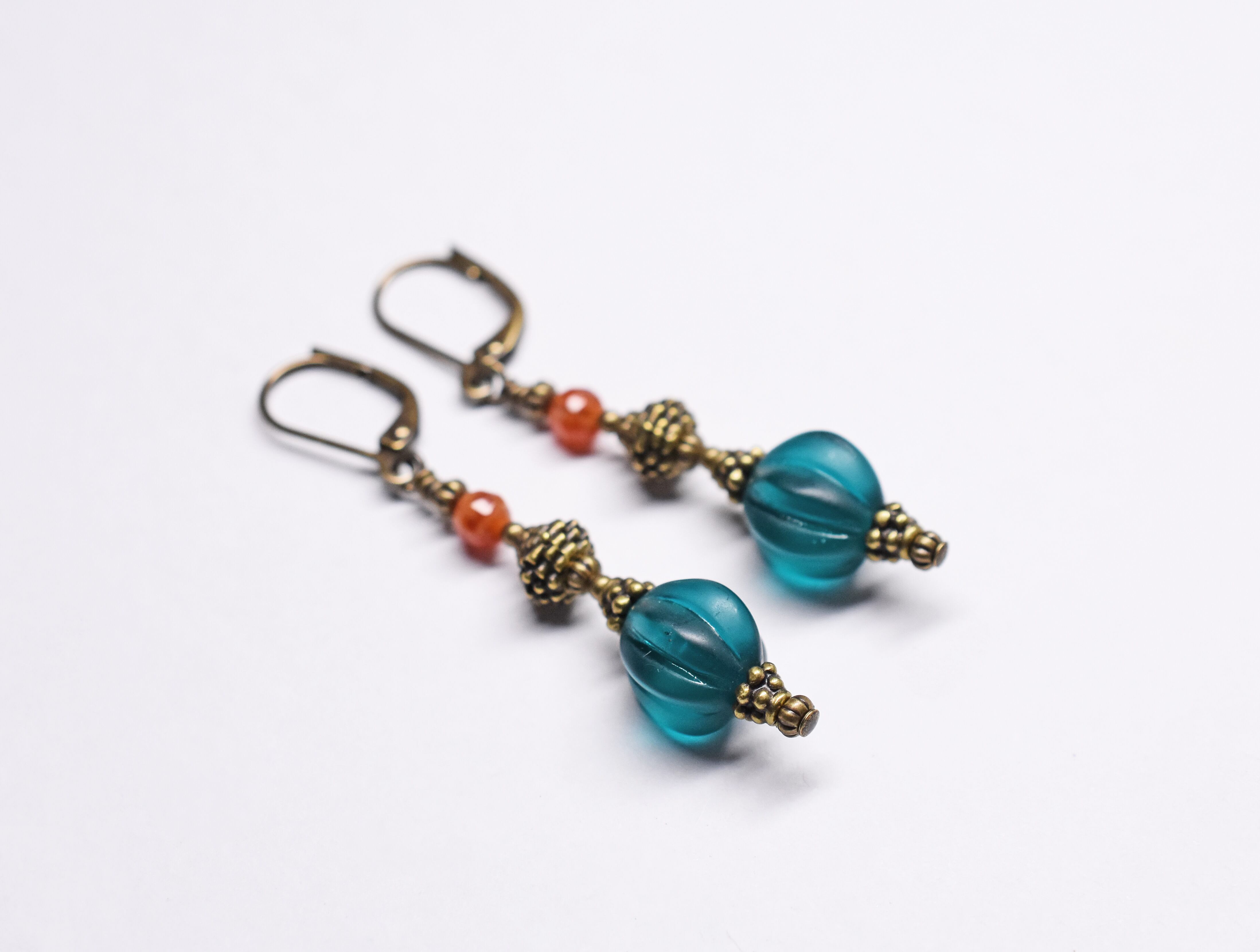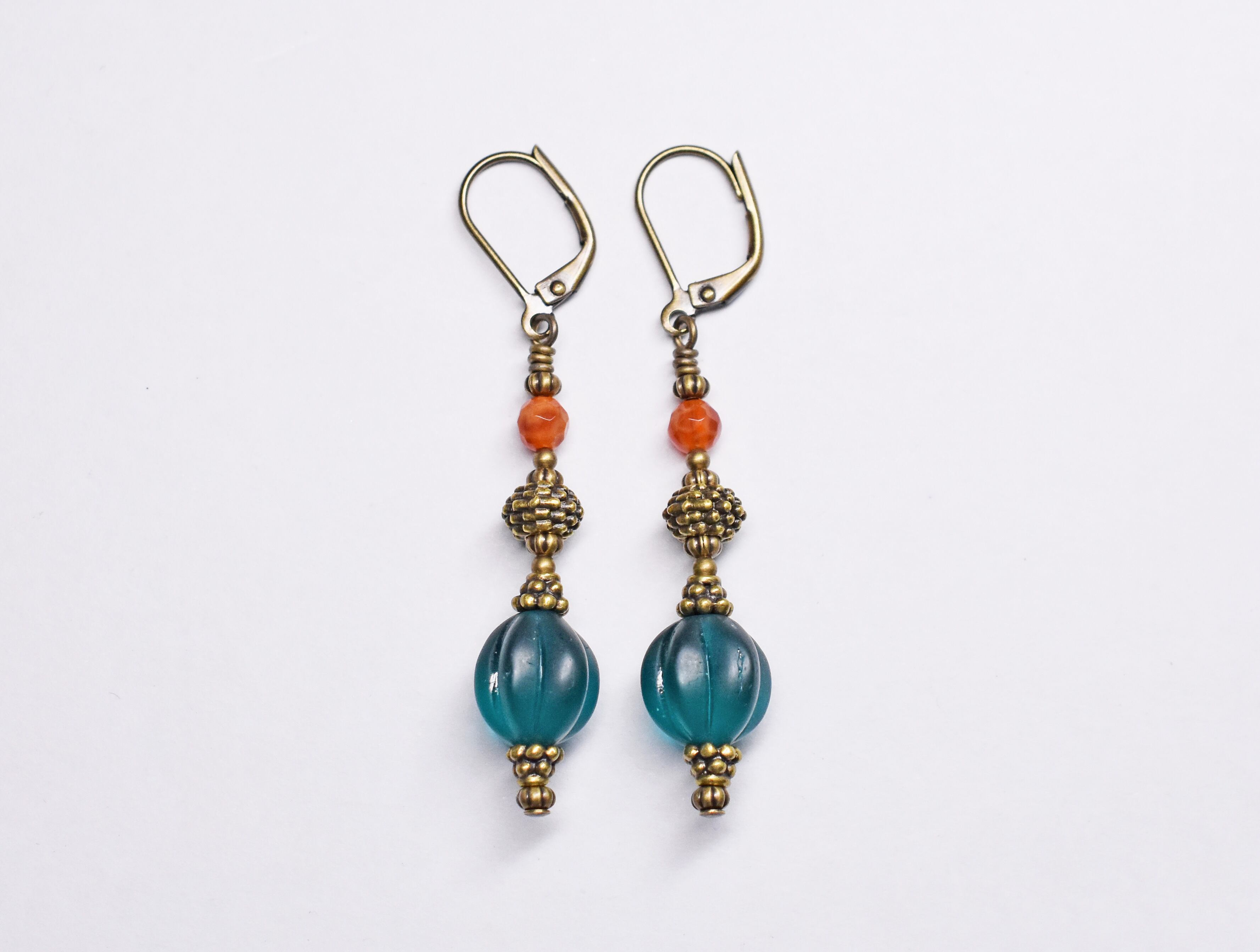 浅葱色蜜柑玉ドイツヴィンテージビーズとブラスビーズ、ファイアーアゲートのピアス