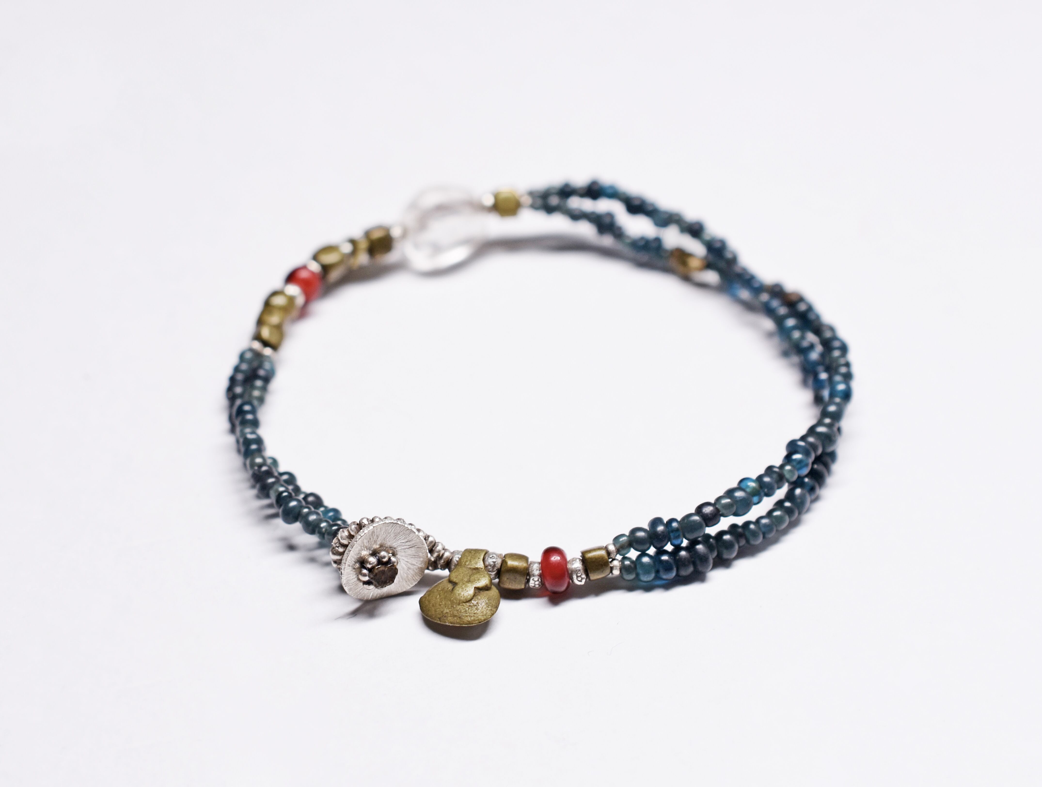 古代水晶、インディゴブルーのアンティークビーズ、ホワイトハーツ、oldオリッサブラスを繋いだ2連のブレスです。