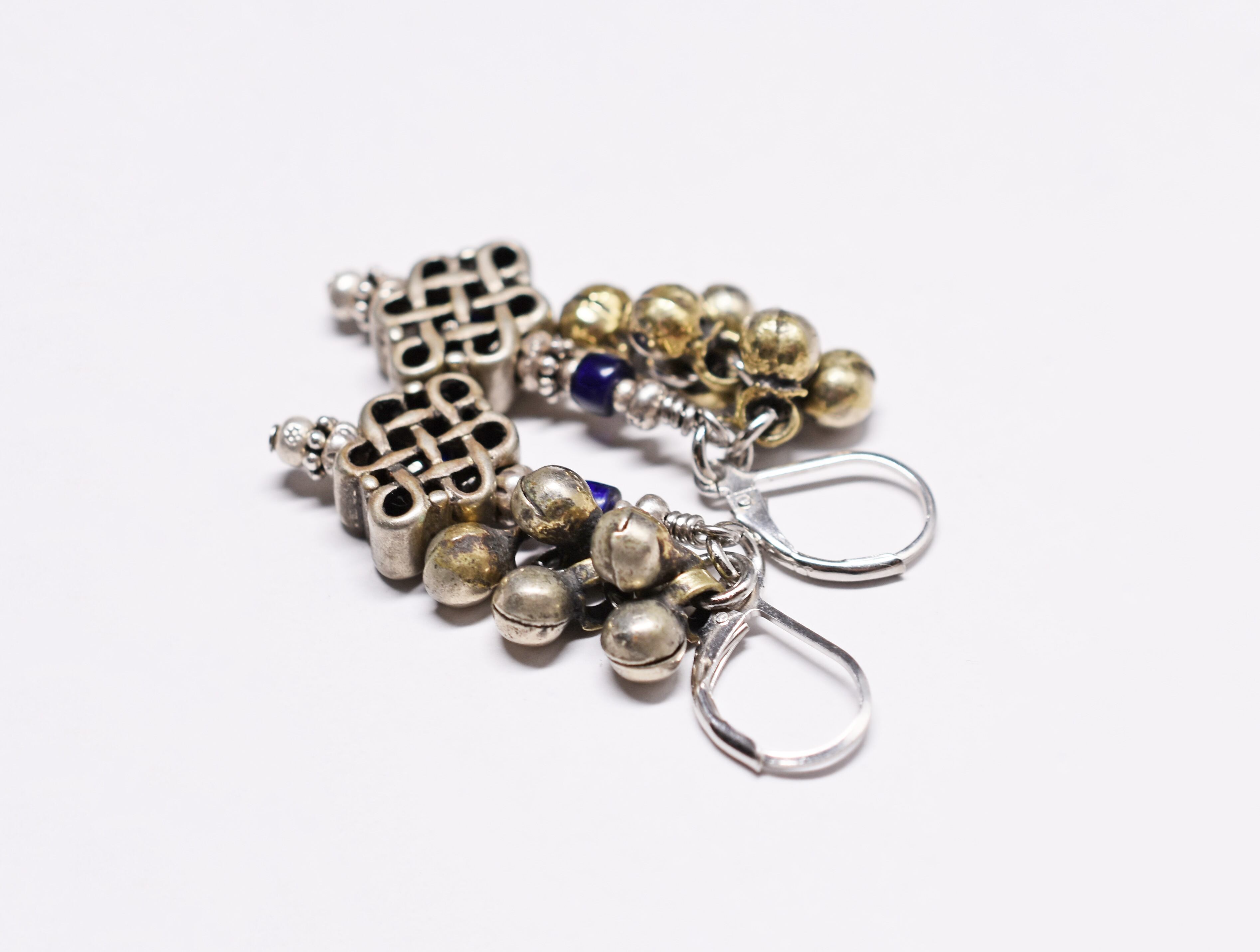 エンドレスノットモチーフと、民族の鈴、瑠璃色のアンティークビーズを繋いだピアスです。