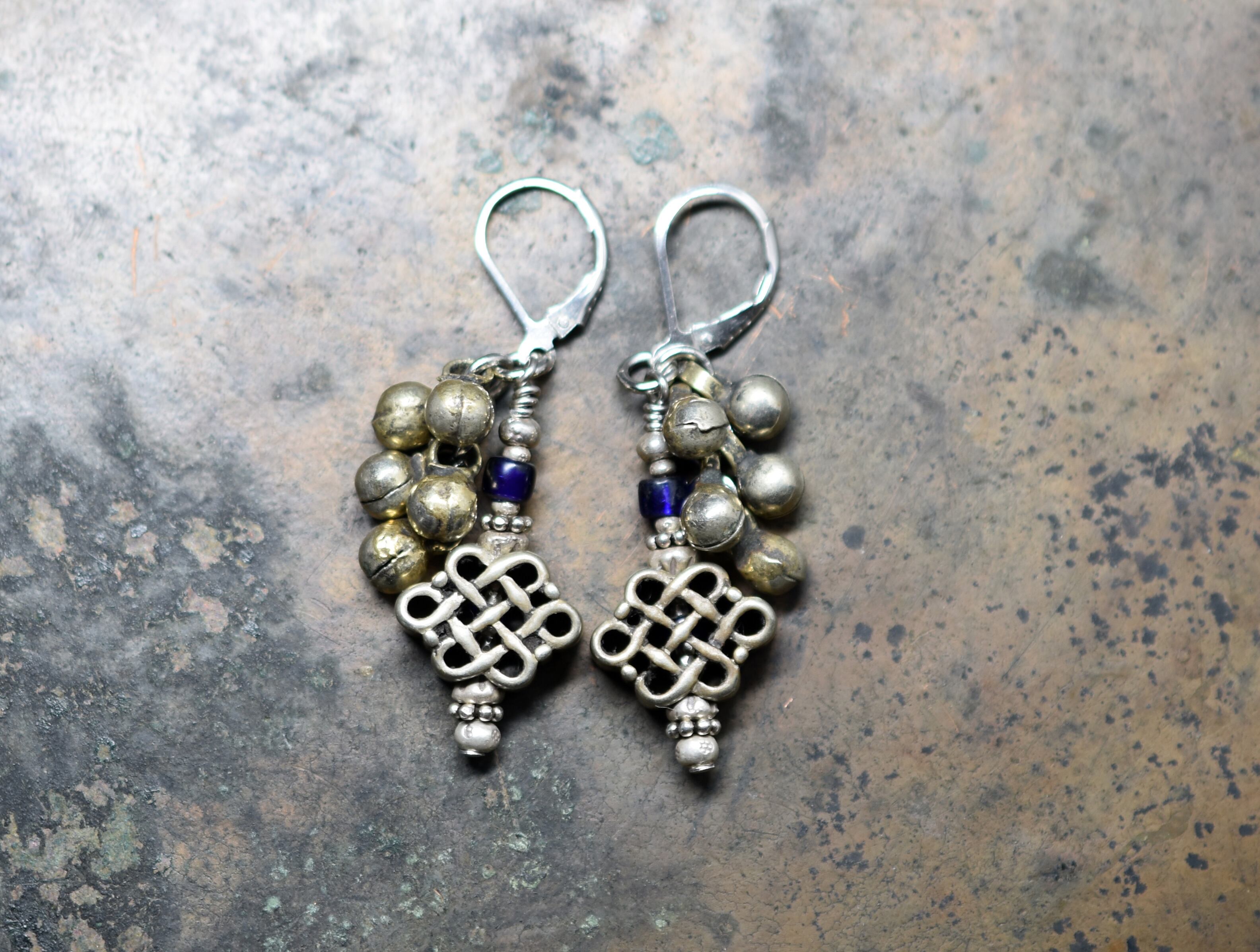 エンドレスノットと民族鈴、瑠璃色アンティークビーズのピアス