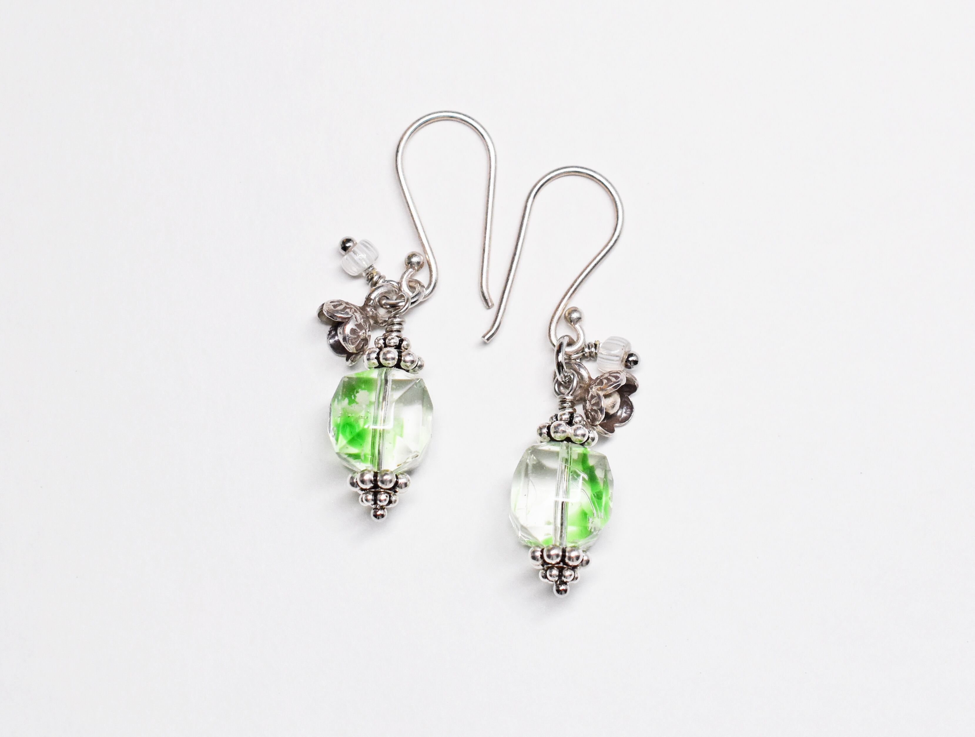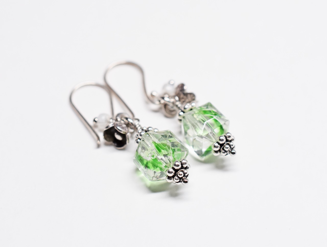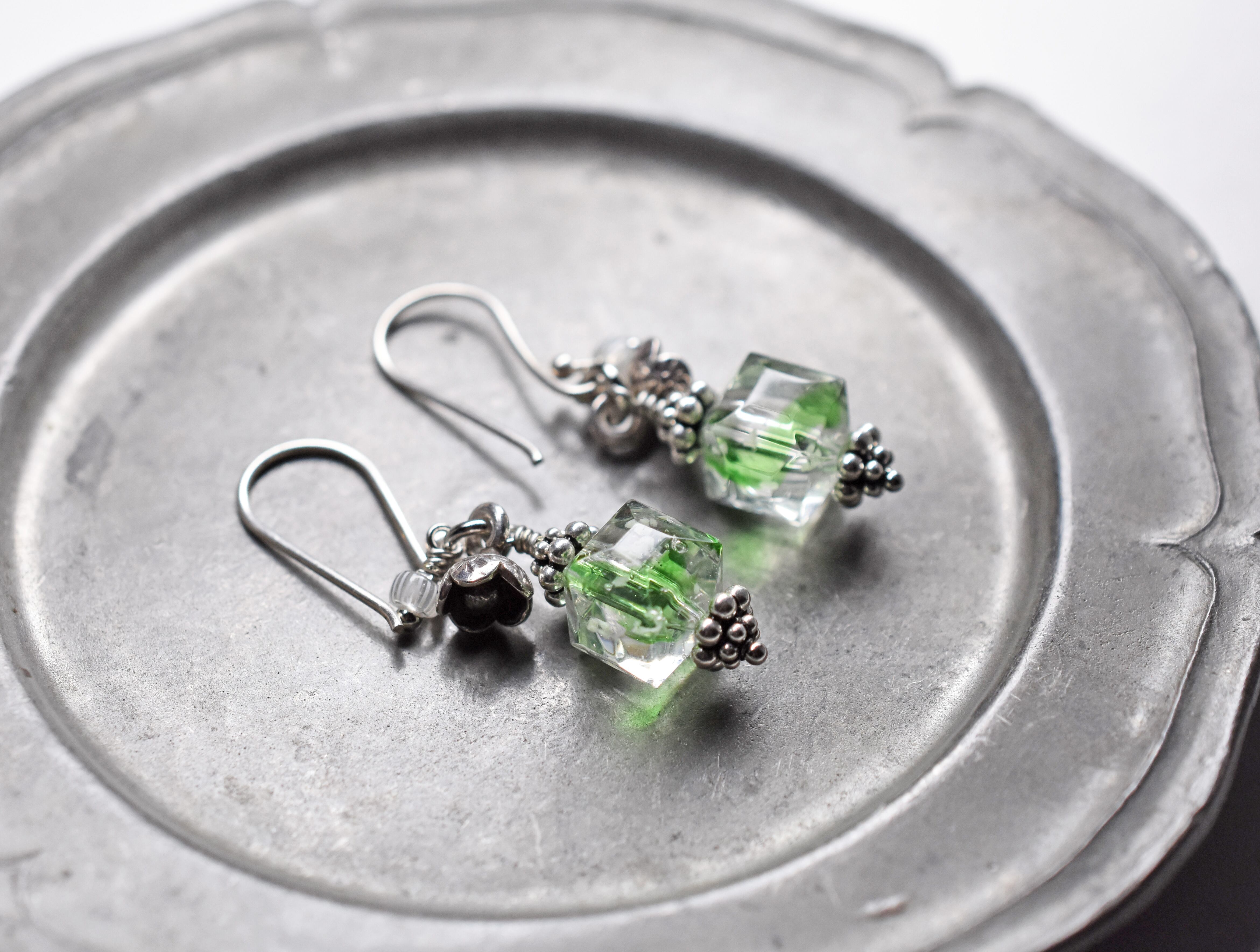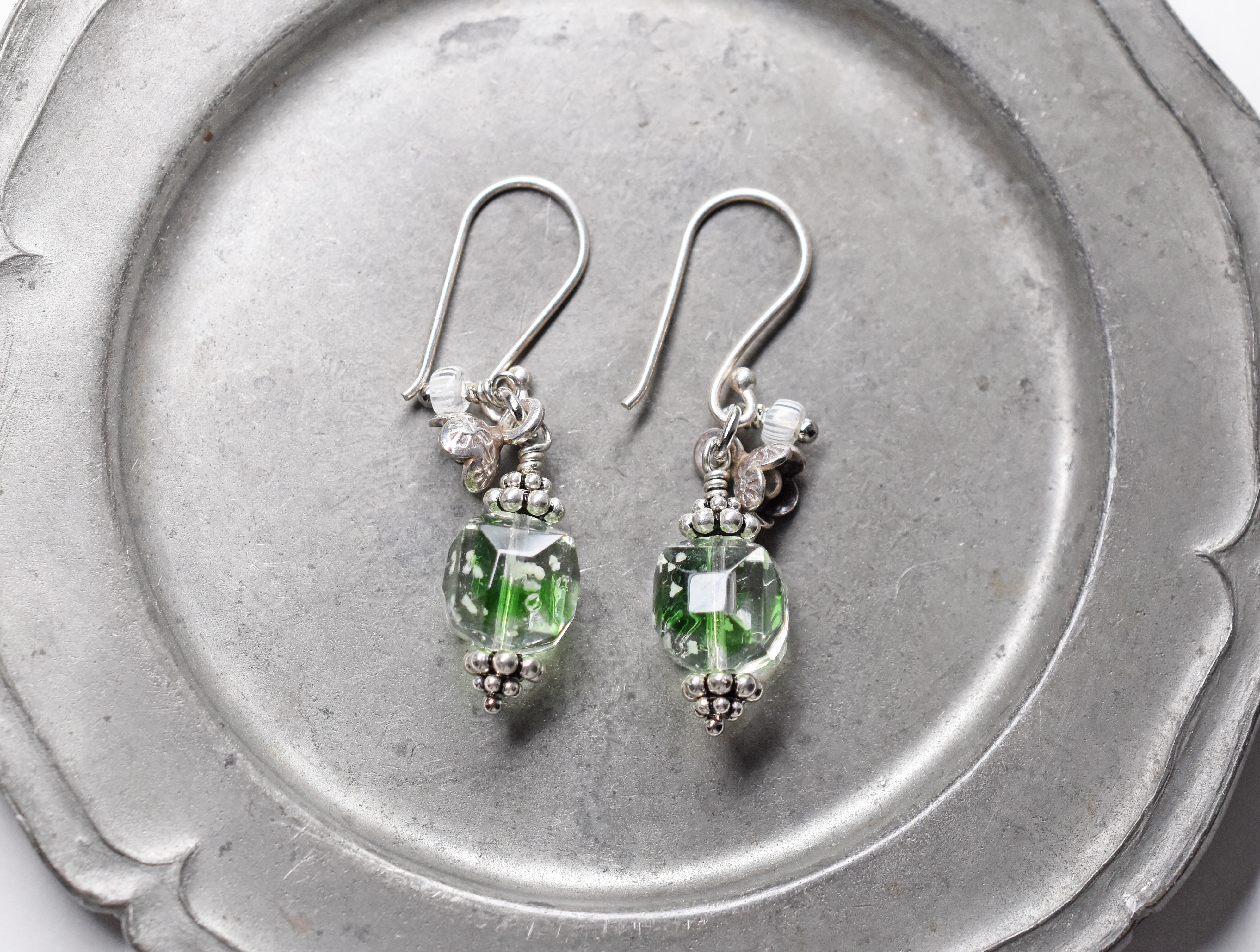スクエアウラングラスとグーズベリー、カレンシルバーの小さなお花のピアス