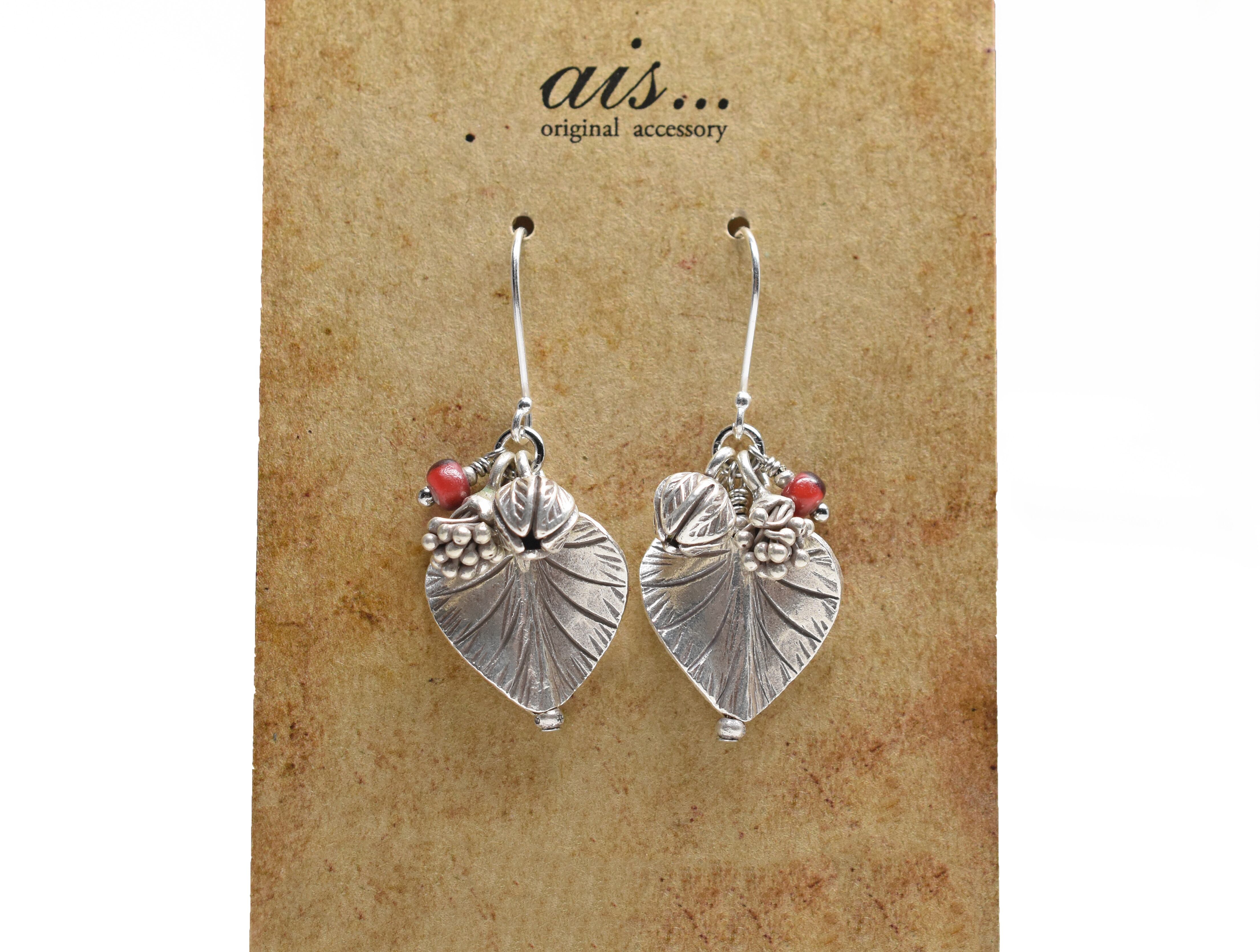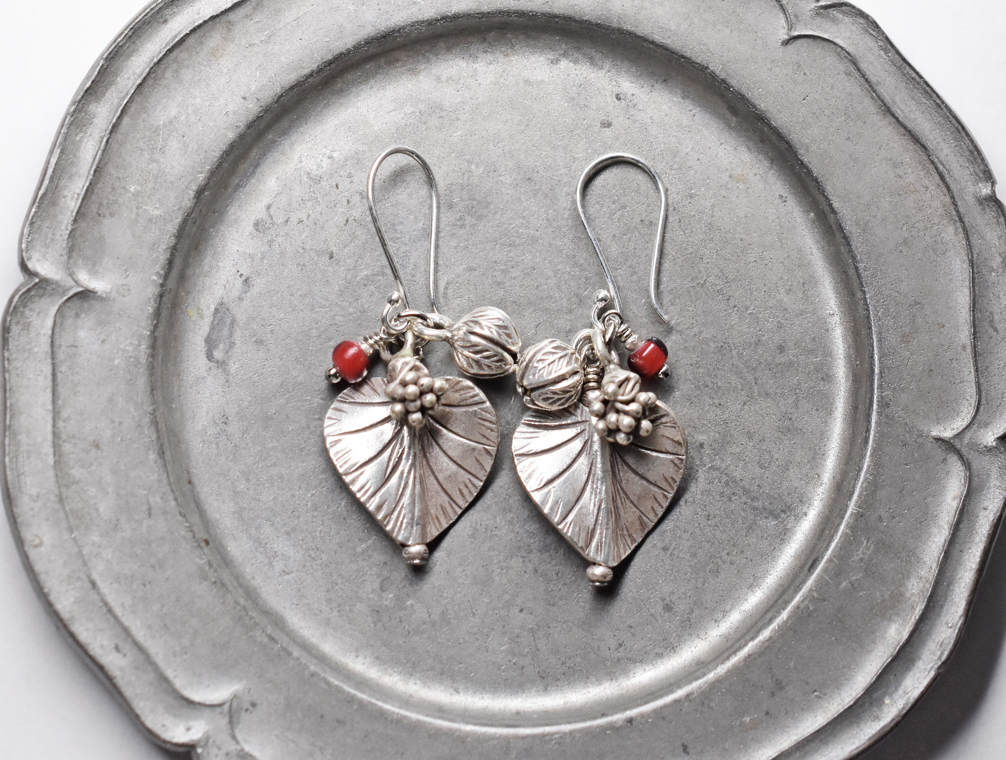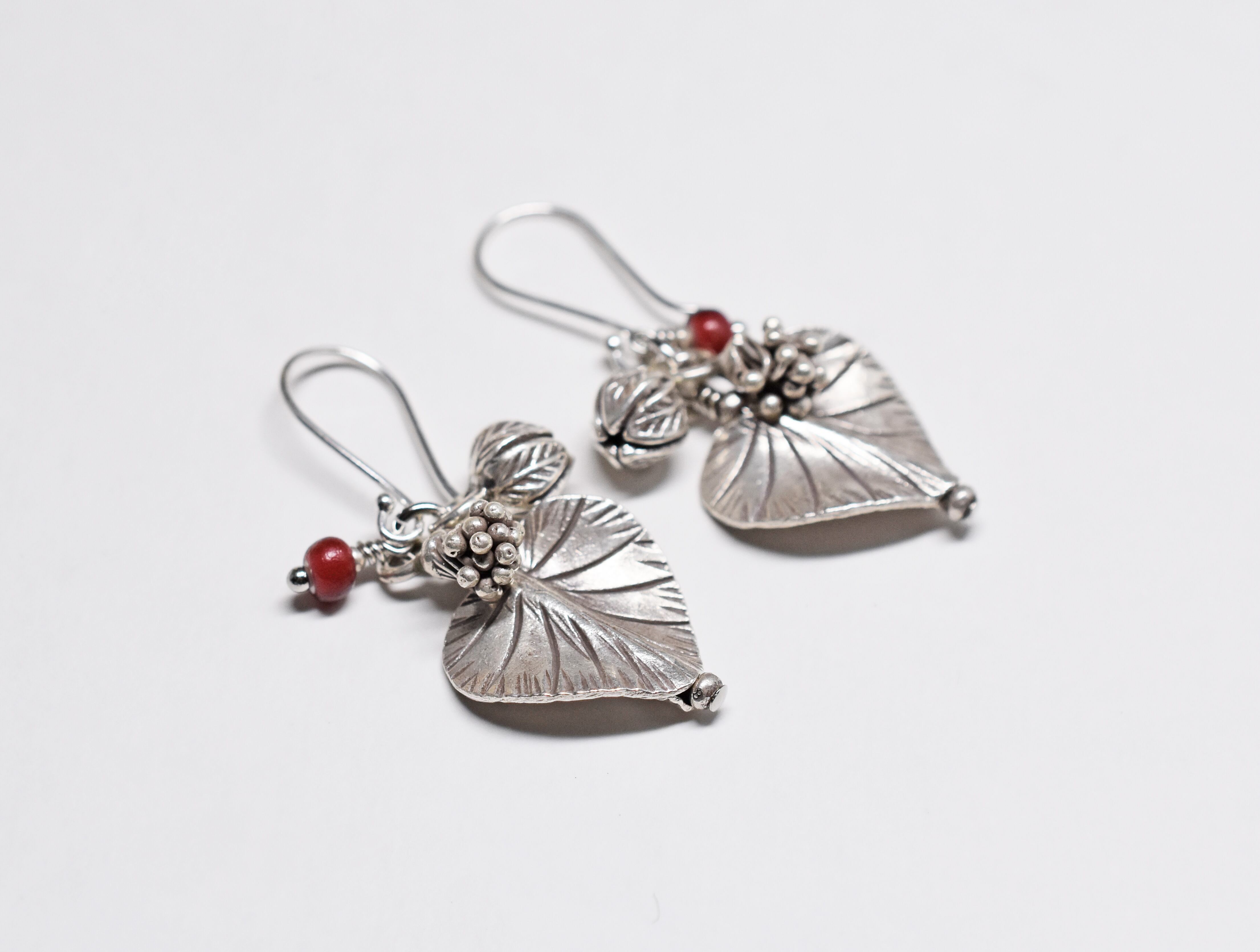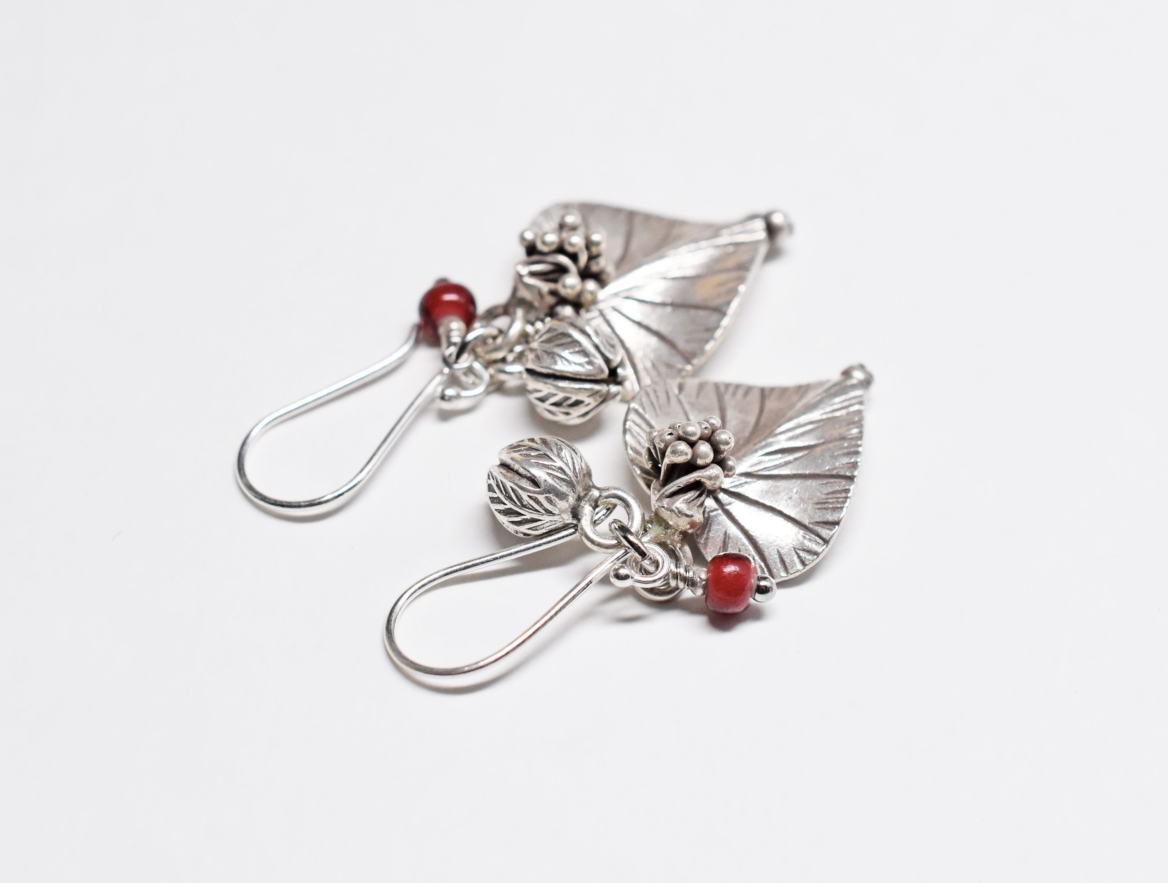 葉っぱと、蕾のような2種類のカレンシルバーと、赤いアンティークビーズを一粒繋いだピアスです。