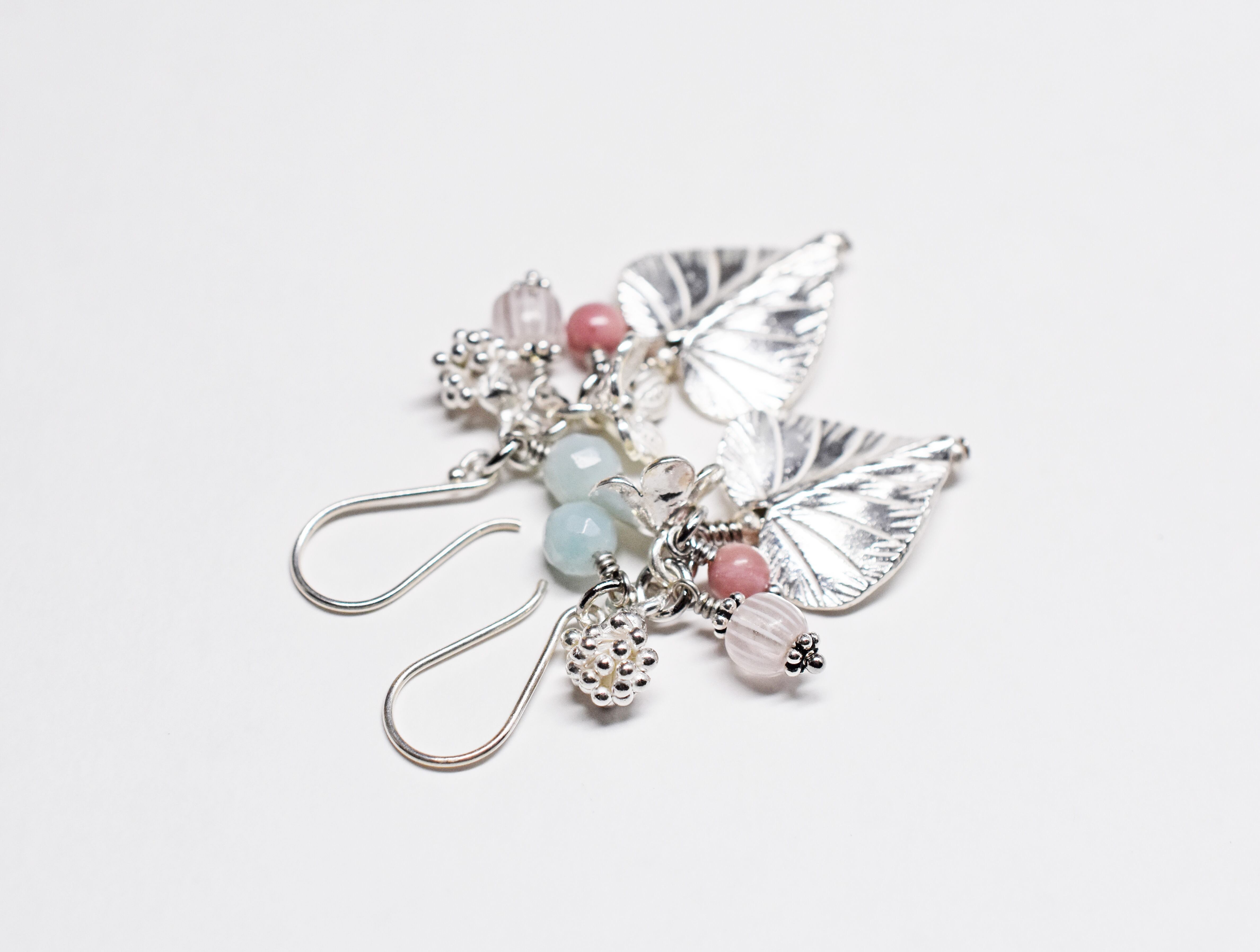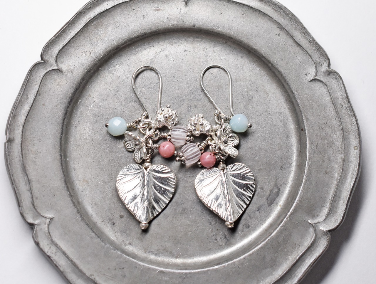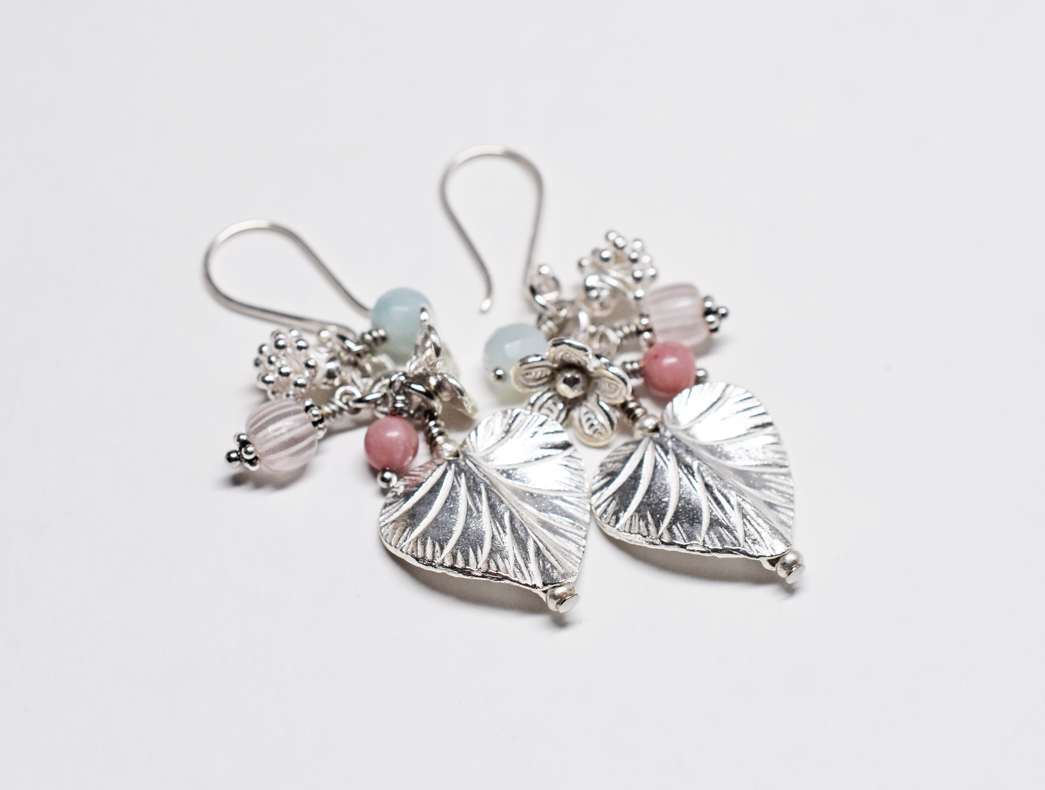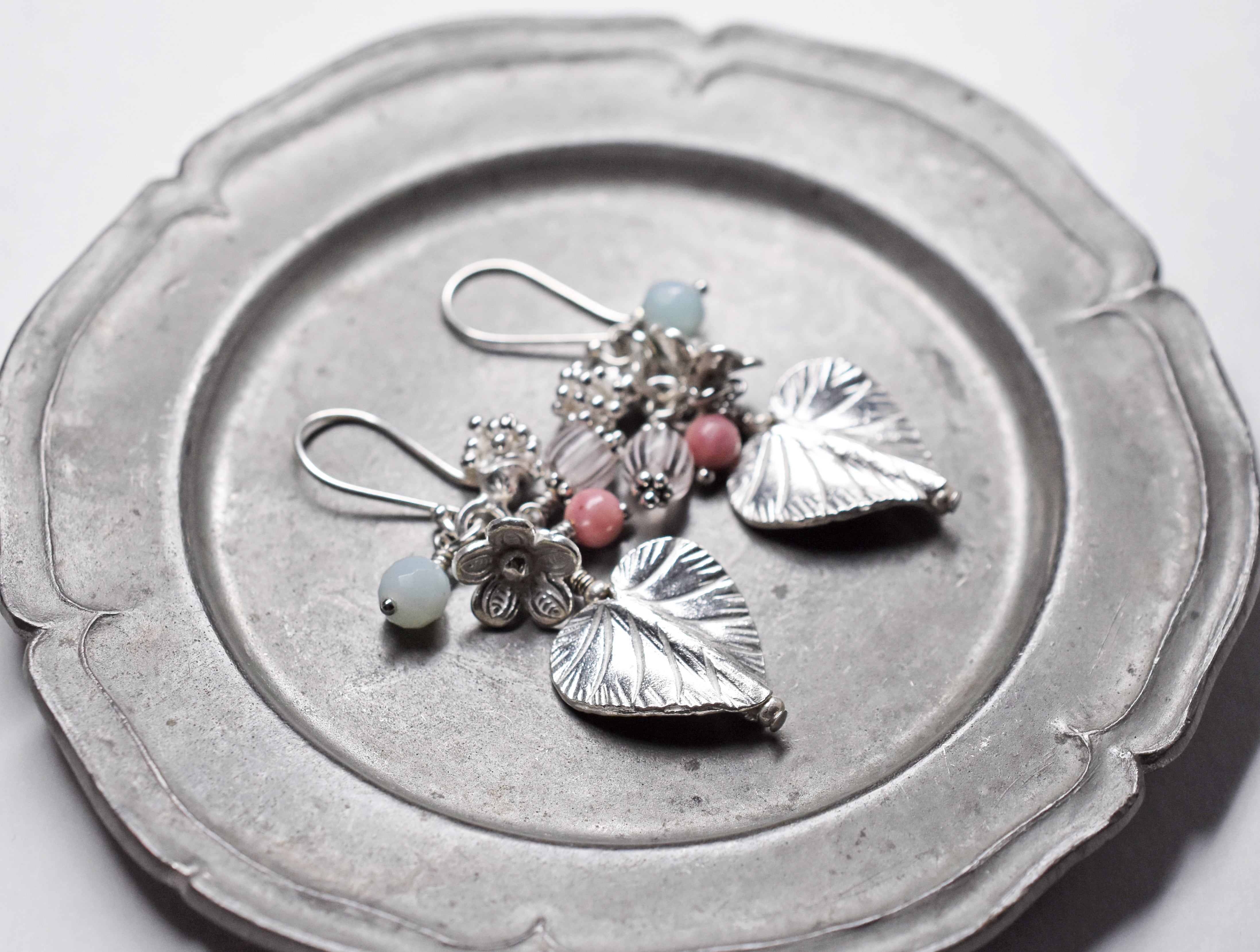 ハート型の葉っぱと蕾&お花カレンシルバー、ロードナイトとアマゾナイトのピアス