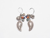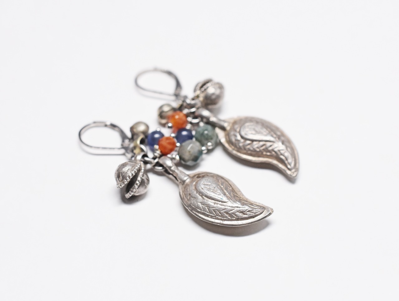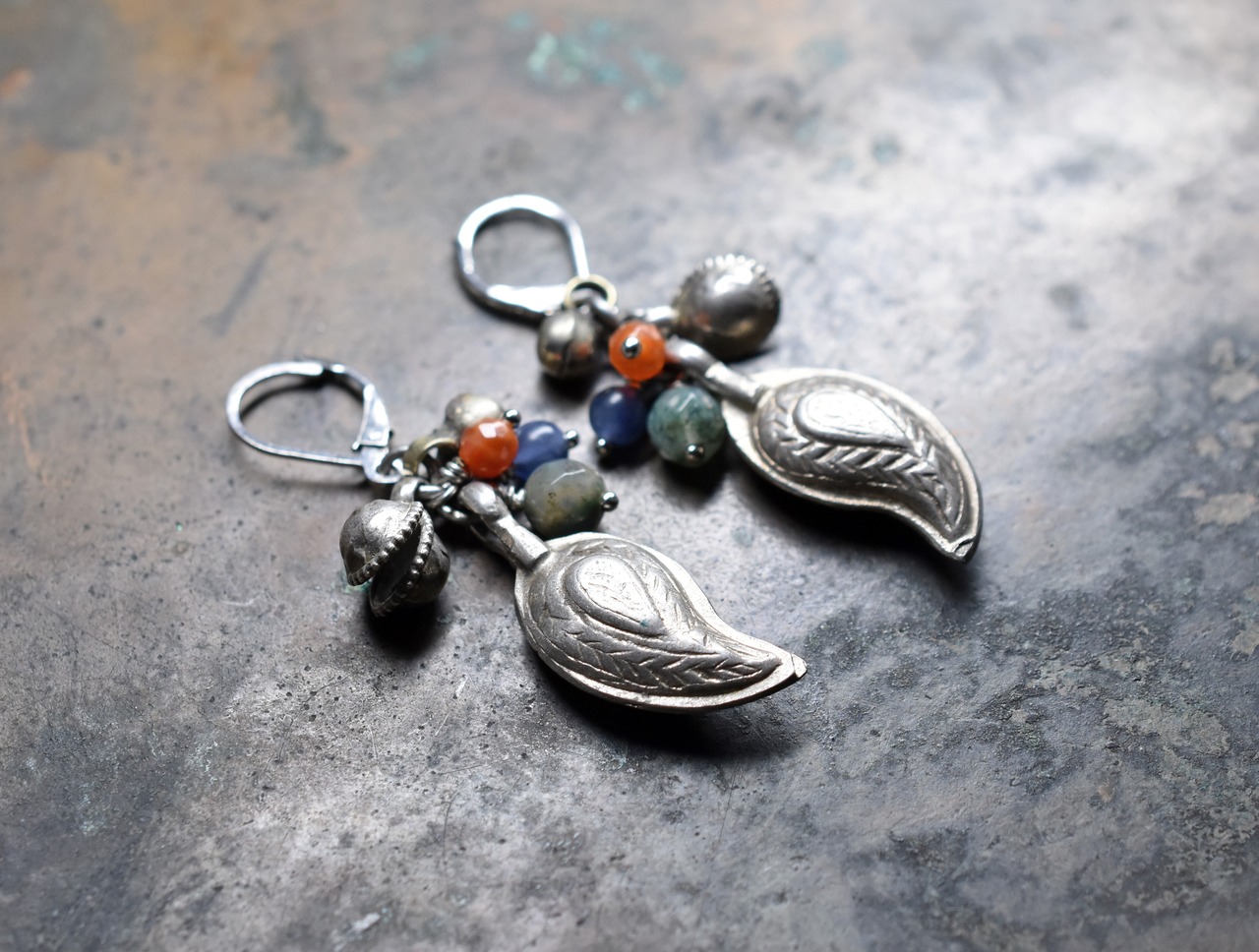 ペイズリーのようなパーツとベルに、小さな鈴、3種類の天然石を繋いだピアスです。