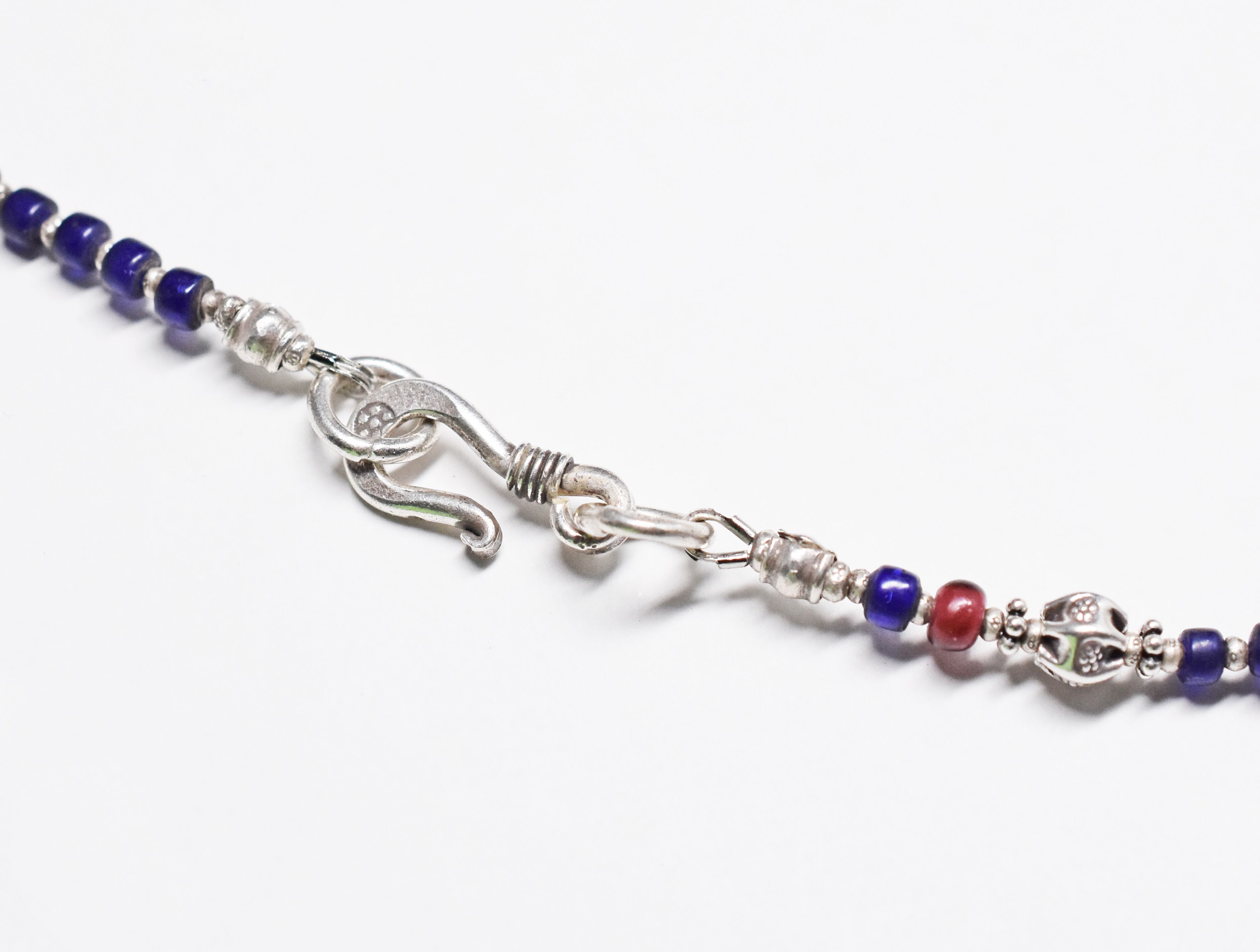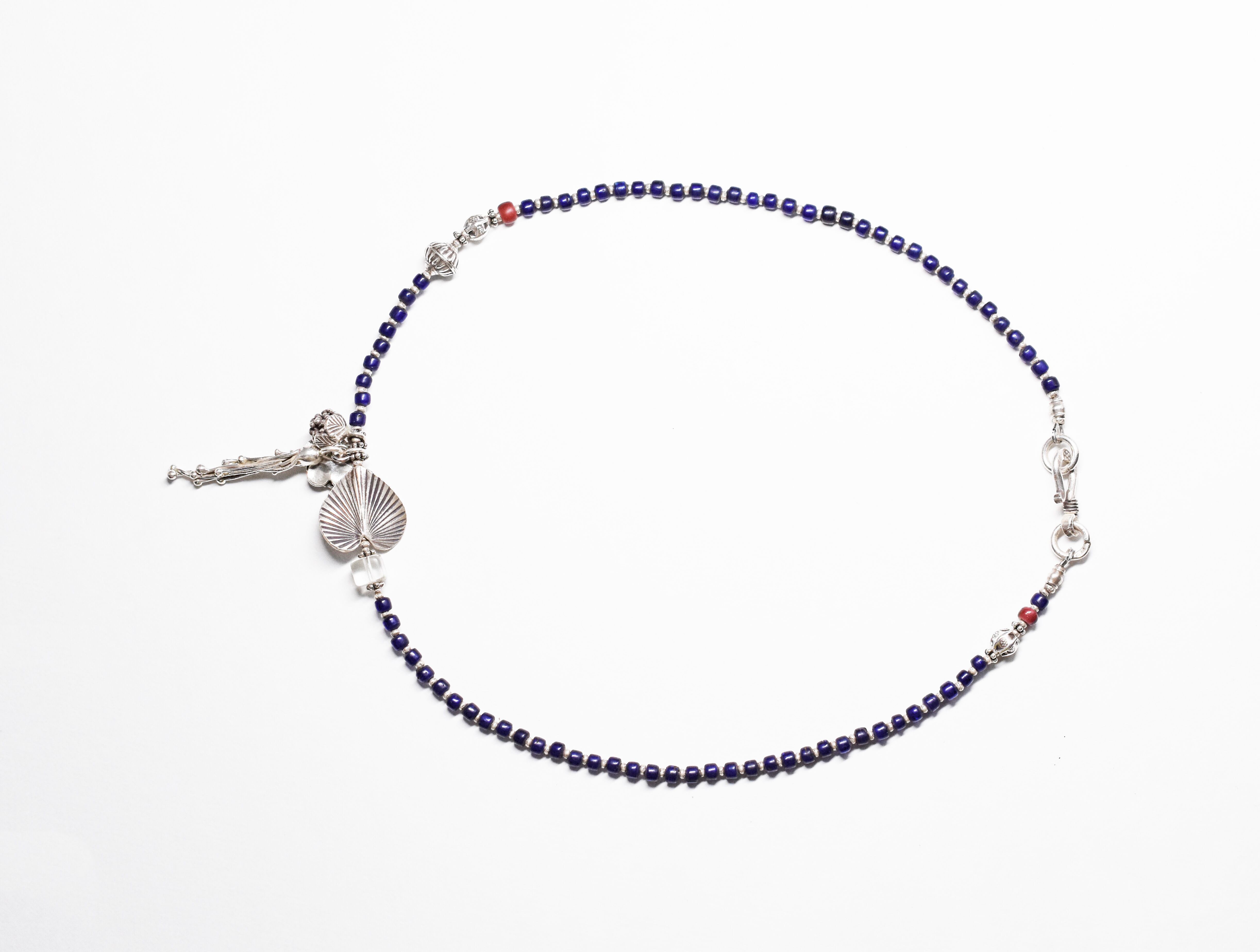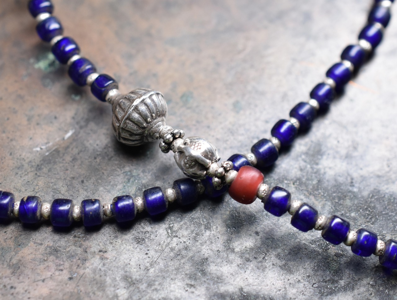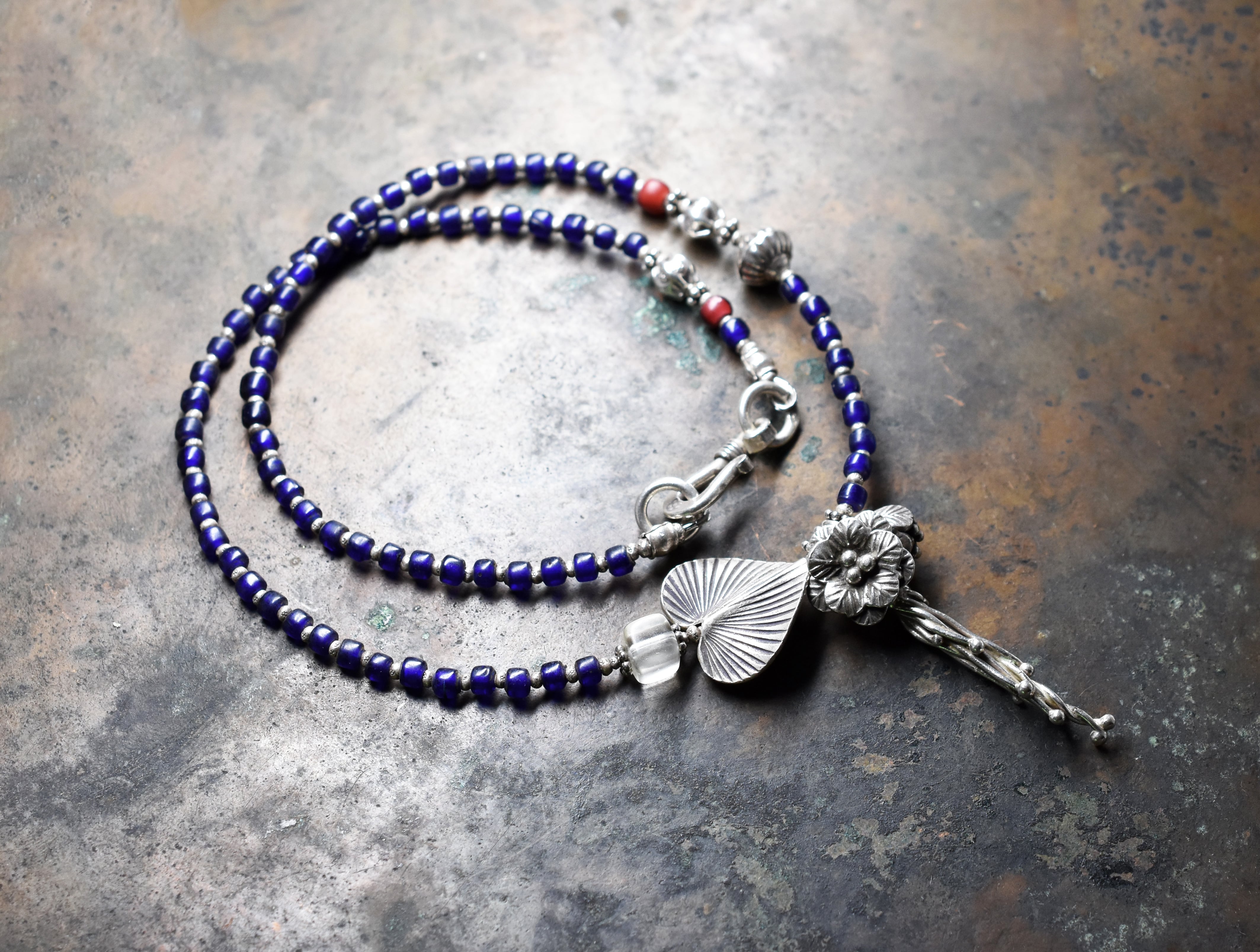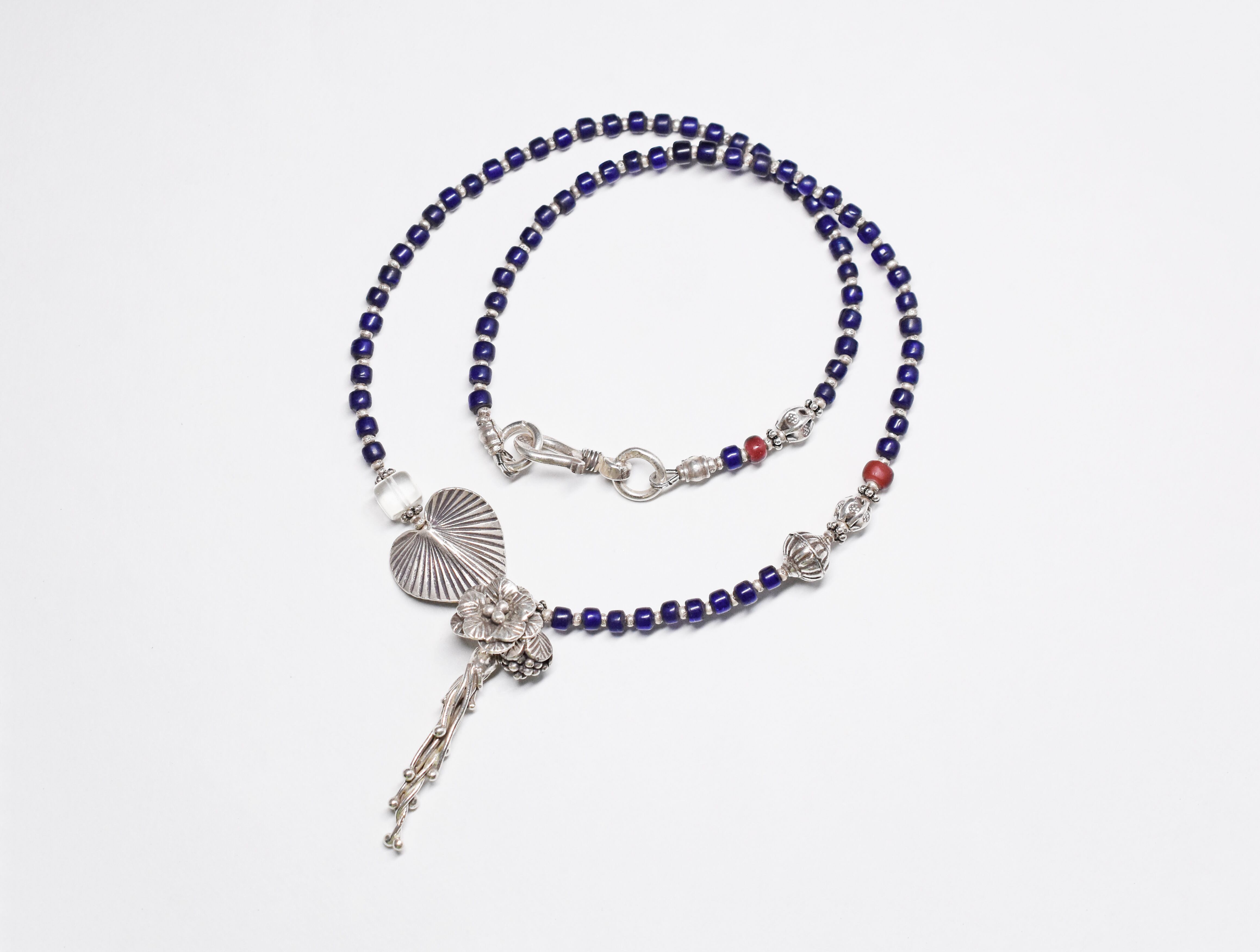 カレンシルバーのトップを瑠璃色のアンティークビーズなどで繋いだネックレスです。