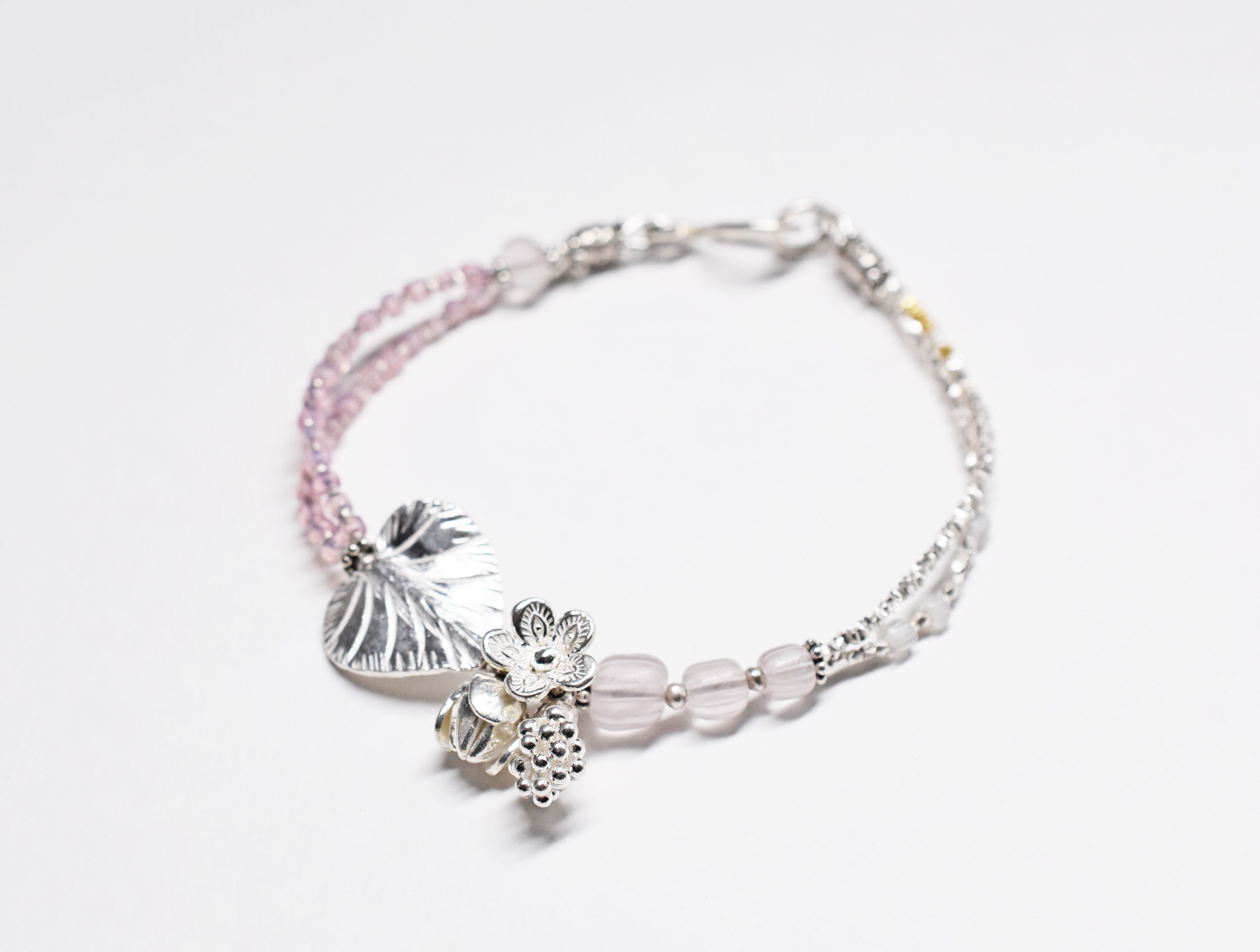 グーズベリーとボタニカルなカレンシルバー、ピンクオパールビーズのブレス
