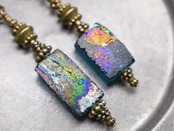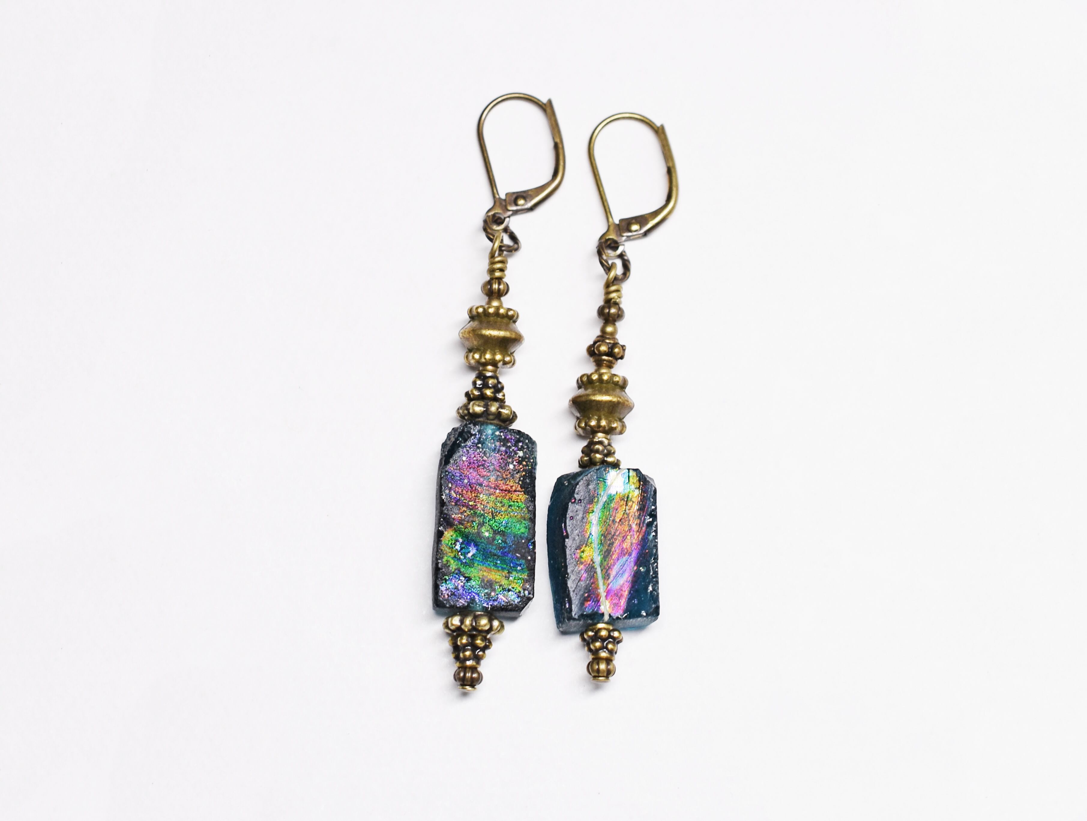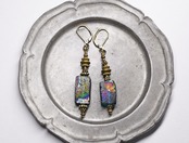 七色銀化ブルーグリーンローマングラスのアンシメトリーピアス