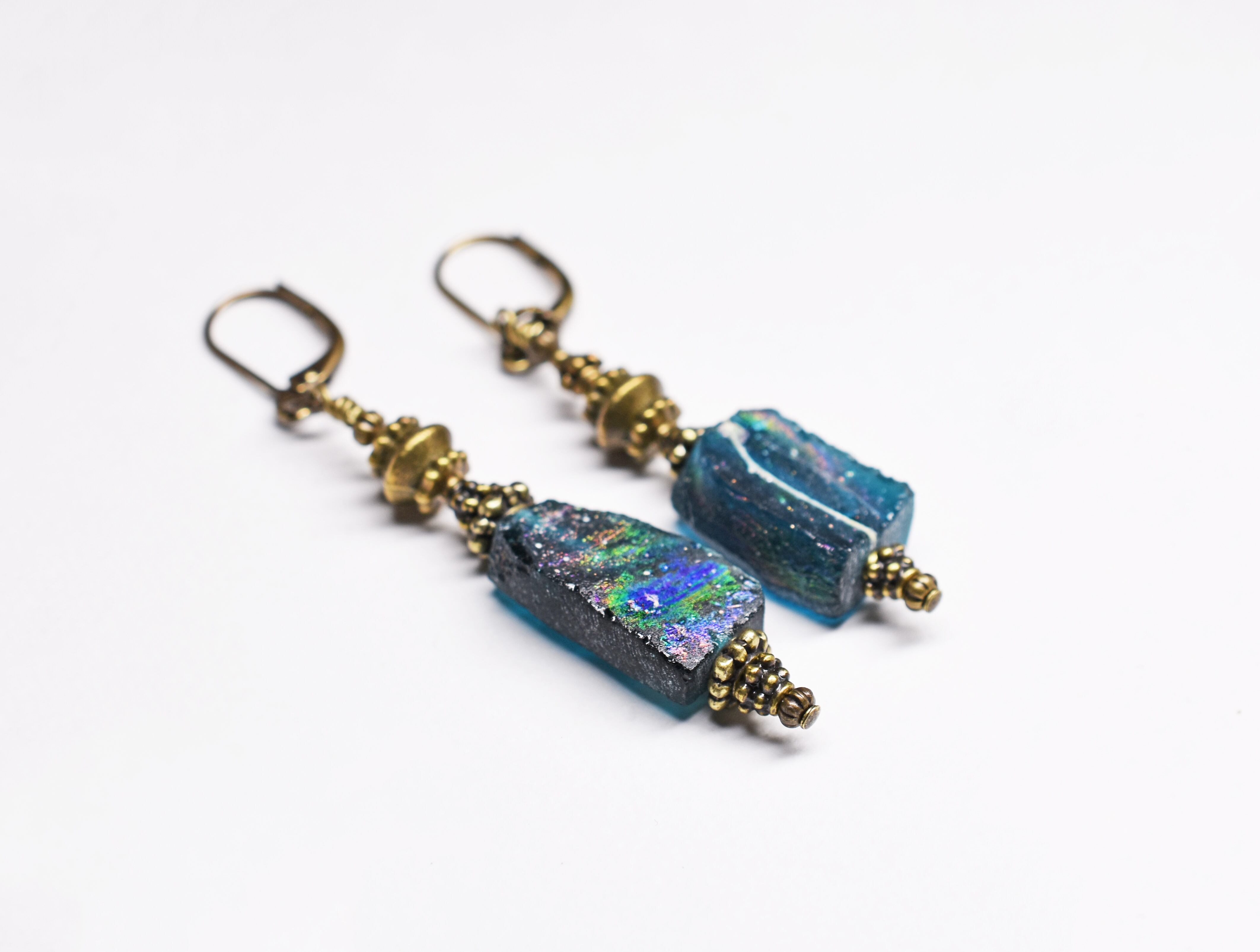 古代ガラスの美しさと、経年による味わいの佇まいを楽しめる唯一無二のピアスです。