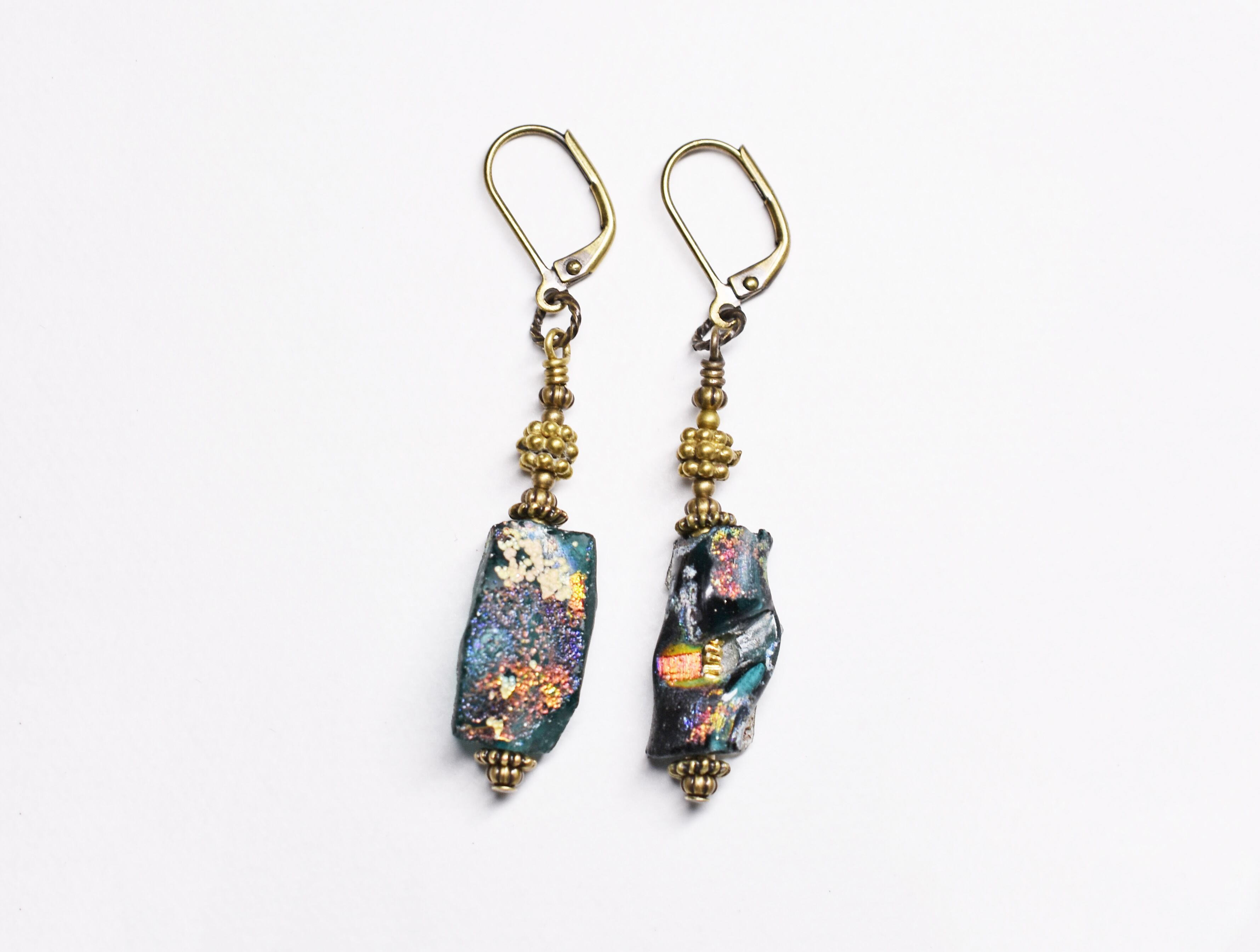 ブルーグリーンのローマングラスを繋げたアンシメトリーなピアスです。