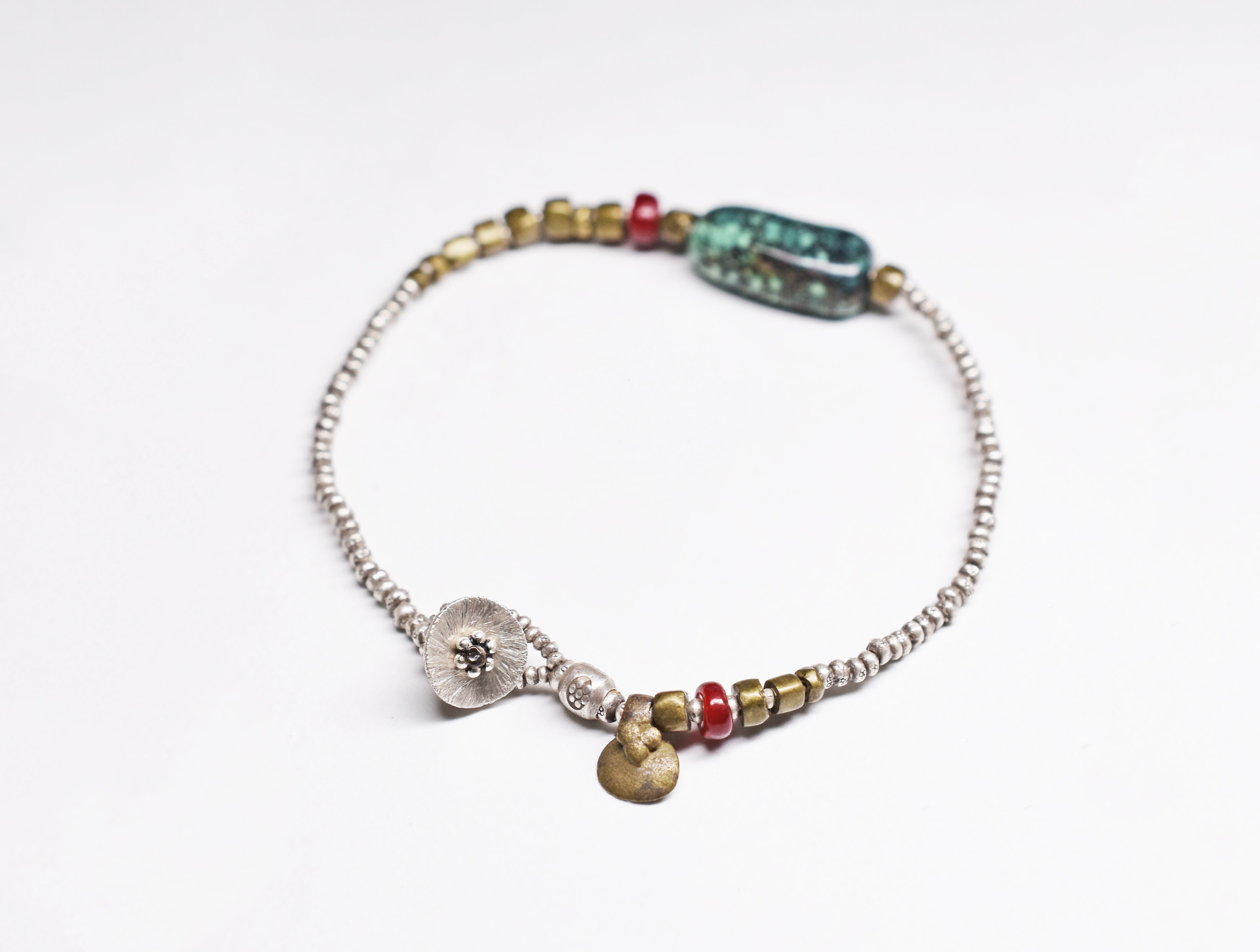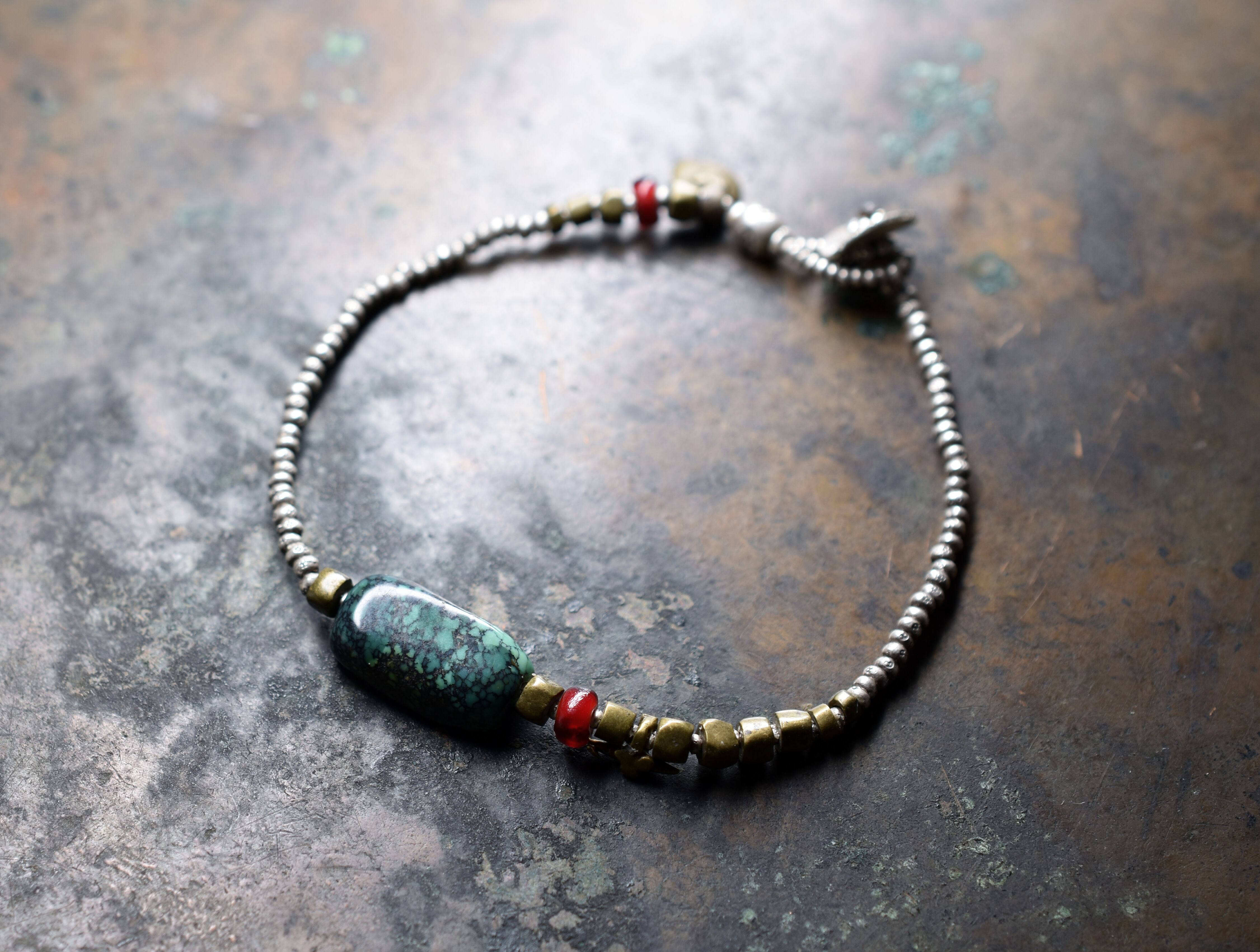 oldチベタンターコイズ、ホワイトハーツ、oldオリッサブラスを、小さなカレンシルバーで繋いだブレスです。